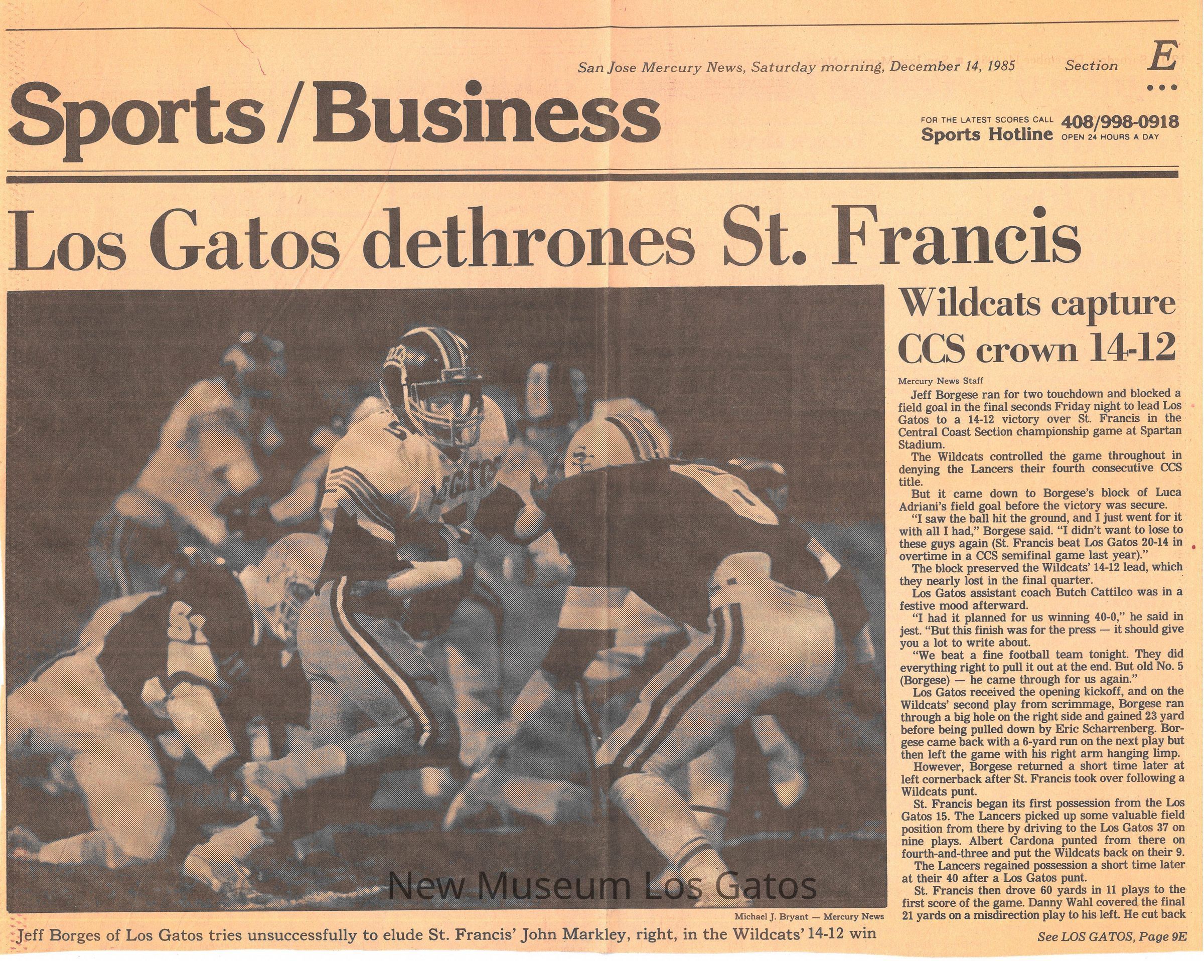 Two newspaper clippings, from the sports section of the San Jose Mercury News, about the LGHS football team winning CCS in 1985.Collection