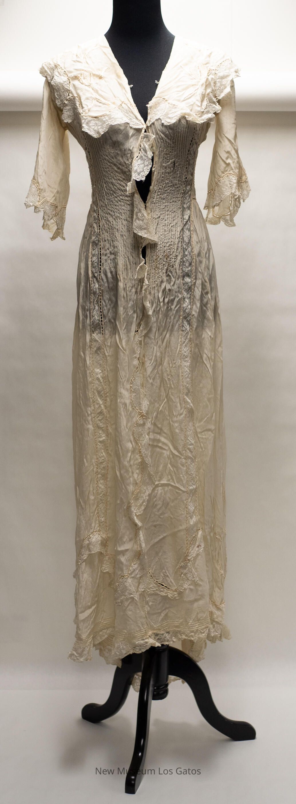 A long, ivory dress that opens down the center front, and closes with white iridescent buttons and silver hook-and-eye clasps. There is floral lace trim along the hem, along the bottom of the skirt, at the ends of the sleeves, and along the edge of the collar; there is also floral lace stripes inset into the front and back of the dress. There is ivory floral embroidery on the sleeves, the collar, and the bottom of the skirt, as well as ivory eyelet detailing framing the lace insets.Collection