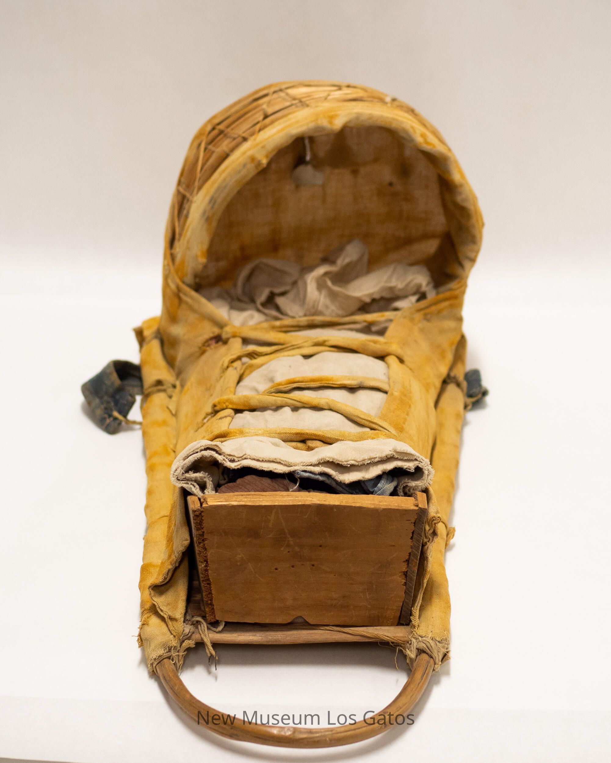 A wooden and cloth cradleboard. The back of the cradleboard is made from thin wooden slats, and there are curved wood handles at both the top and bottom. There is a footrest made out of wood, and a protective headpiece that is made out of curved sticks. The cradleboard is covered in a plain fabric, and there are fabric straps crisscrossing the cradle board cavity, which is stuffed with a variety of fabrics. There are two silver balls, two beaded fabric pieces, and a shell hanging from the upper back of the headpiece. There is also a denim strap across the back of the cradleboard.Collection