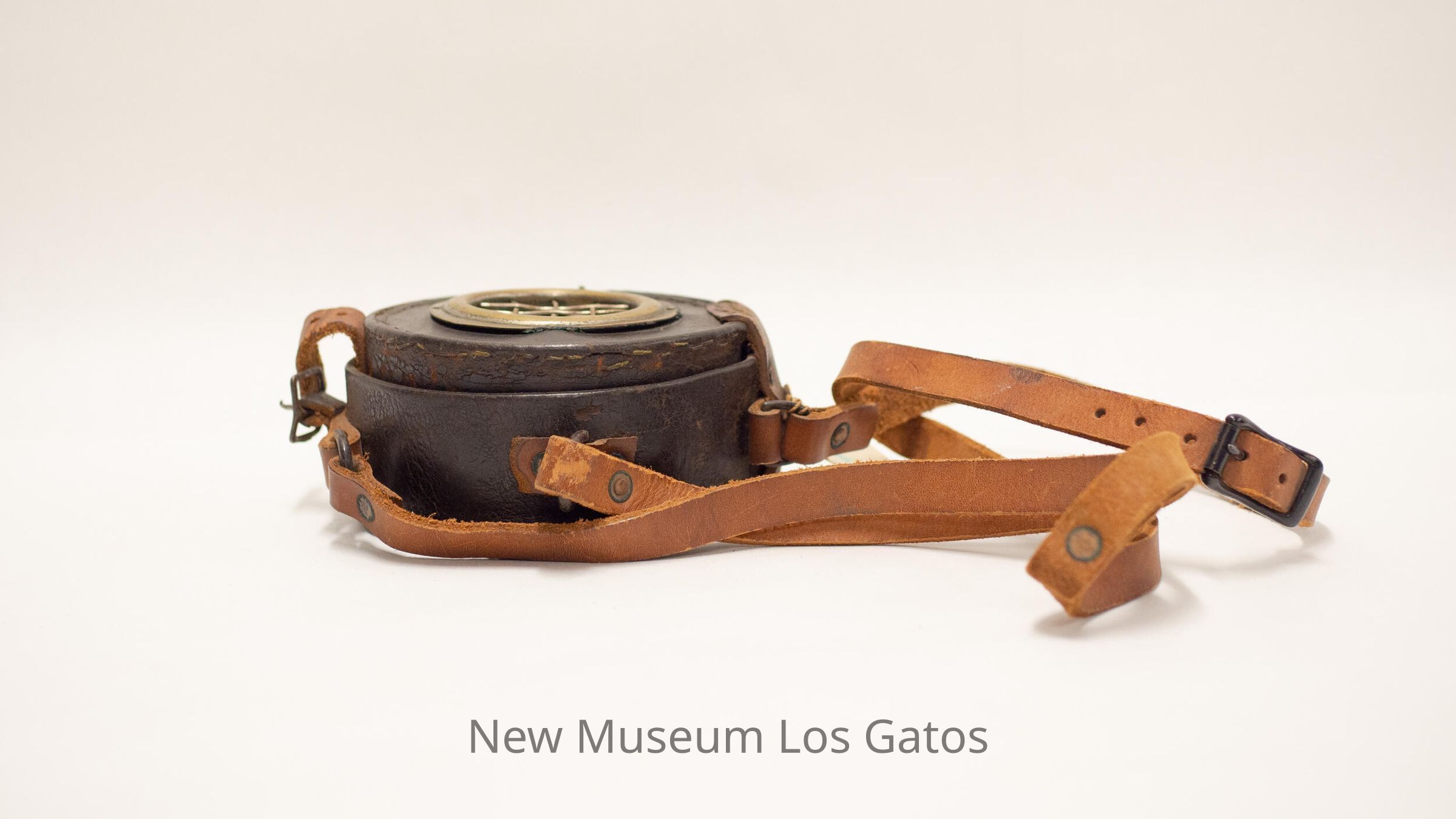 Large, circular leather clock with a gold, metal grate on top and the clock face underneath the grate. There are thin leather straps attached to the clock.Collection