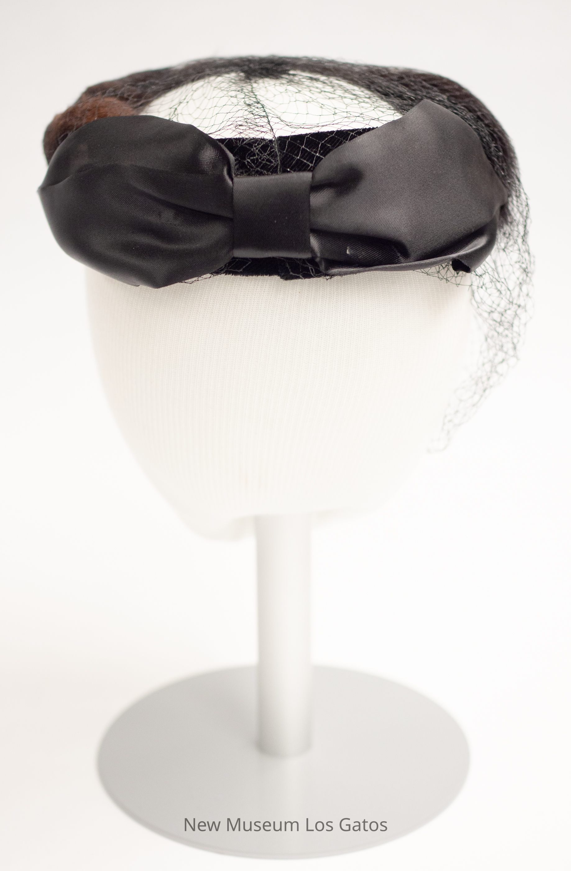 A black velvet open crown hat with a fishnet veil. There is also decorative fur along half of the hat's rim, and a large satin bow in the back.Collection