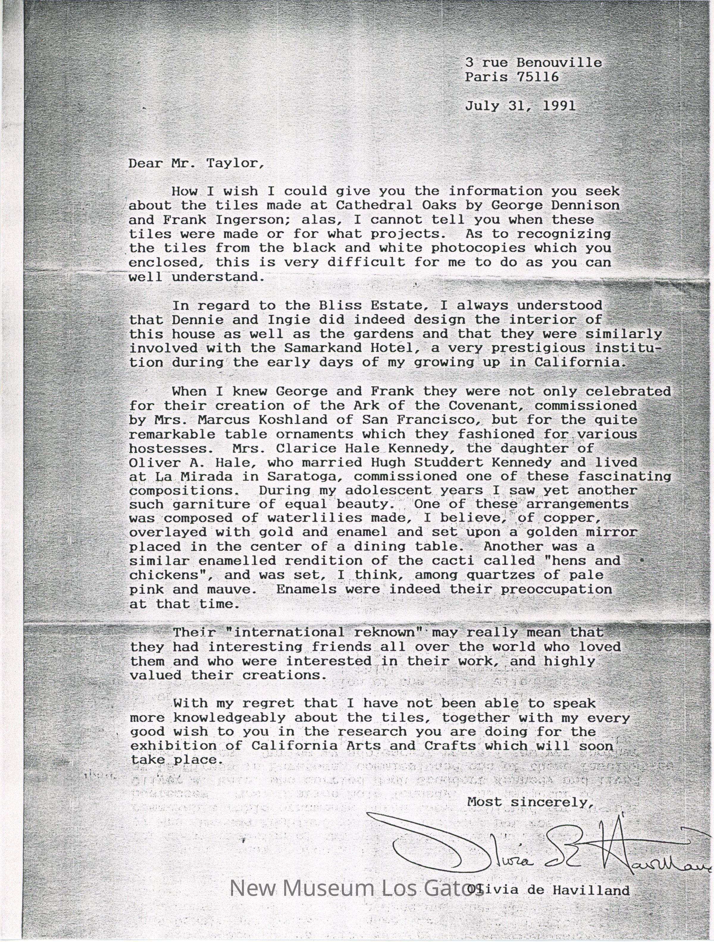 How I wish I could give you the information you seek about the tiles made at Cathedral Oaks by George Dennison and Frank Ingerson; alas, I cannot tell you when these tiles were made or for what projects. As to recognizing the tiles from the black and white photocopies which you enclosed, this is very difficult for me to do as you can well understand.