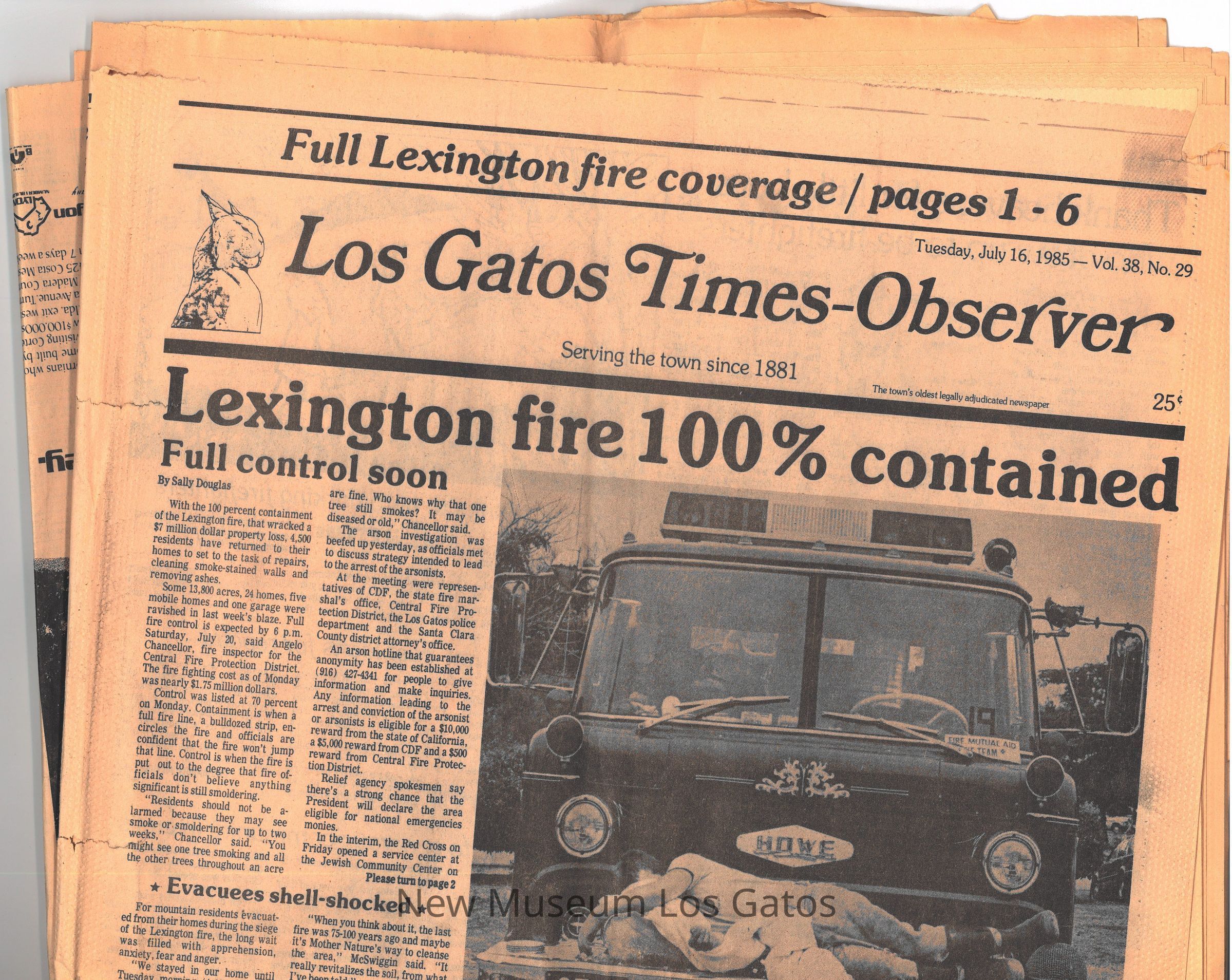 Newspaper volume of the Los Gatos Times-Observer from July 16th, 1985. The cover story describes the end of a fire near Lexington Reservoir. The newspaper consists of 20 pages with multiple pages of ads and classifieds.Collection