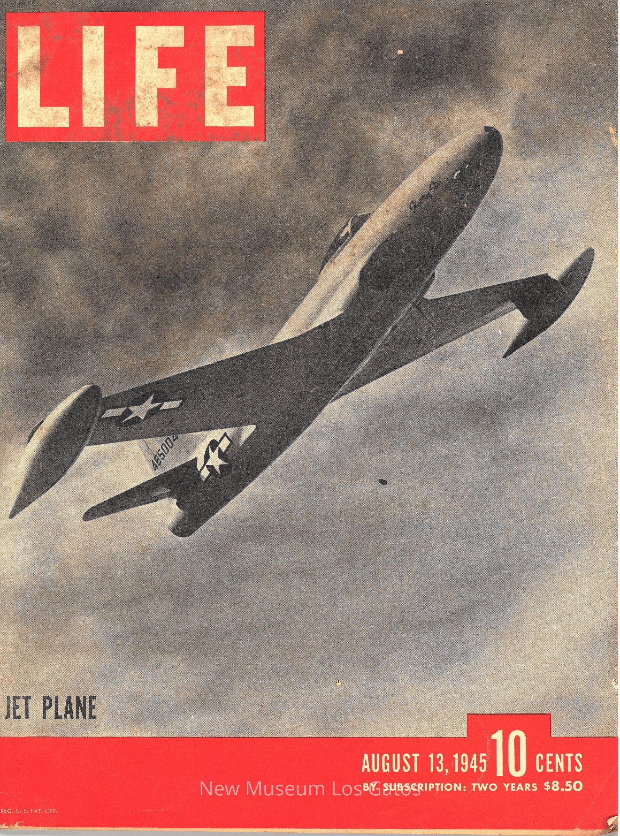 The August 13, 1945 edition of LIFE Magazine. The front cover features a black and white photograph of the bottom of an airborne jet plane.Collection