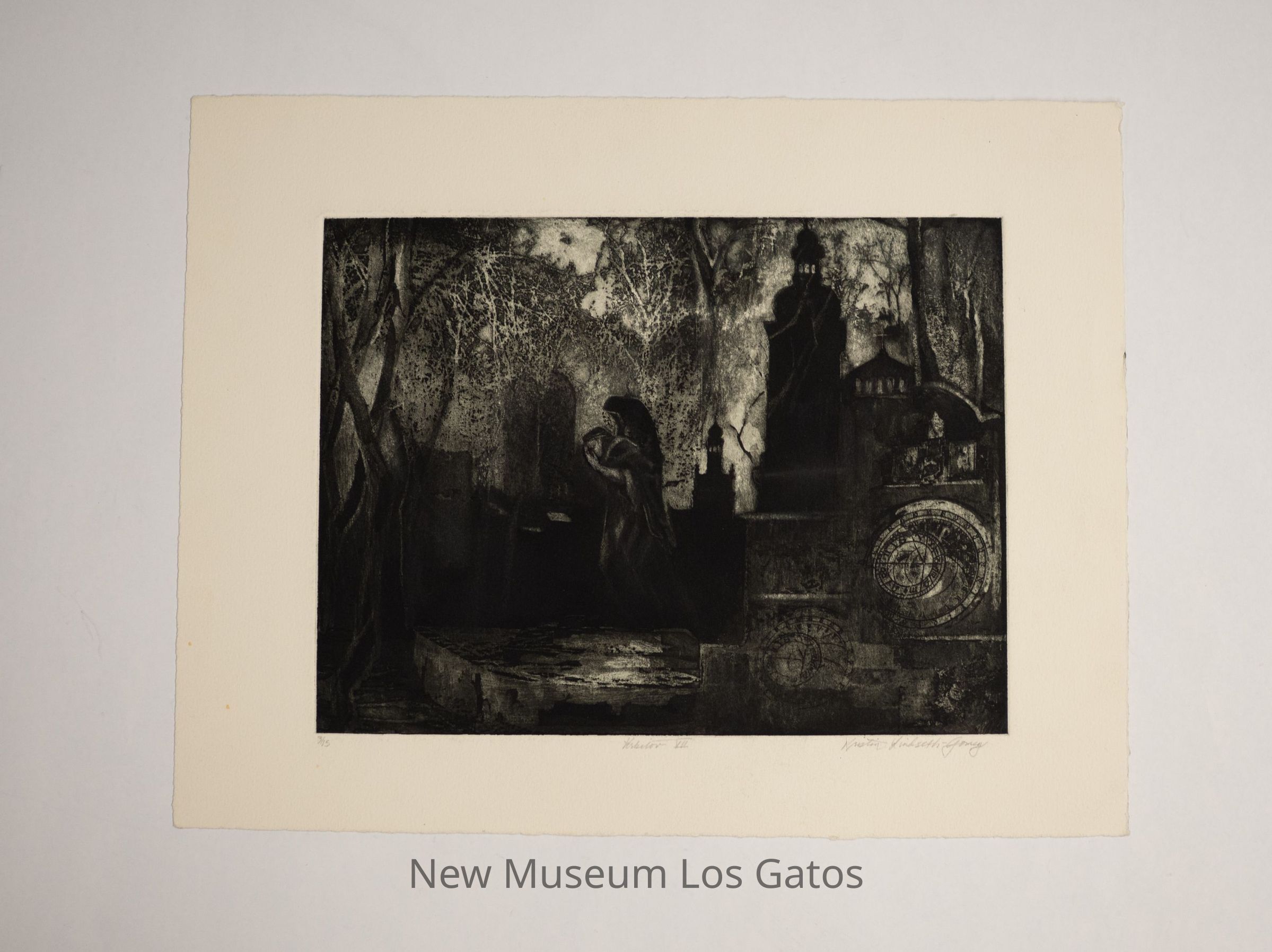 An intaglio; etching softground and aquatint print depicting people in a cemetery. There are the silhouettes of buildings and clock faces in the right of the image, with people standing with their heads bowed in the center, and gravestones and trees in the left.Type of Print