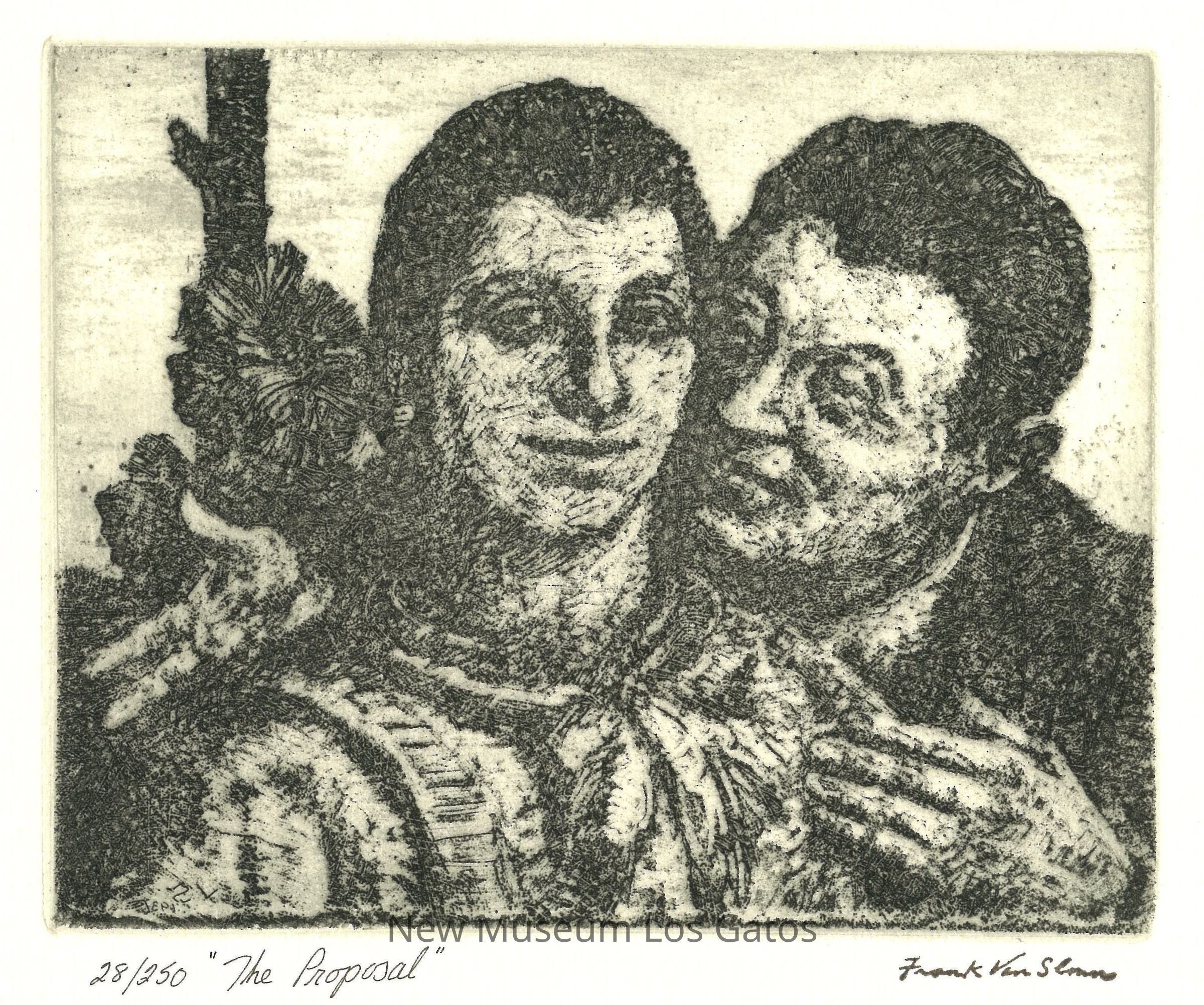 A monochrome print portrait of a man and a woman. The print is hinge mounted onto a mat board.