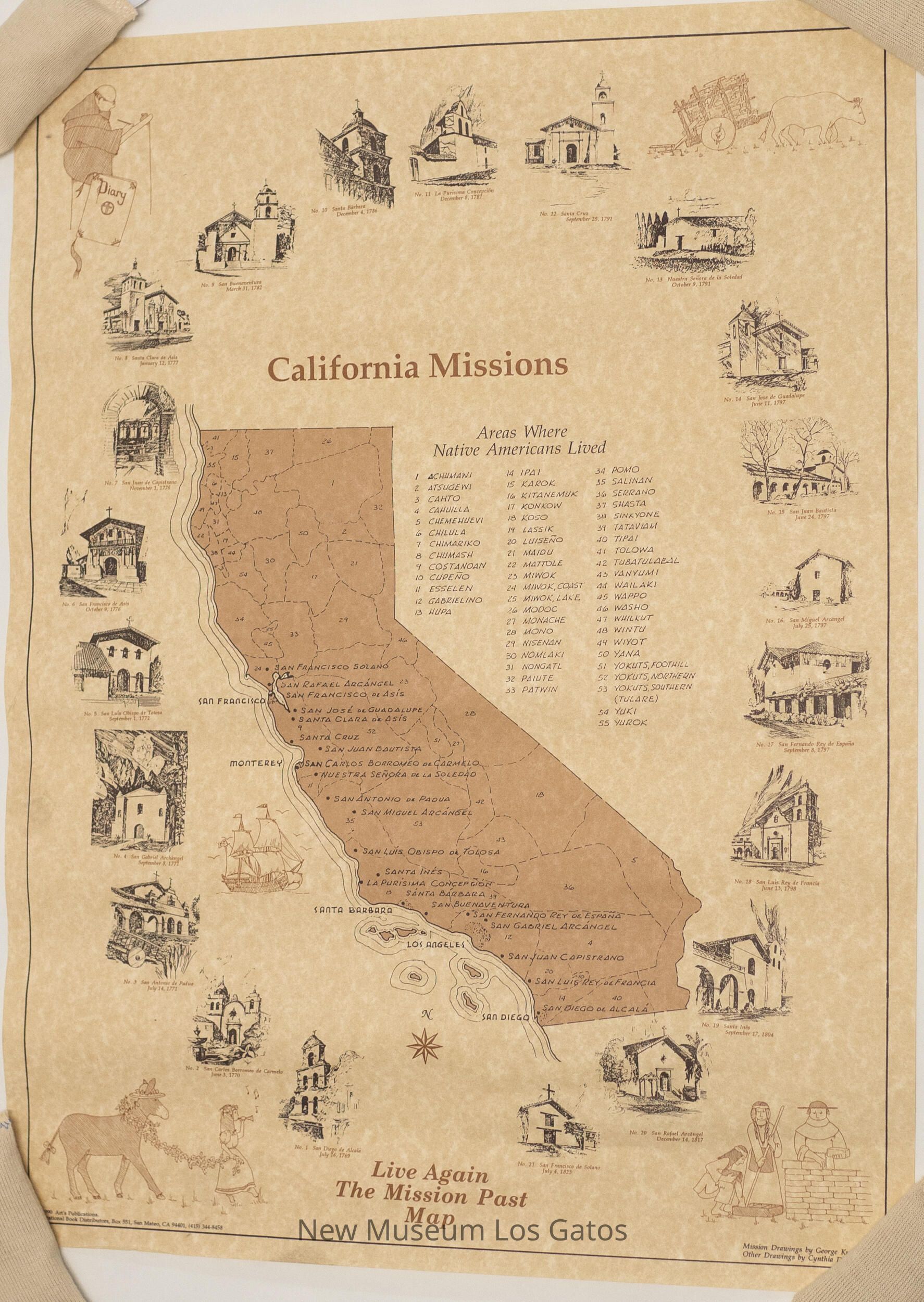 A map of California depicting the geographical locations of ancestral Native lands, and where each mission is located within those lands. The map is accompanied by illustrations of each mission, and their founding dates.Collection