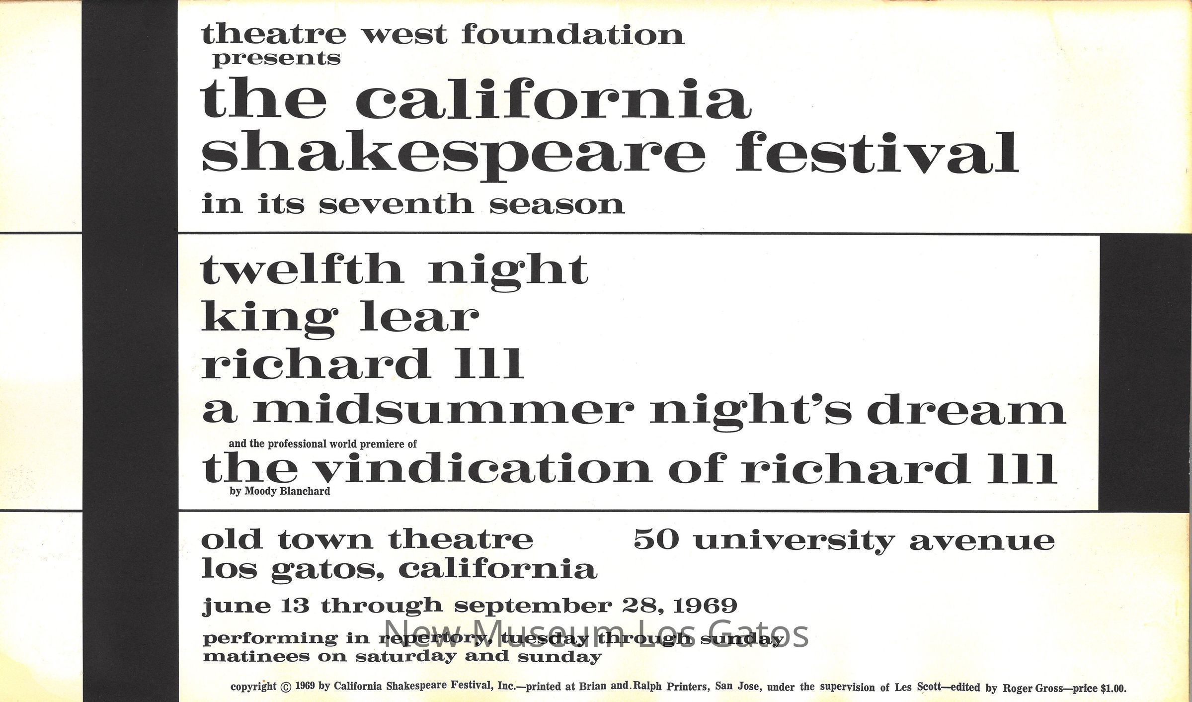 A souvenir program for the California Shakespeare Festival's 1969 season. The cover of the program features a black and white photograph of David Stiers as King Lear, with red text overlaid.