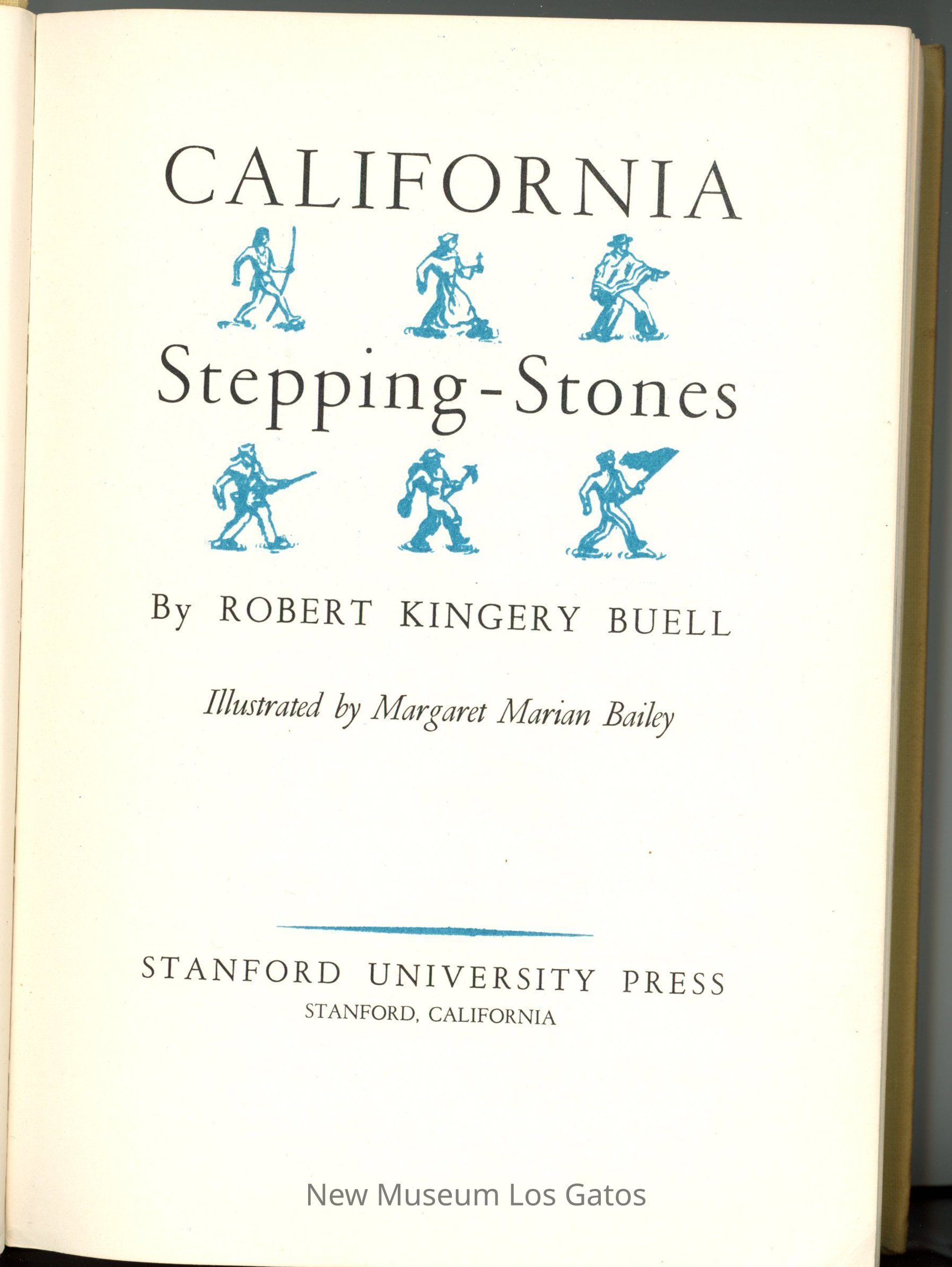 A tan, fabric-bound book with red illustrated people walking in a pattern near the bottom of the covers, featuring stories about the history of California appropriate for young readers.Collection