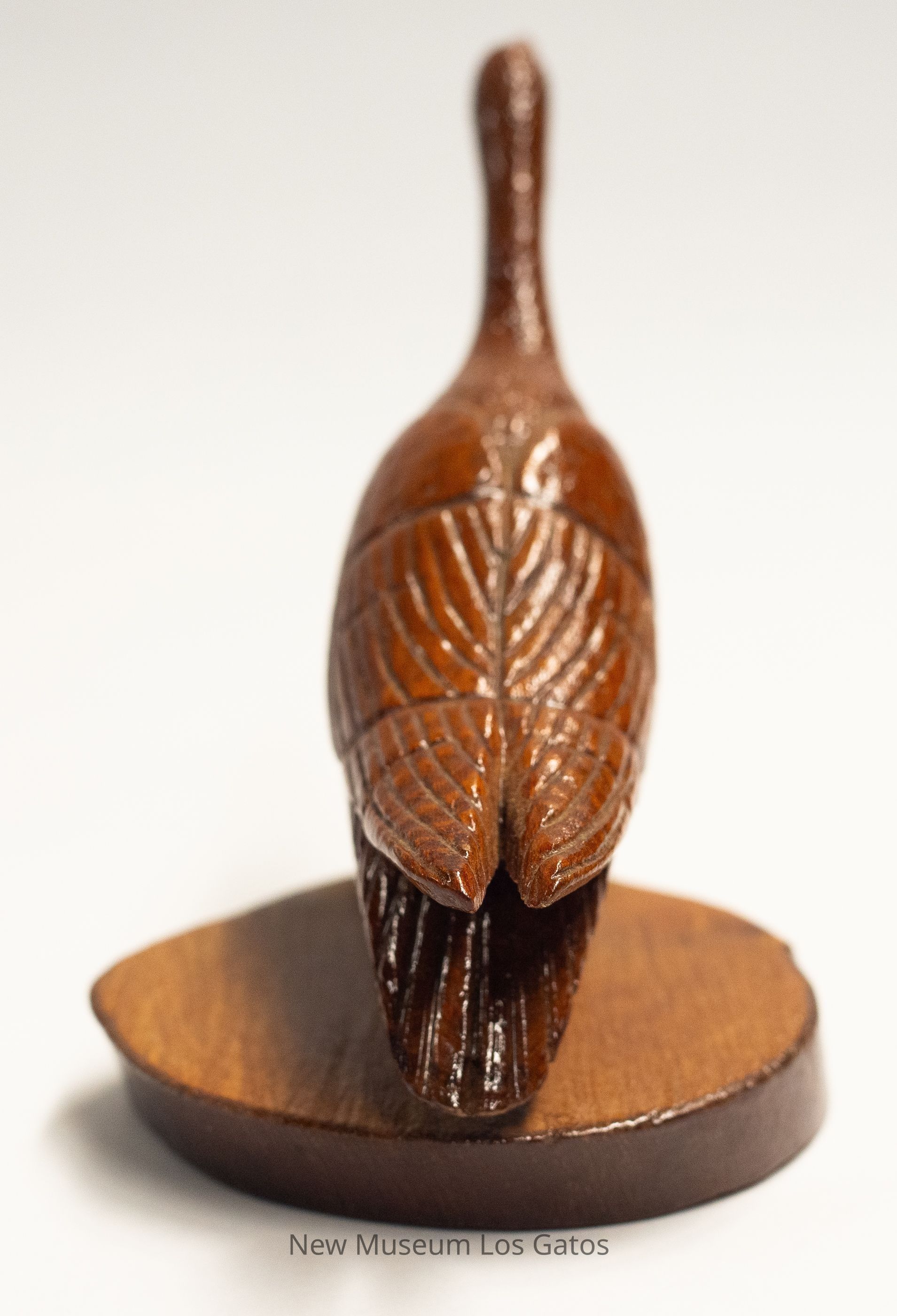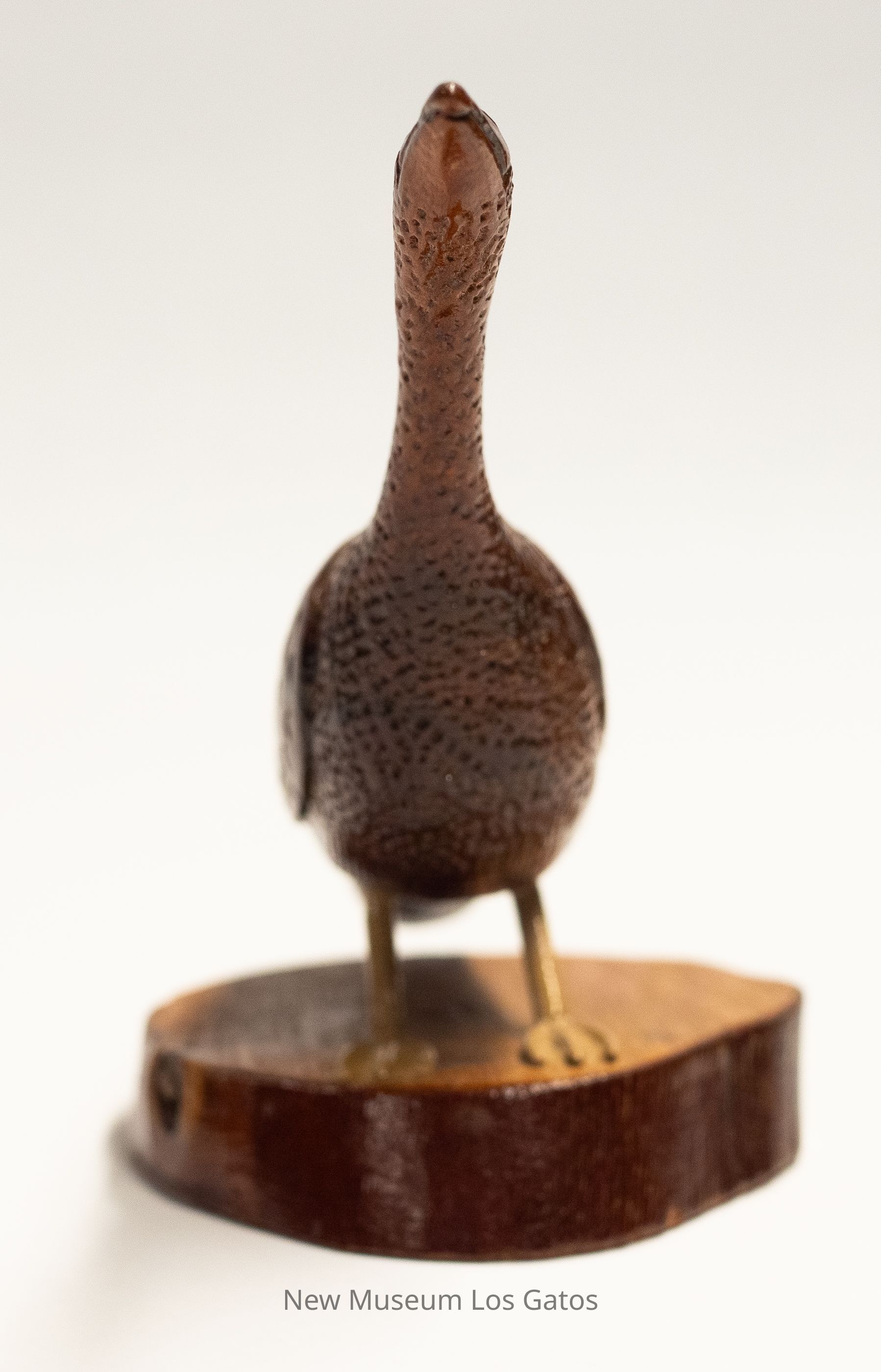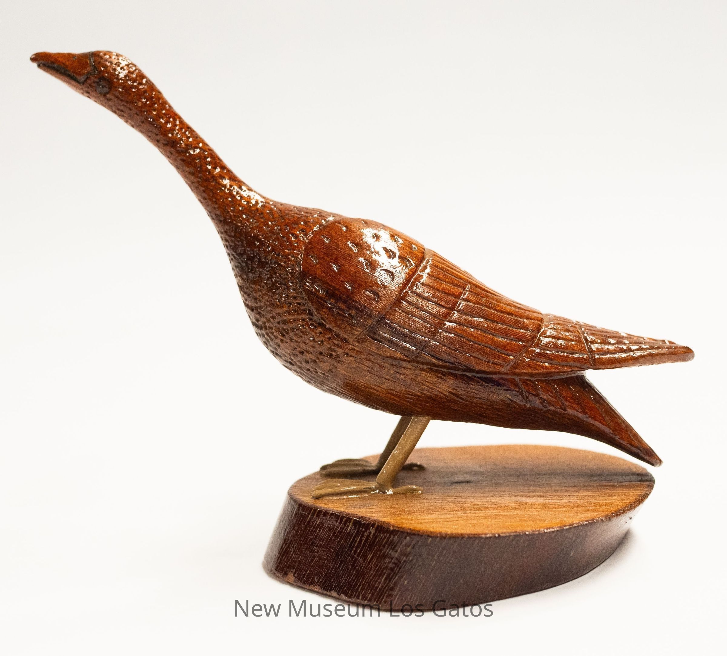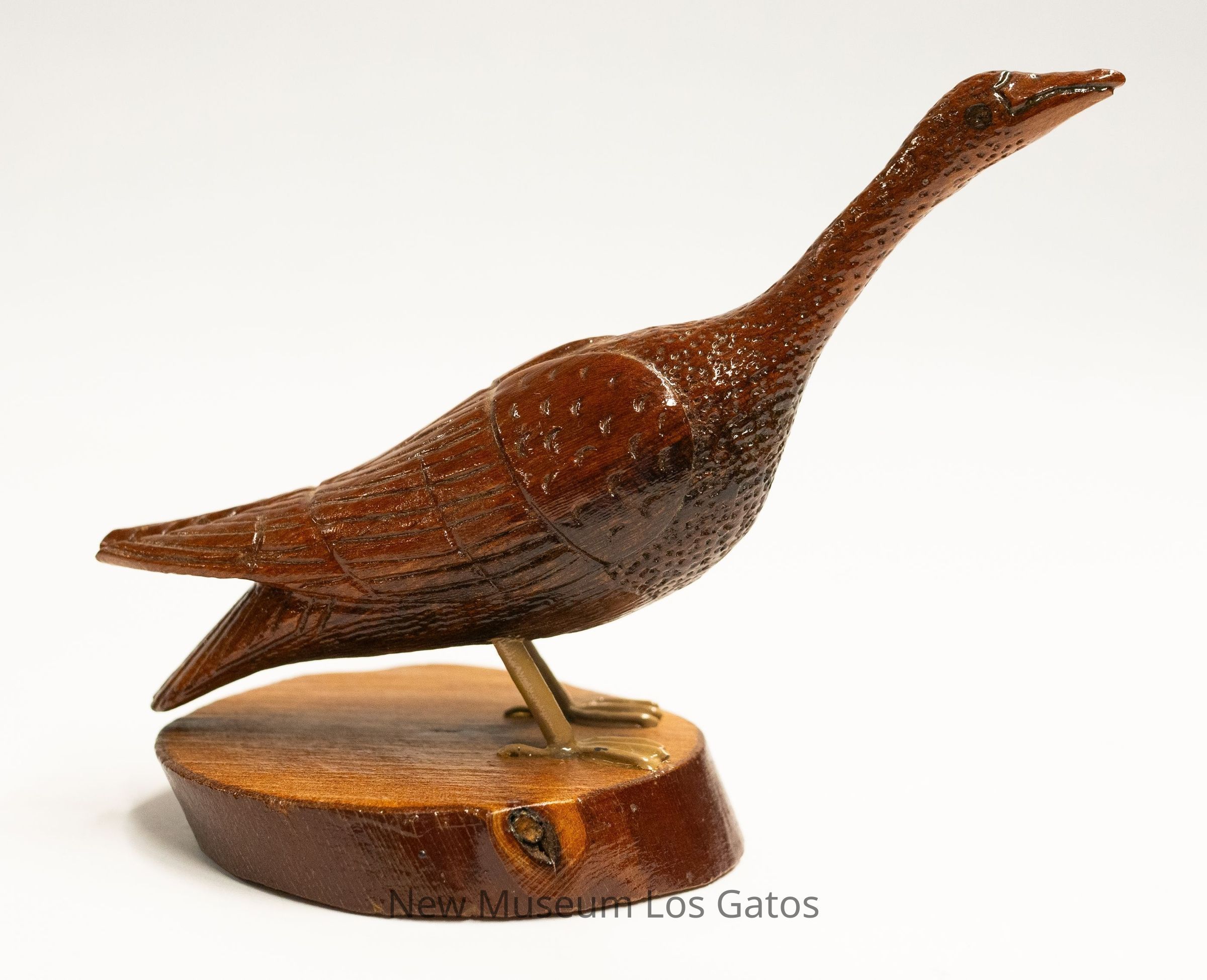 A reddish brown hand-carved wooden sculpture of a Canada goose, with dull yellow legs, on a circular base that is light brown with dark brown trim. The bird's neck and head are angled upward, with a closed beak.Type of Sculpture