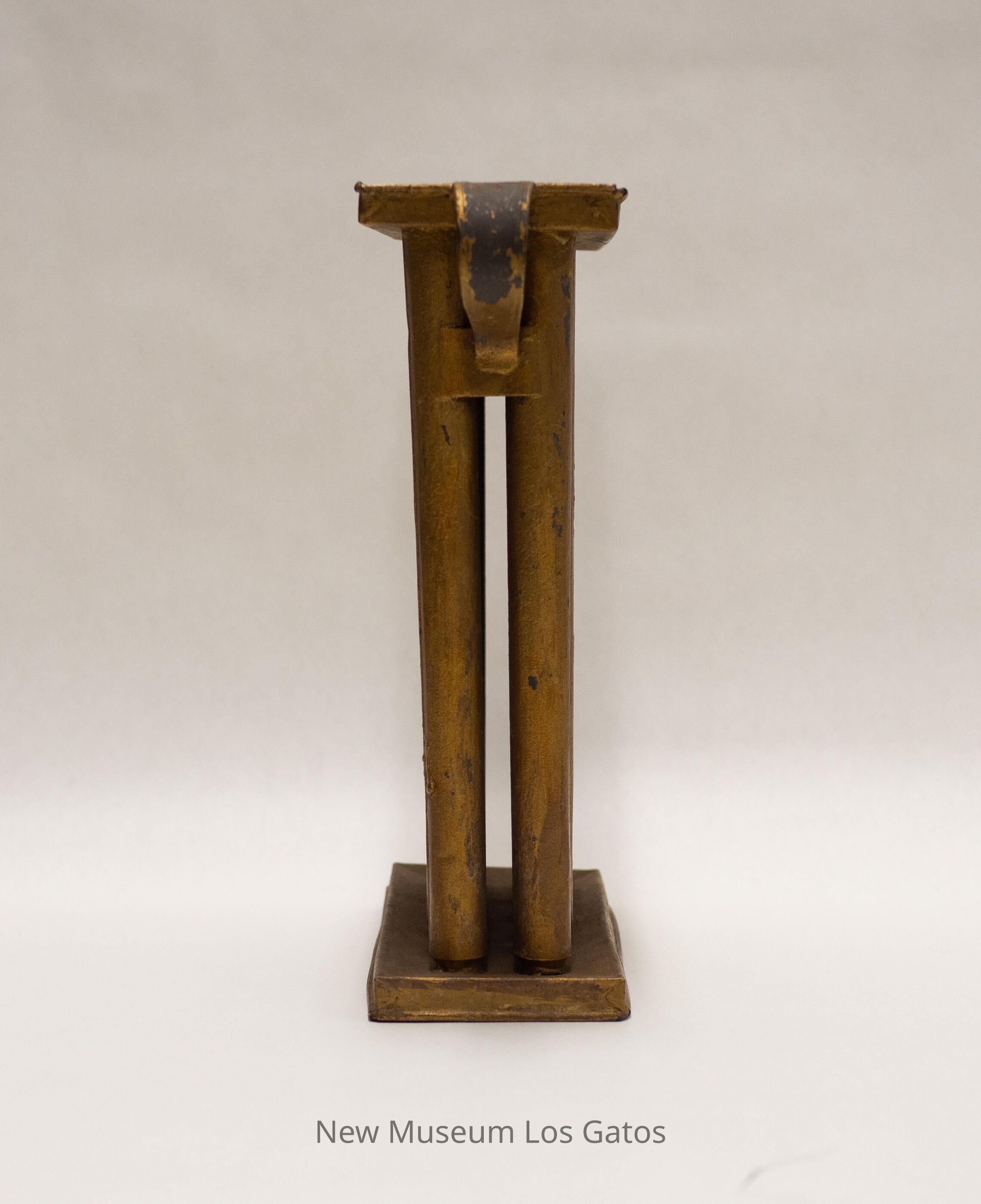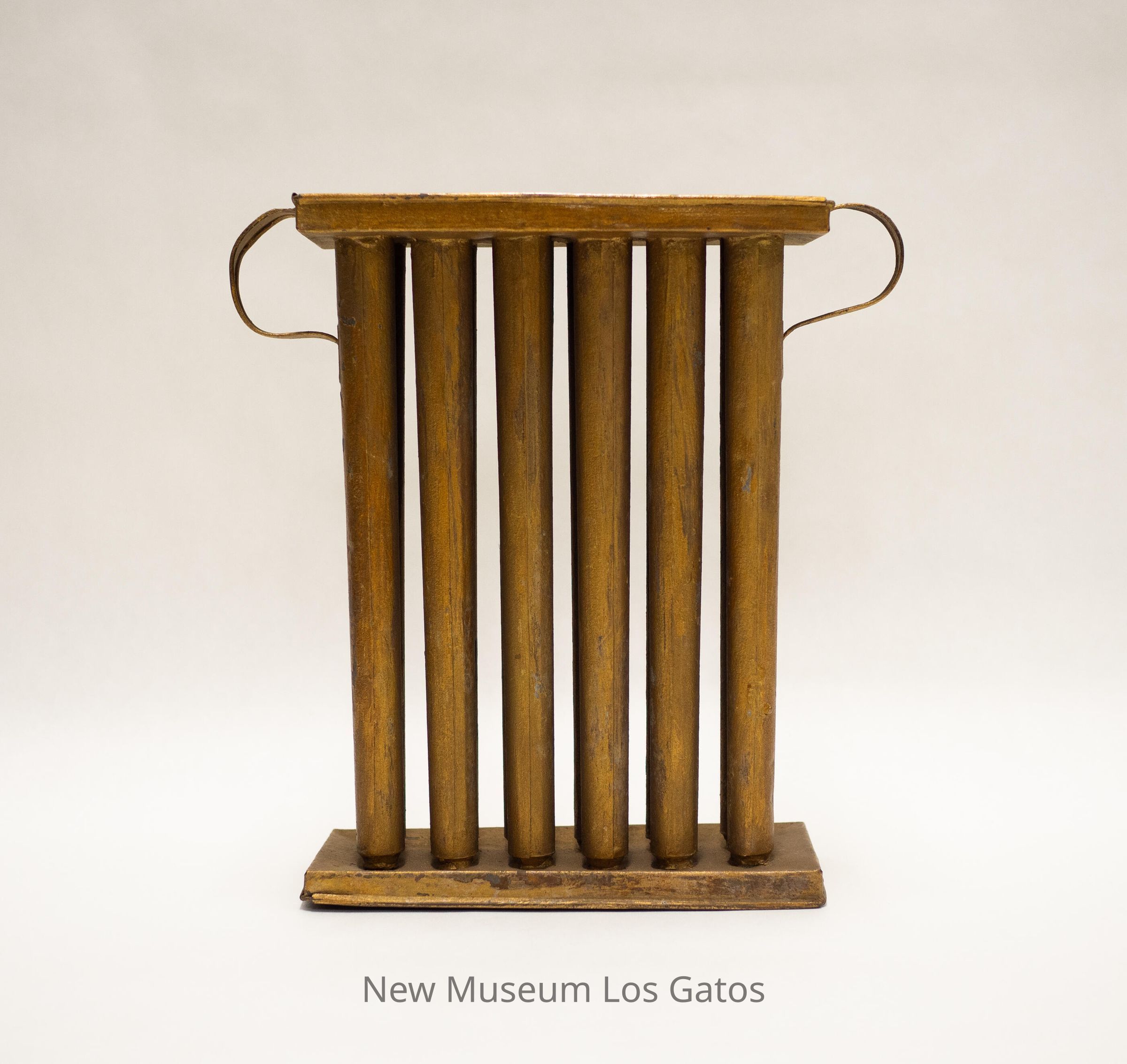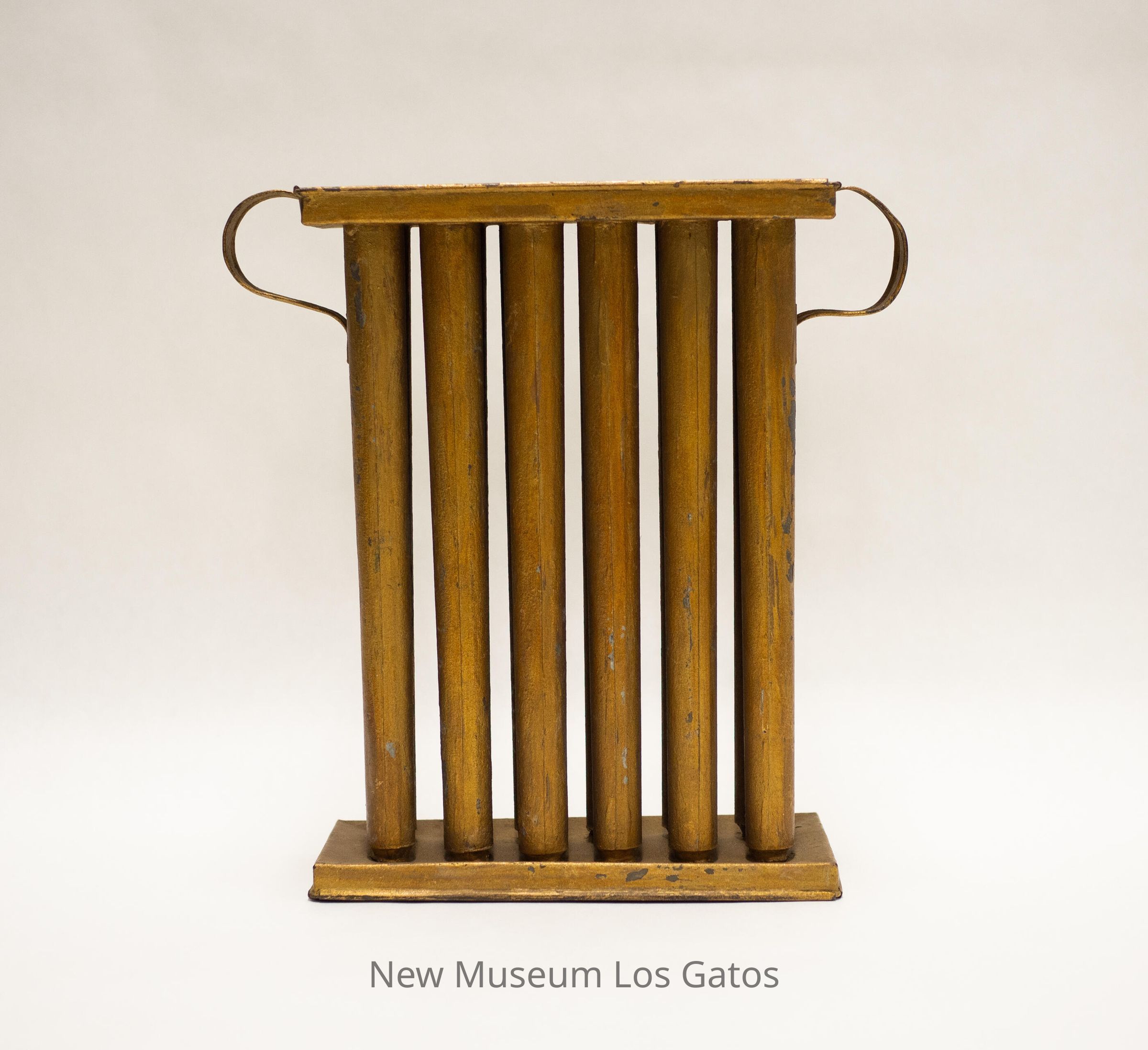 A gold-painted metal tool, with rectangular pieces at the top and bottom. The rectangles are attached by twelve tall, hollow cylinders that taper to a point towards the bottom. There are two curved handles, one on each side, attaching the top rectangle to the outer cylinders.Collection