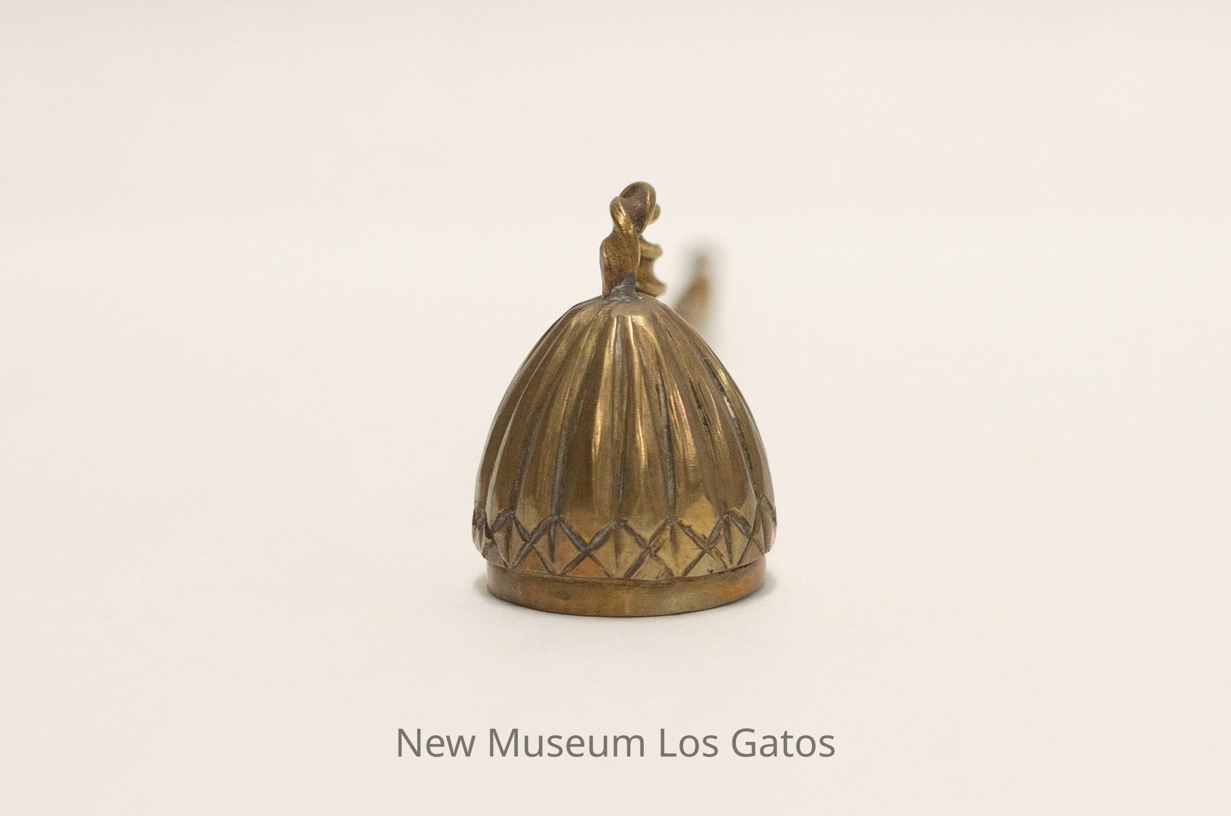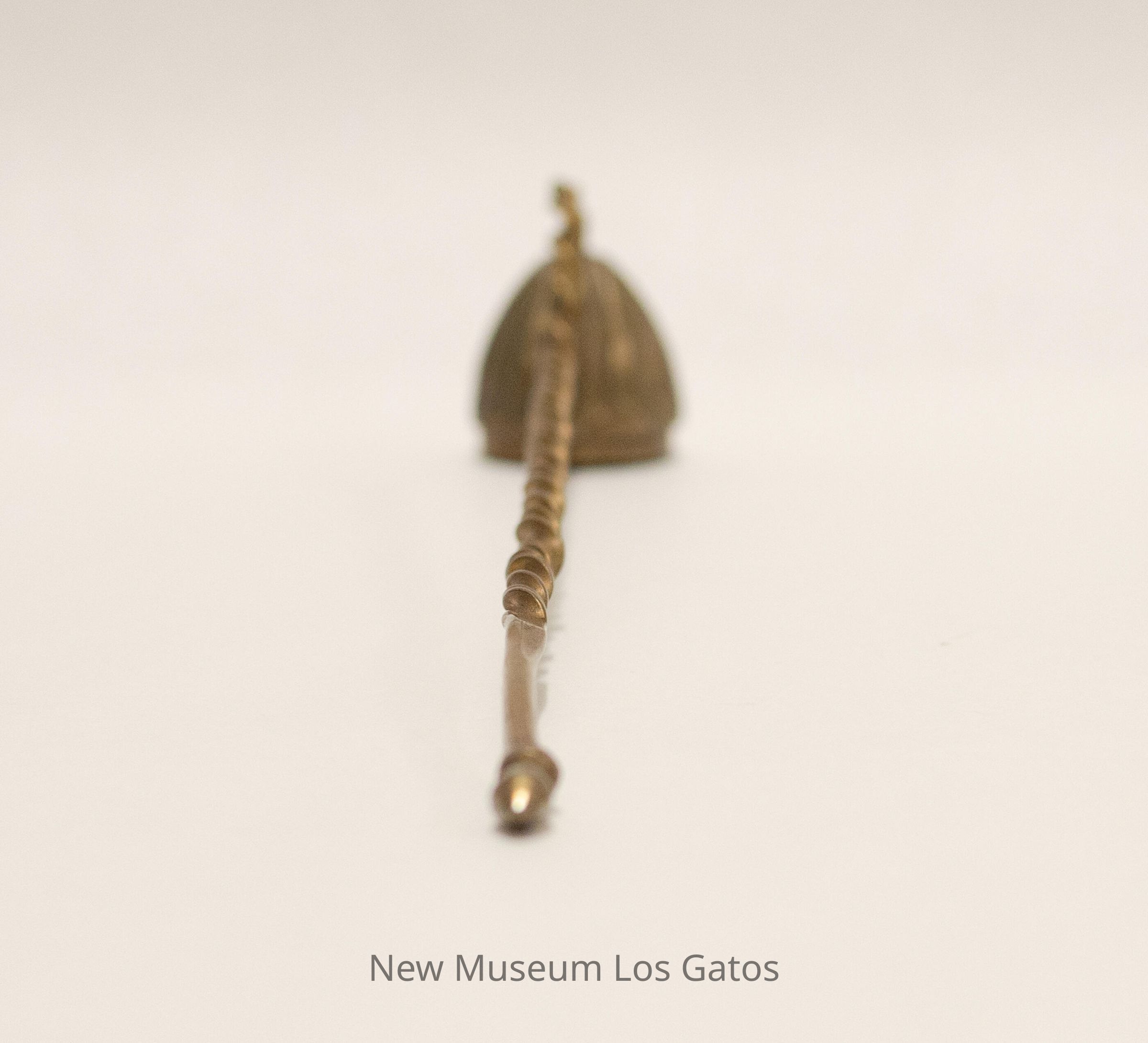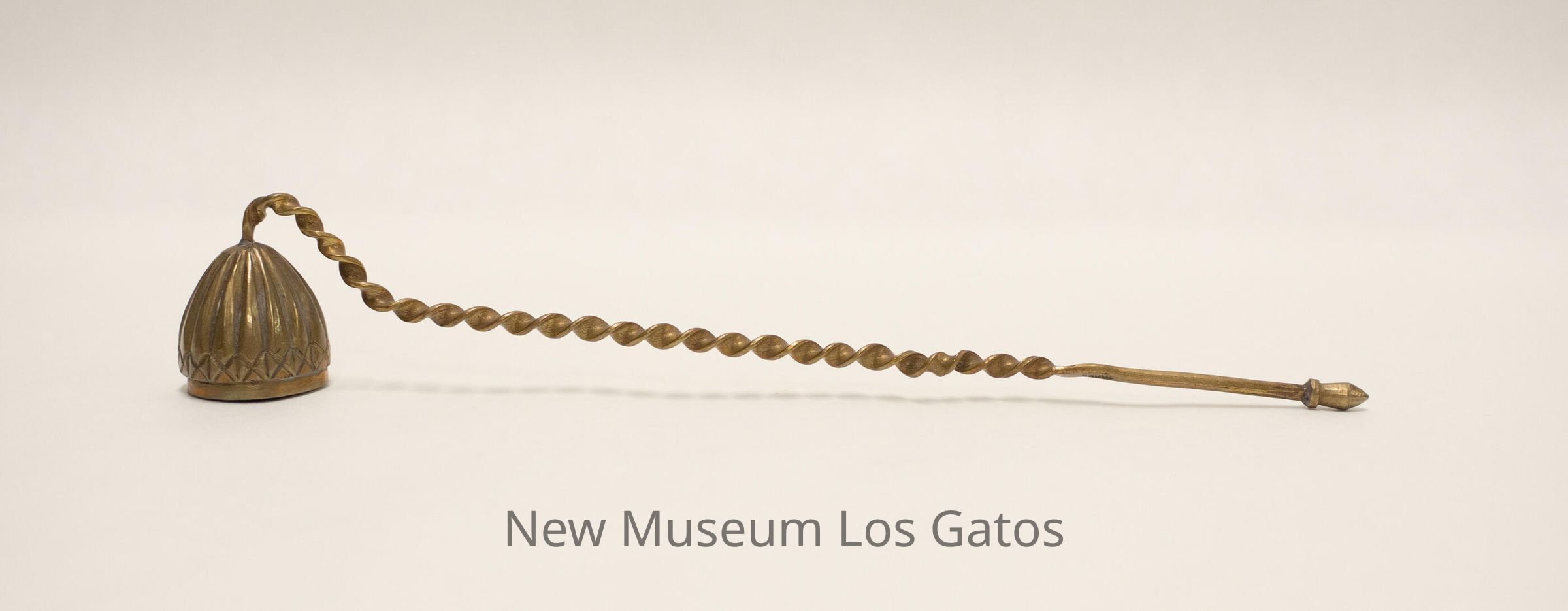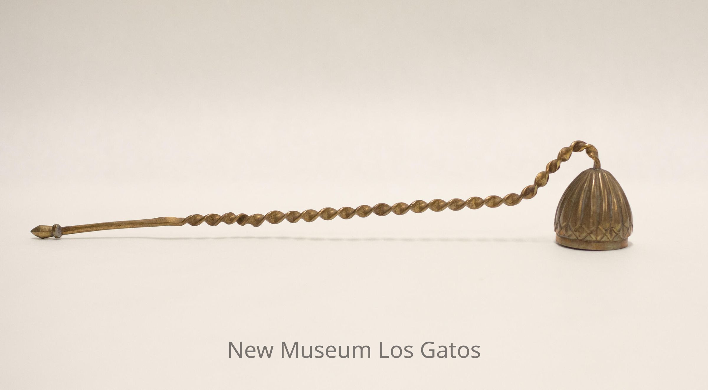 A bronze candle snuffer, consisting of a cone attached to a long handle. The cone is decorated with vertical grooves that end in etched diamond patterns along the rim. The handle itself is curled metal, and ends in a pointed topper.Collection