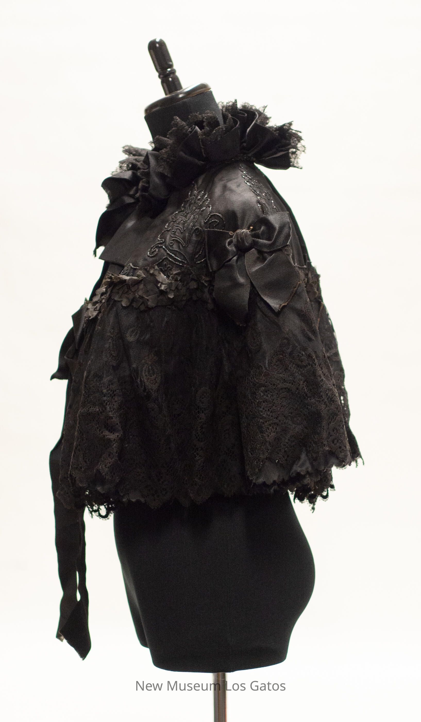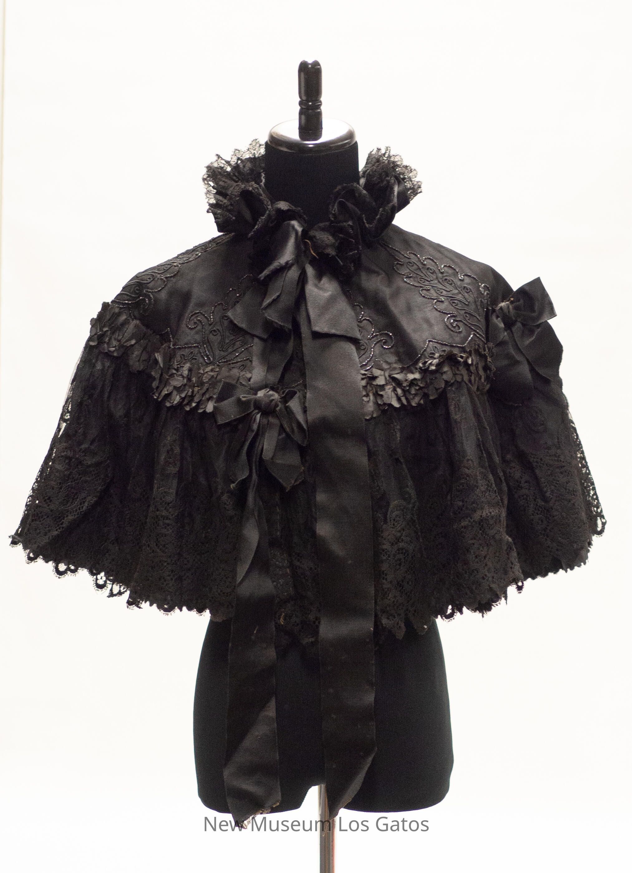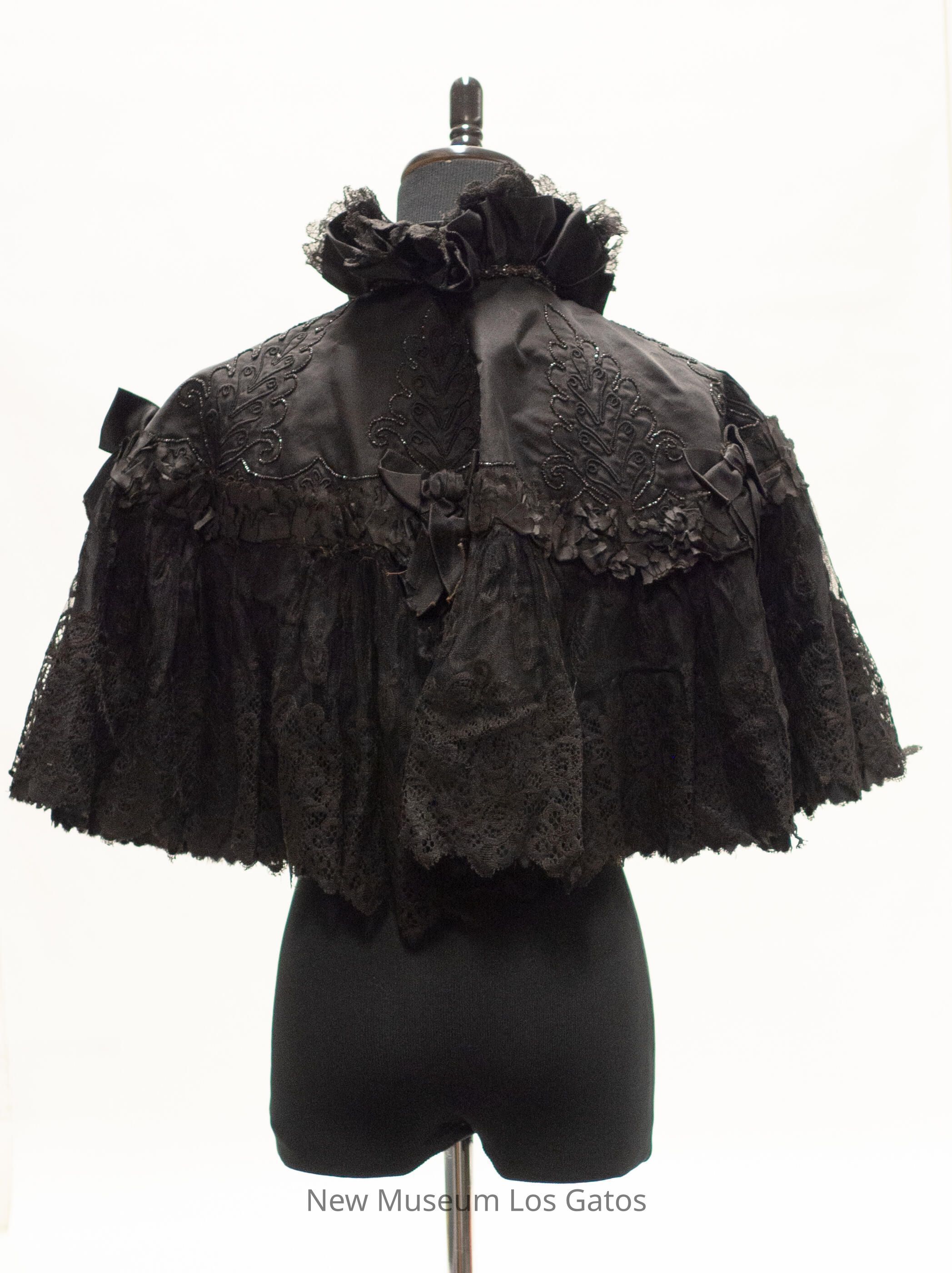 A black, satin cape. There is a line of black ruffles running horizontally through the middle of the cape, with three black bows. Below the ruffles is a layer of black lace, and above the ruffles is a decorative beaded pattern in the shape of leaves. The cape secures at the neck with two hook-and-eye clasps; there is also a black ribbon bow at the neck. The interior of the cape is plain black satin.Collection