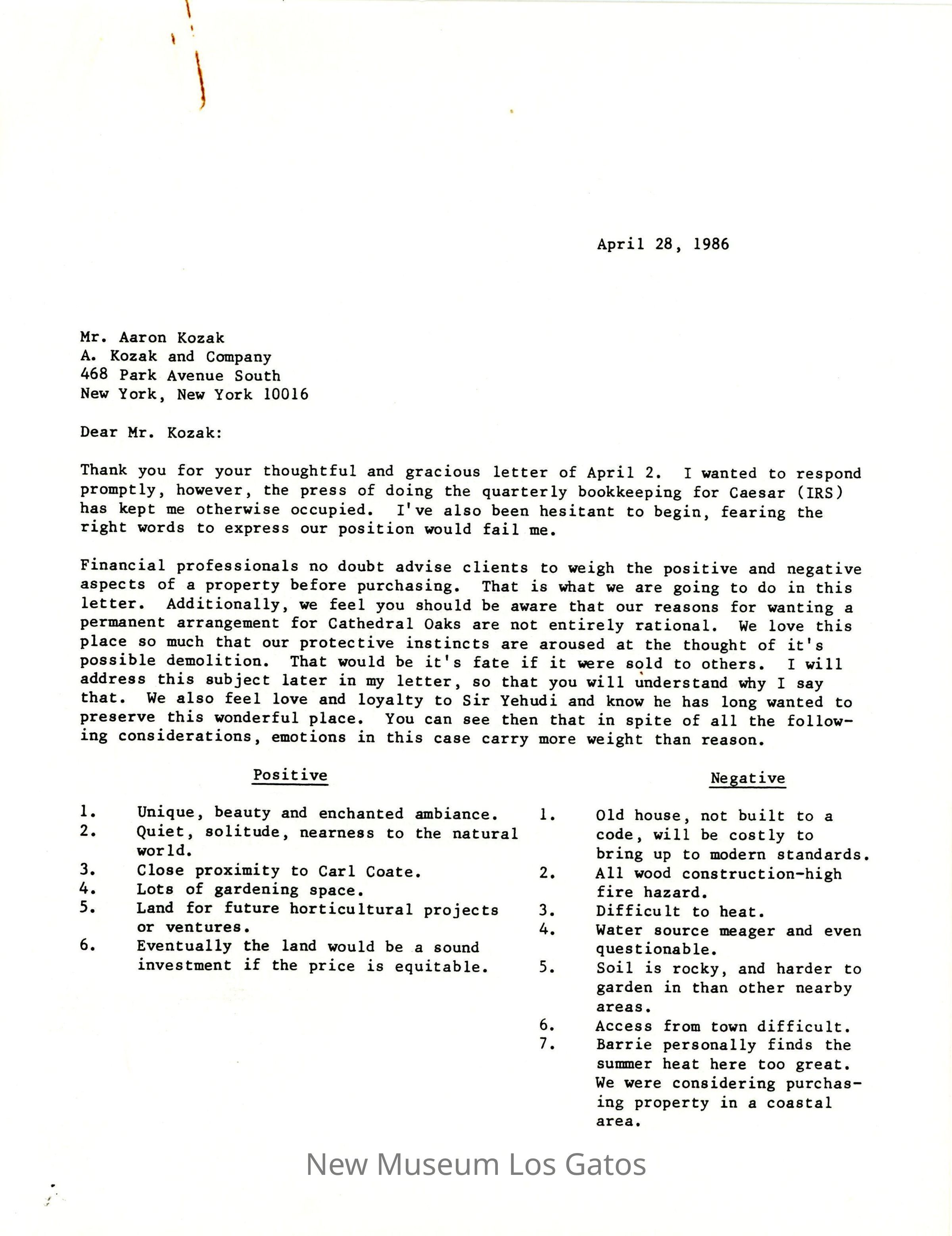 A six page letter, from Carol and Barrie Coate to Aaron Kozak, regarding the advantages and disadvantages of the Cathedral Oaks property. The letter is dated April 28th 1986.Subject Place
