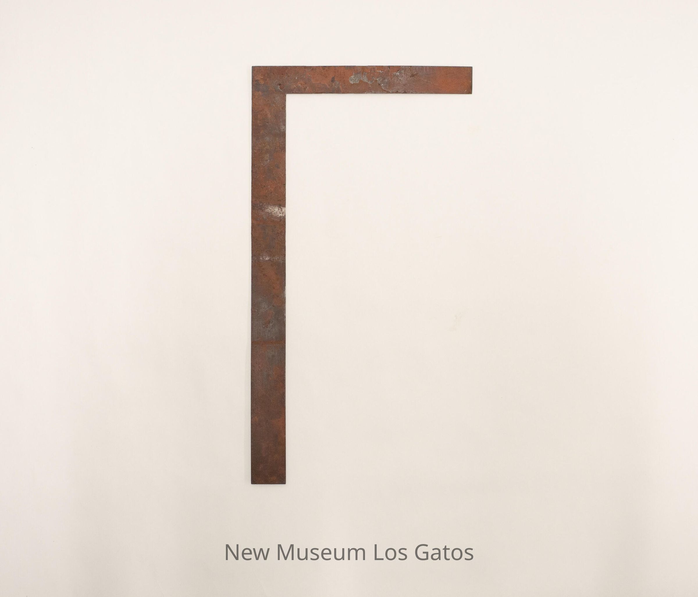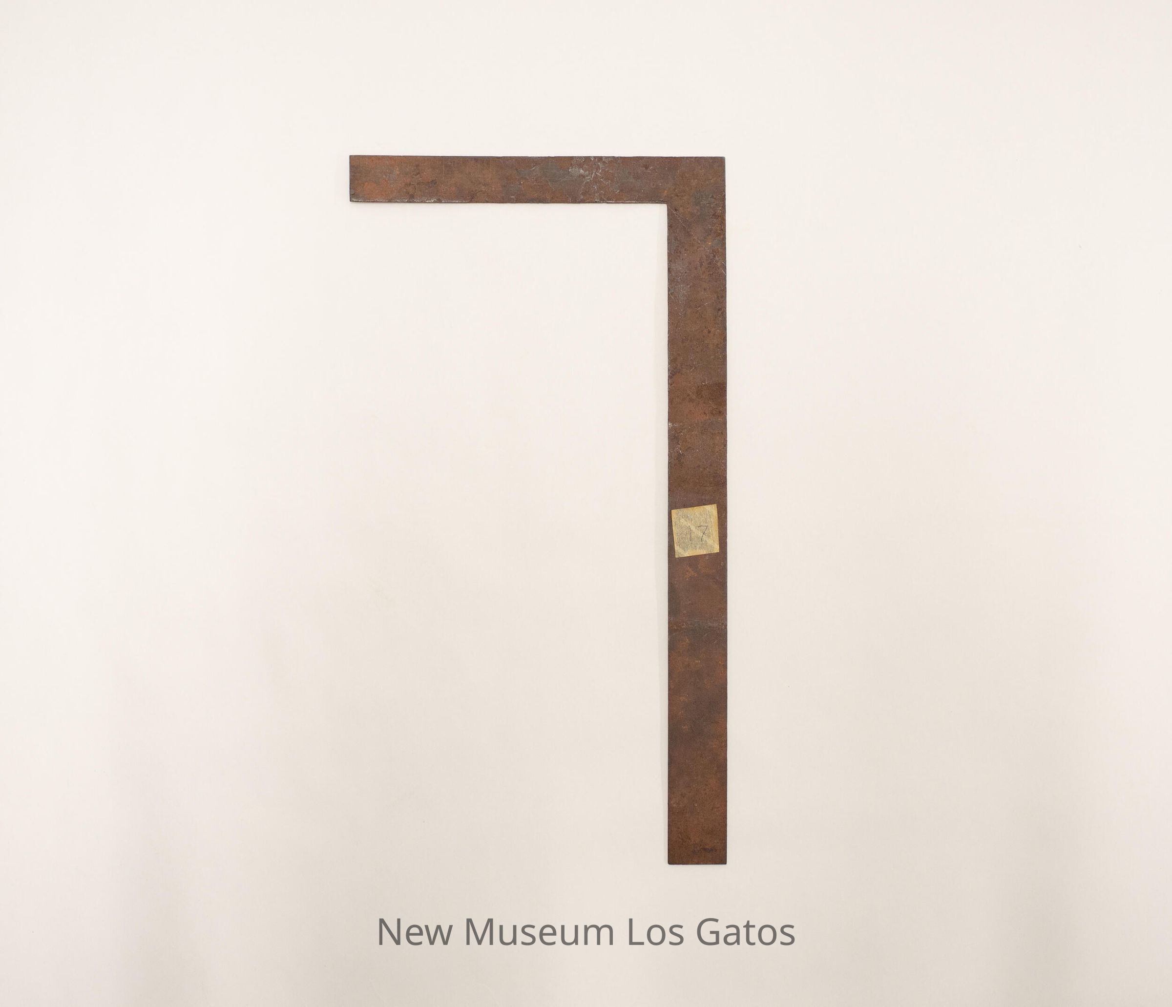 An L-shaped ruler, with one side having the measurements for 8 inches, and the other side having the measurements for 15 inches. There is a piece of old tape on one side with "17" written on it.Collection