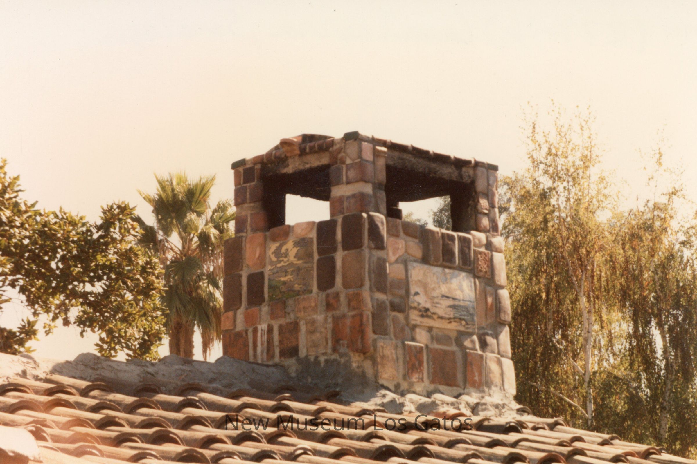 A color photograph of the chimney at Casa Tierra, featuring art tiles in the center of the brickwork.