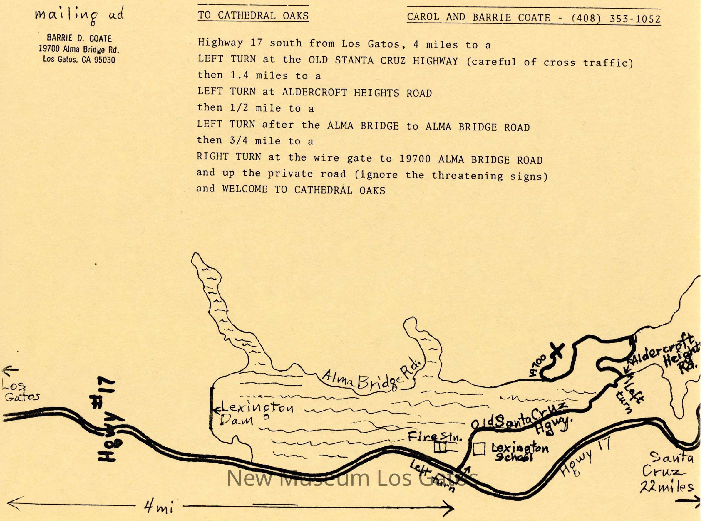 Copy of directions and map on how to get to Cathedral Oaks. There are typed directions on the upper half of the paper. There is what appears to be a hand-drawn map on the bottom half of the paper. Carol and Barrie Coate's names, mailing address, and phone number are on the top of the paper.Collection