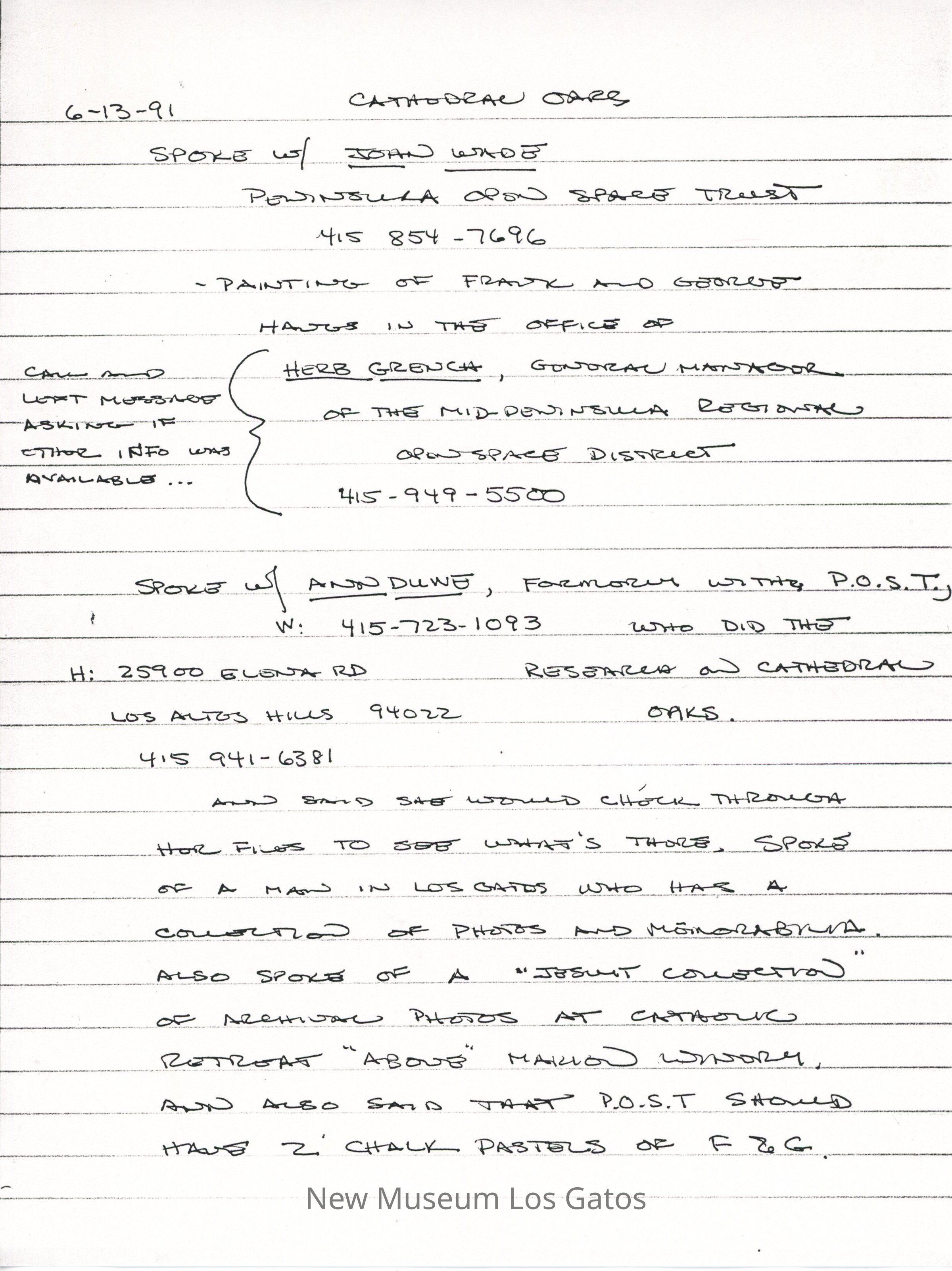 Black and white photocopy of notes written about Cathedral Oaks, including names, phone numbers, and information collected from persons listed.Collection