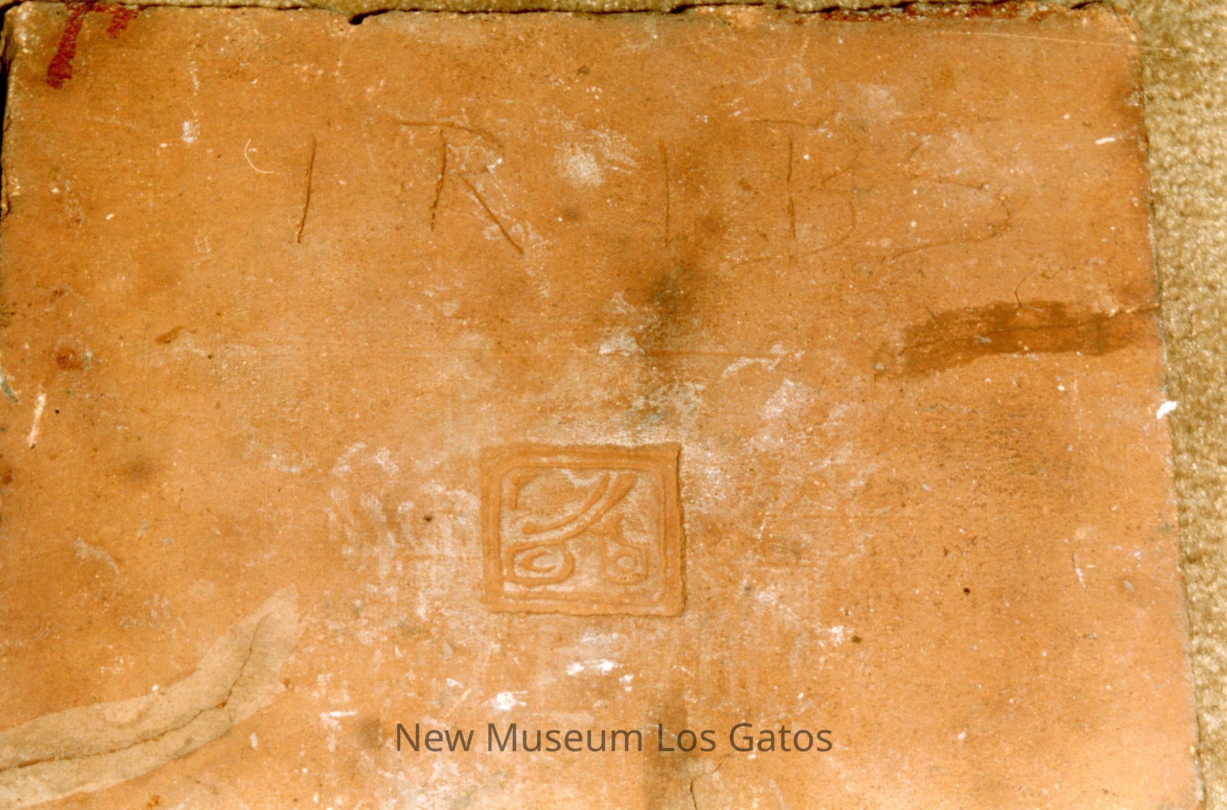A color photograph featuring the back of a Cathedral Oaks tile. The clay is red/terracotta, with a stamp in the center and 'IR IBS' carved near the top.