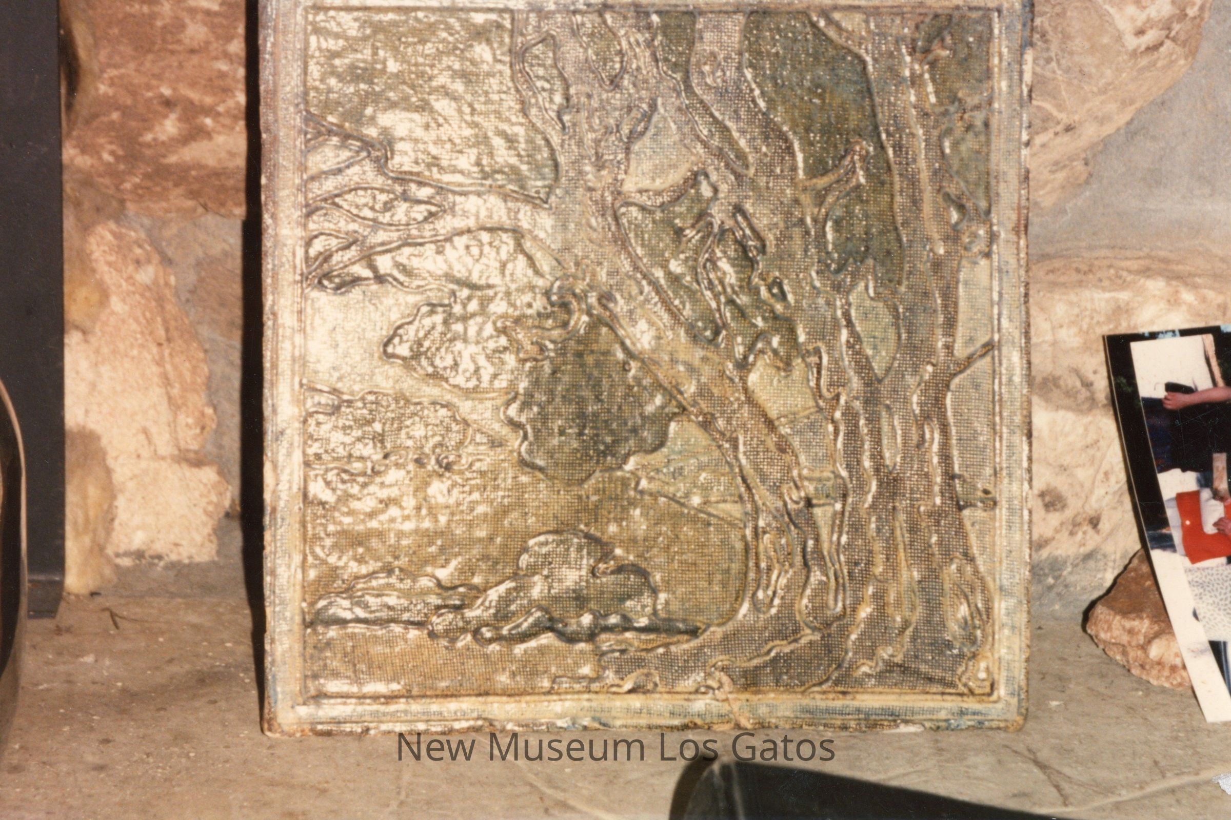 A color photograph featuring a decorative tile, propped up against a stone background with photographs partially visible along the right edge of the image. The tile itself features a tree and hill design.
