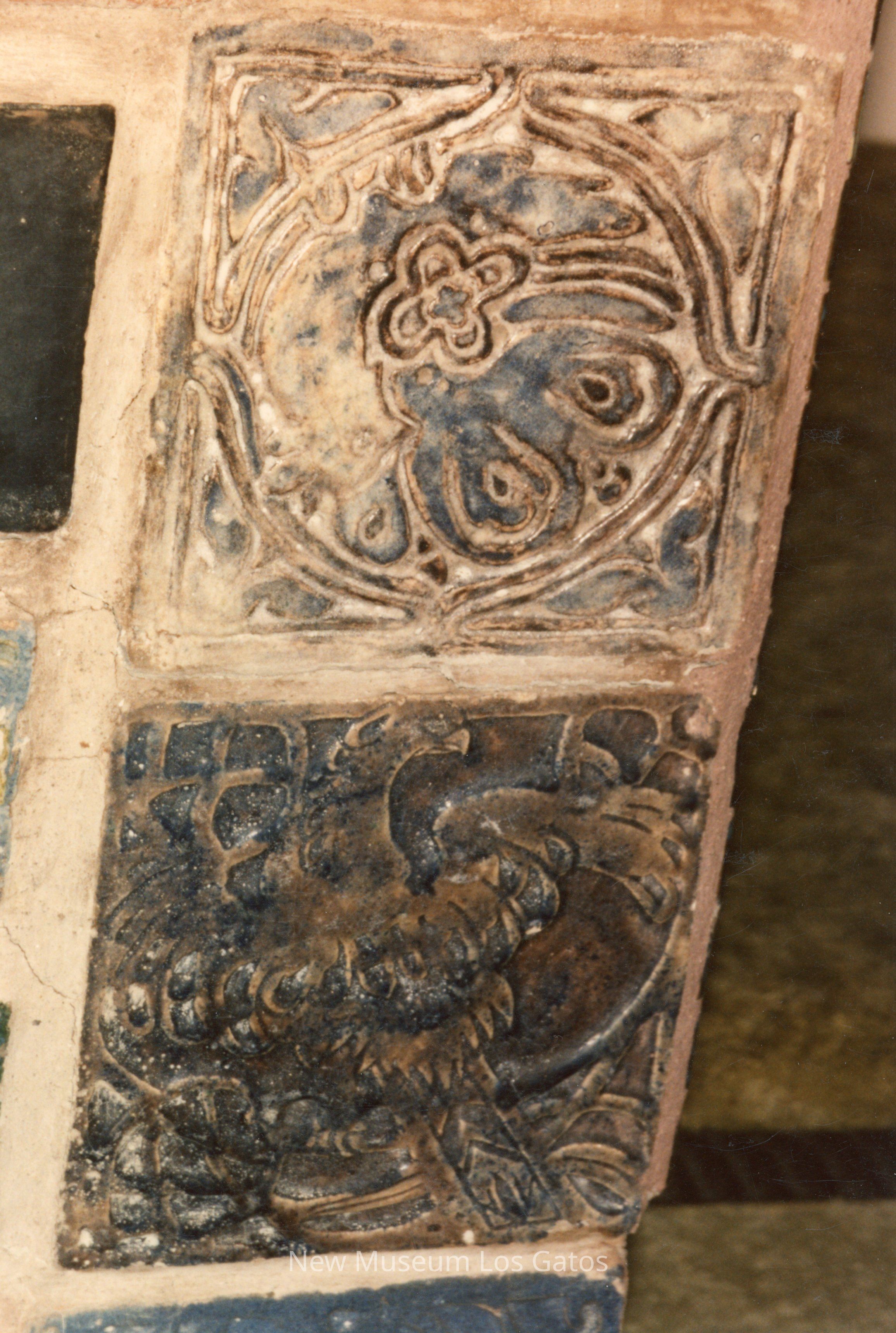 A color photograph featuring two decorative tiles, surrounded by white grout and other partially visible tiles. The top tile is blue and features a Batchelder-type design, while the bottom tile is darker and features an unknown design.Photograph Details