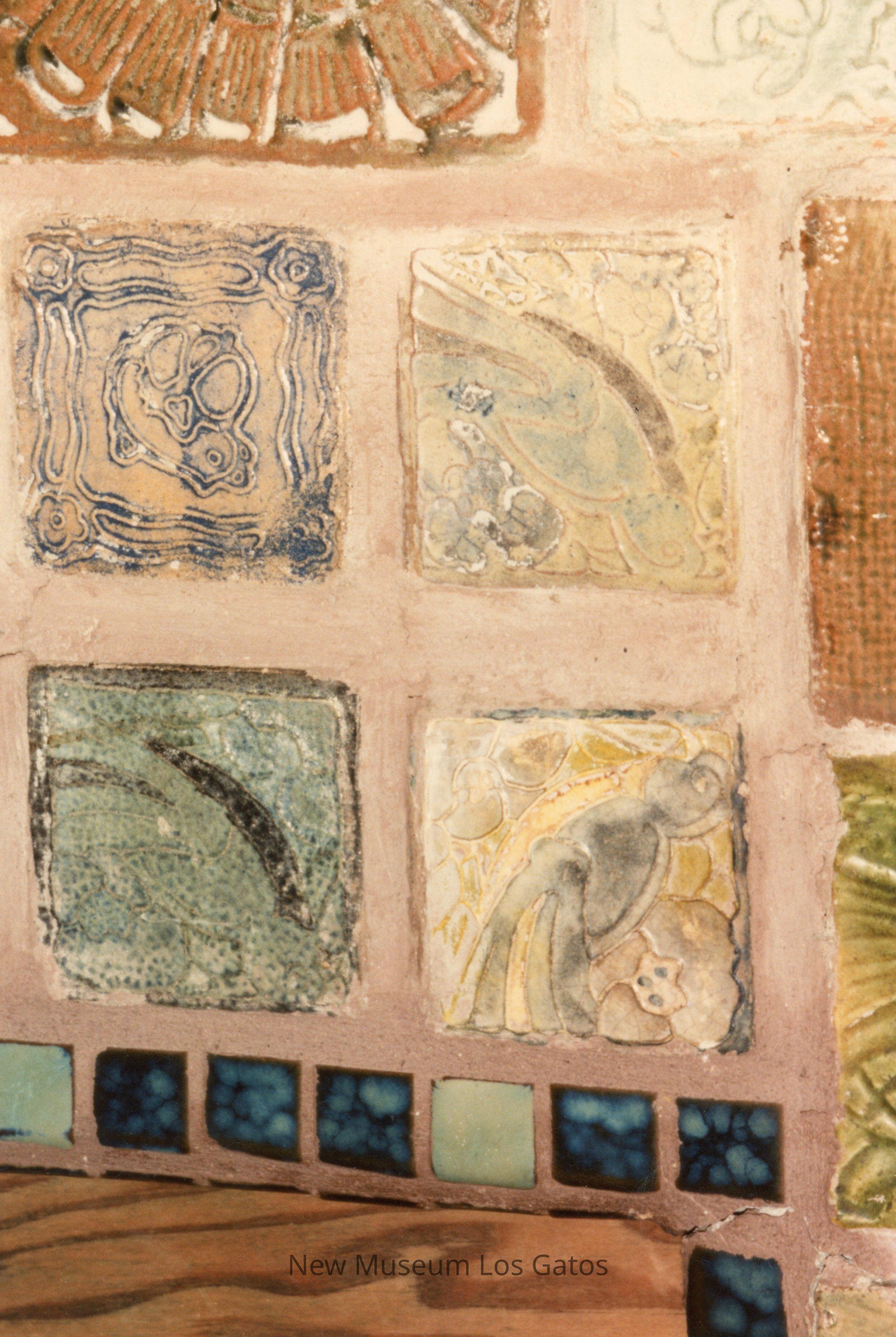A color photograph featuring a four decorative tiles, mounted in reddish grout. There are smaller dark blue and light blue tiles below the four main tiles, and partially-pictured larger, decorative tiles above and to the right of the four main tiles.Photograph Details
