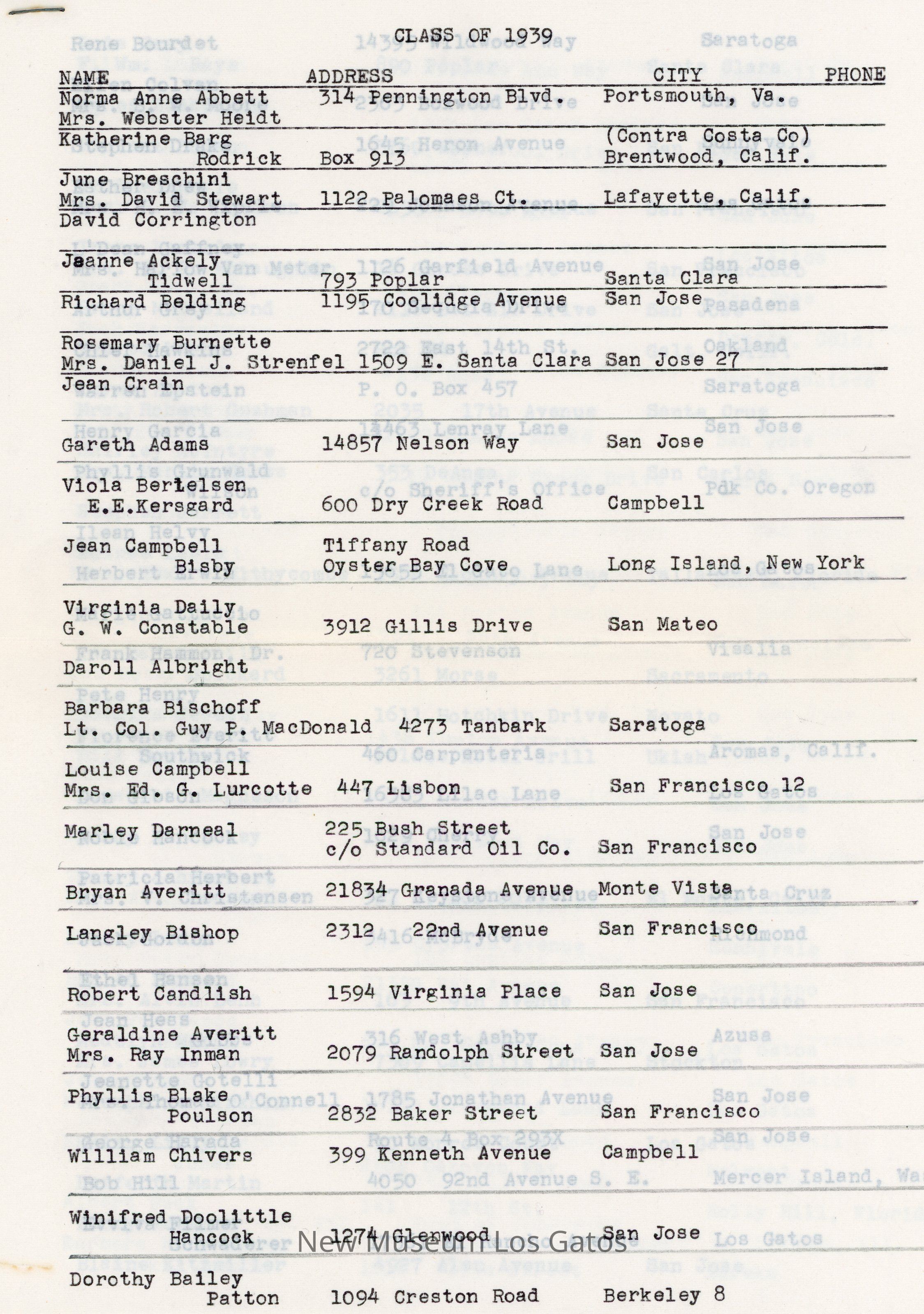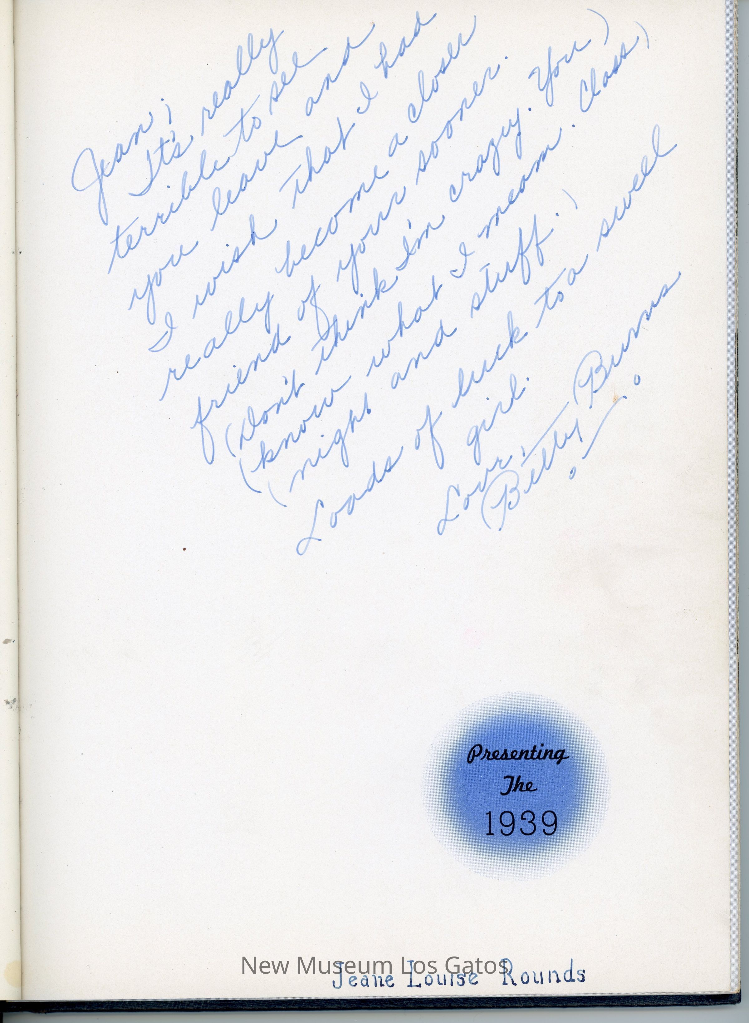 The Wildcat, a hardcover literary magazine/yearbook published by the students of Los Gatos High School in June 1939, volume number 42. Issue number is not specified in this particular issue. Inside the yearbook is a black and white photograph of the class of 1939 in graduation robes, a handwritten list of people, a typed list of the class of 1939 and their addresses, and a drawing of a monogram of the owner of the yearbook.Collection