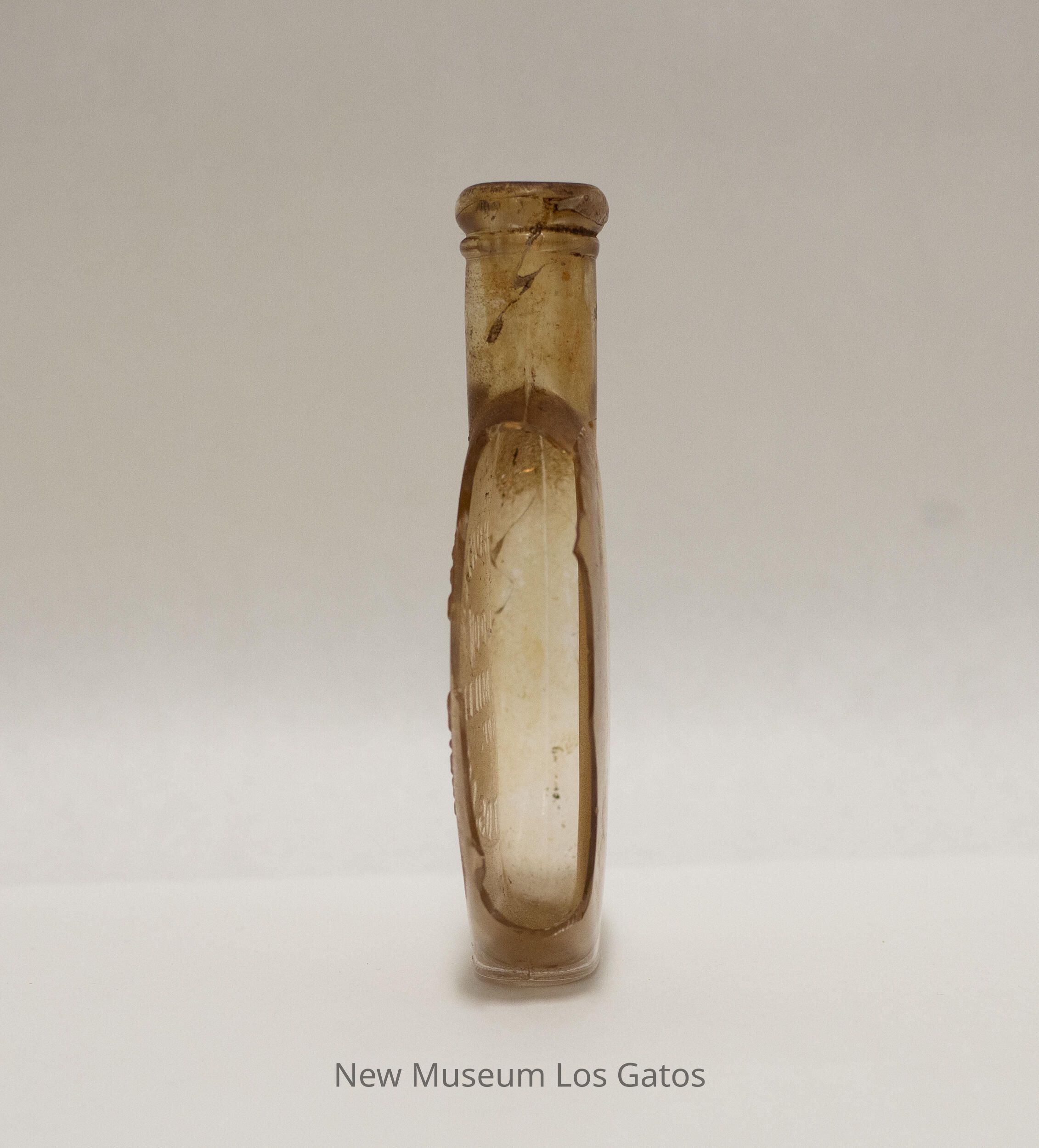 A small clear bottle. The main body of the bottle is slightly square and slightly rounded, with a moderately long neck. There is an inscription embossed on one side of the body, which is detailed below.Collection