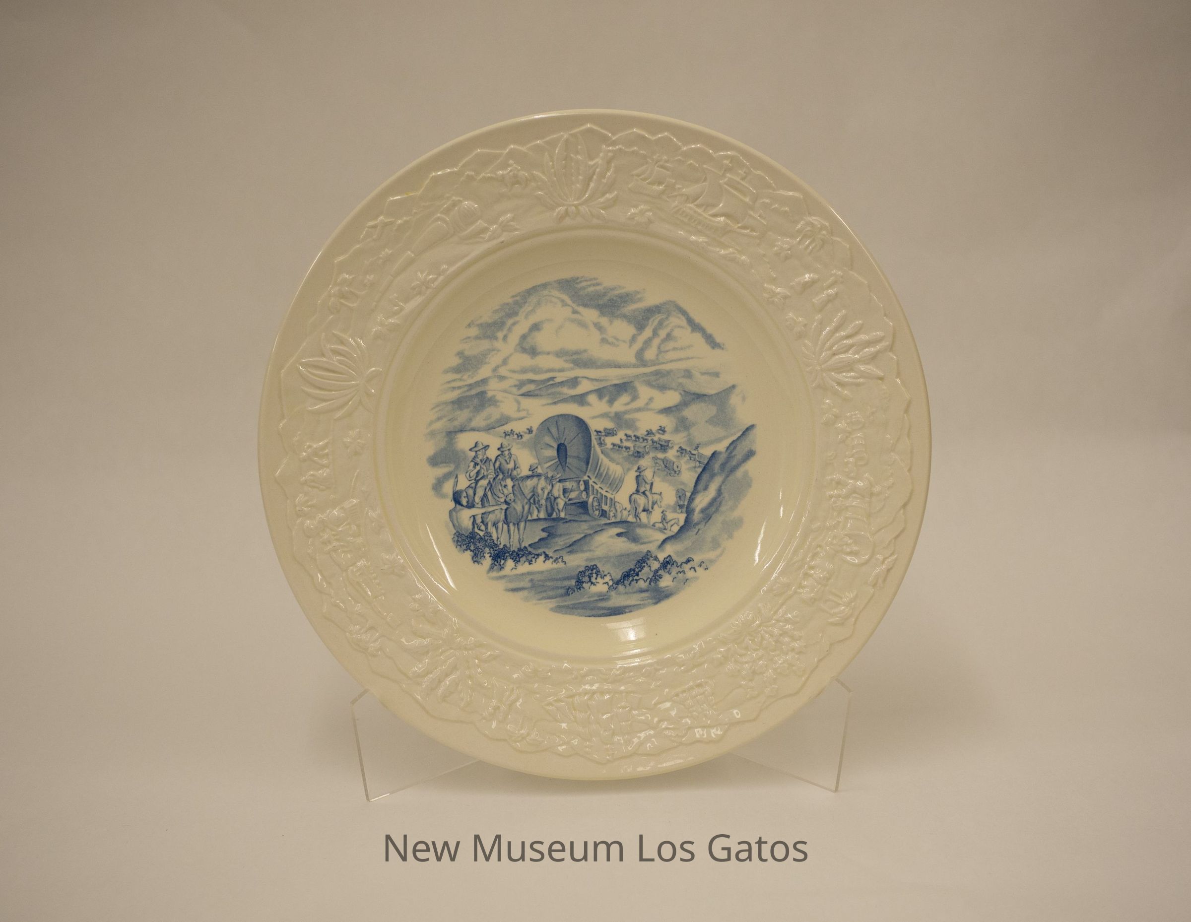 A decorative, commemorative plate depicting the Donner Expedition in 1846. The center of the plate depicts a scene with a covered wagon in the center, and many other covered wagons, horses, and people in the background. In the foreground, an Indigenous person is pointing two people on horses towards the right. Around the rim of the plate are various embossed depictions of California history, including a ship, cacti, missionaries, covered wagons, and trains.