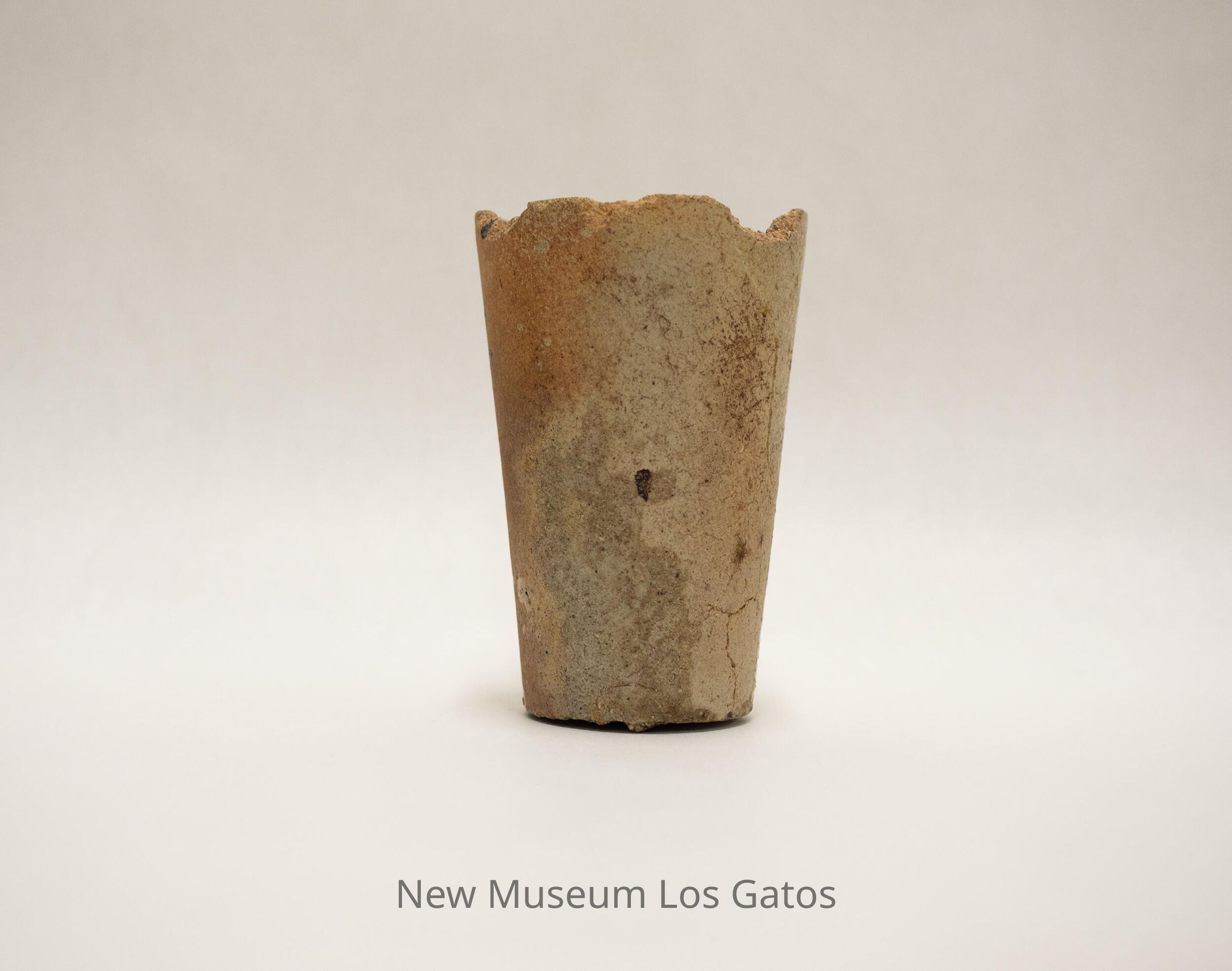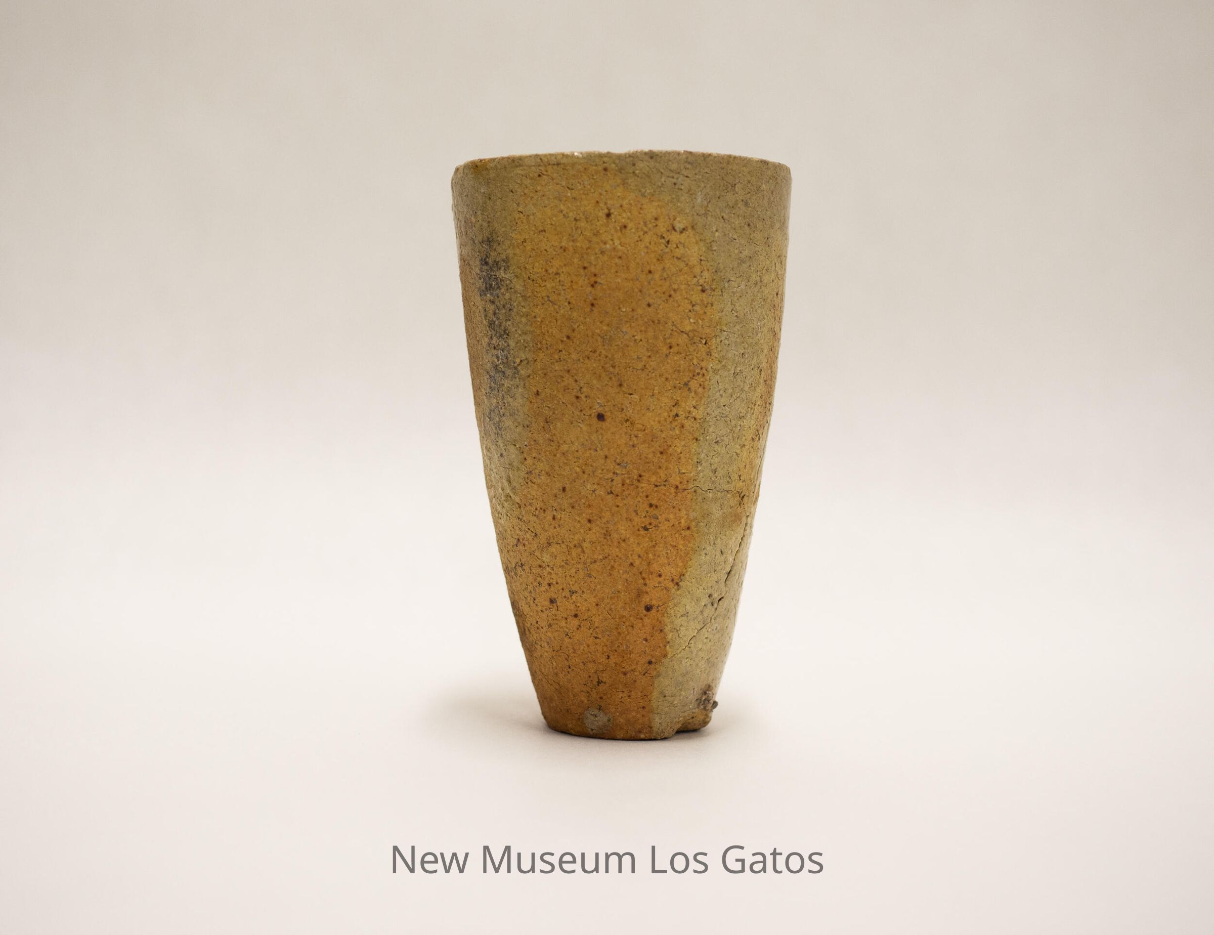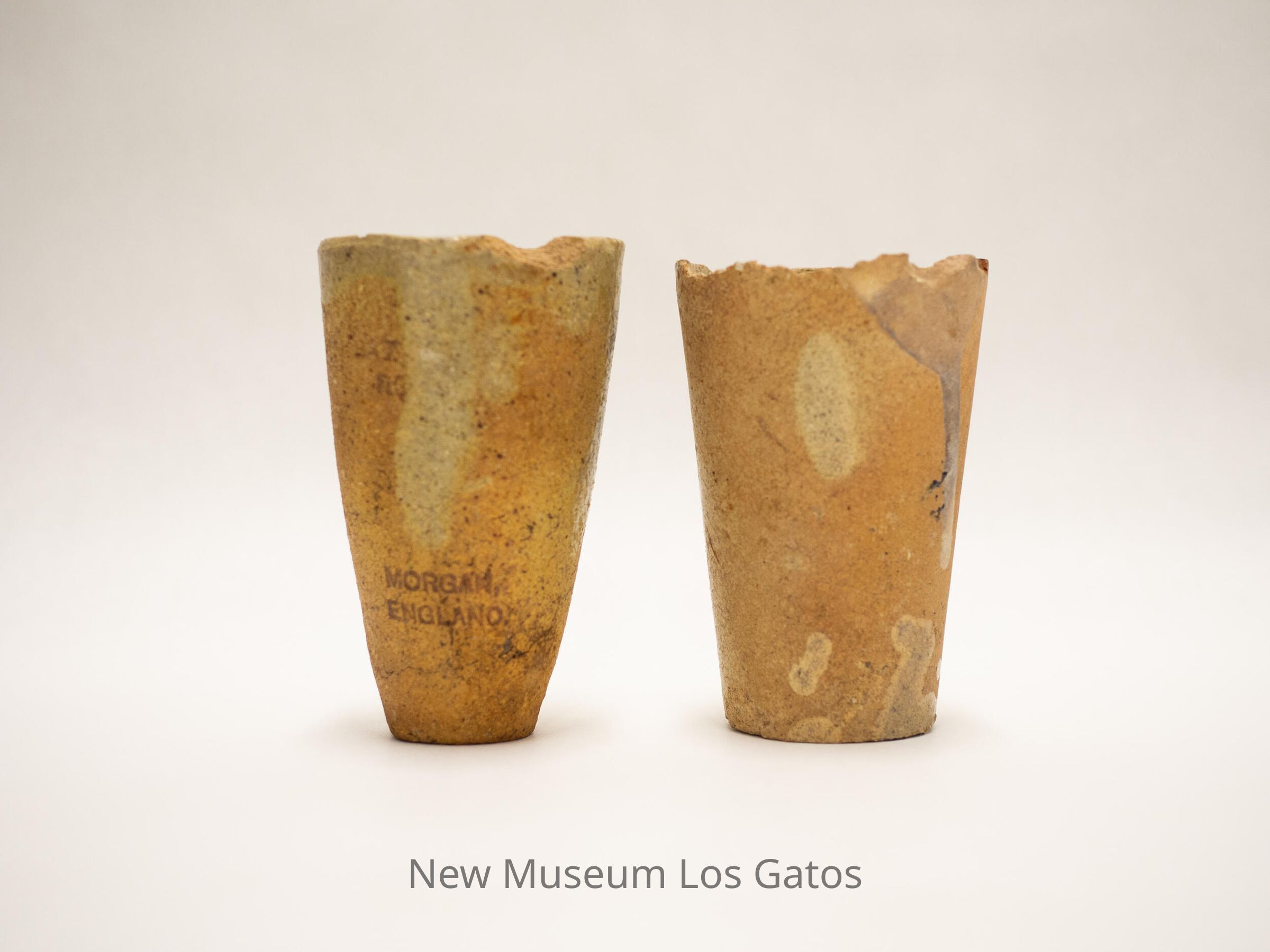 Pair of light brown ceramic cups, with green-tinged glaze. Appears to be hand-crafted, or made by an artisan.Collection