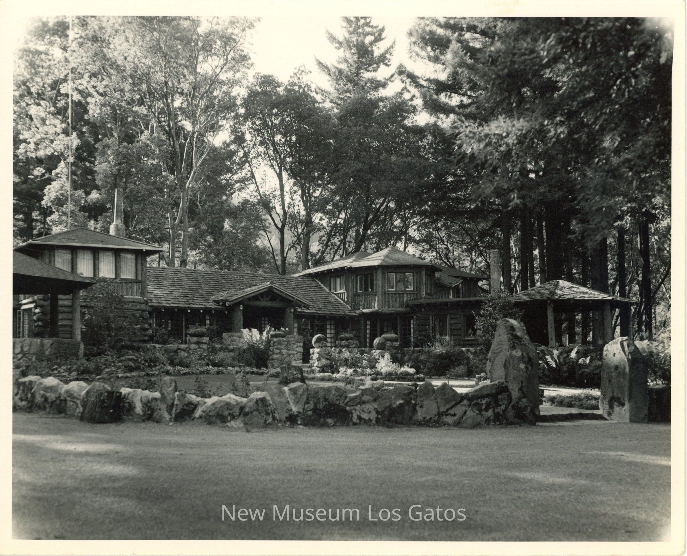 Black and white photograph of a wooden log house, surrounded by trees and a rock fence. There is a large lawn in the foreground.Photograph Details