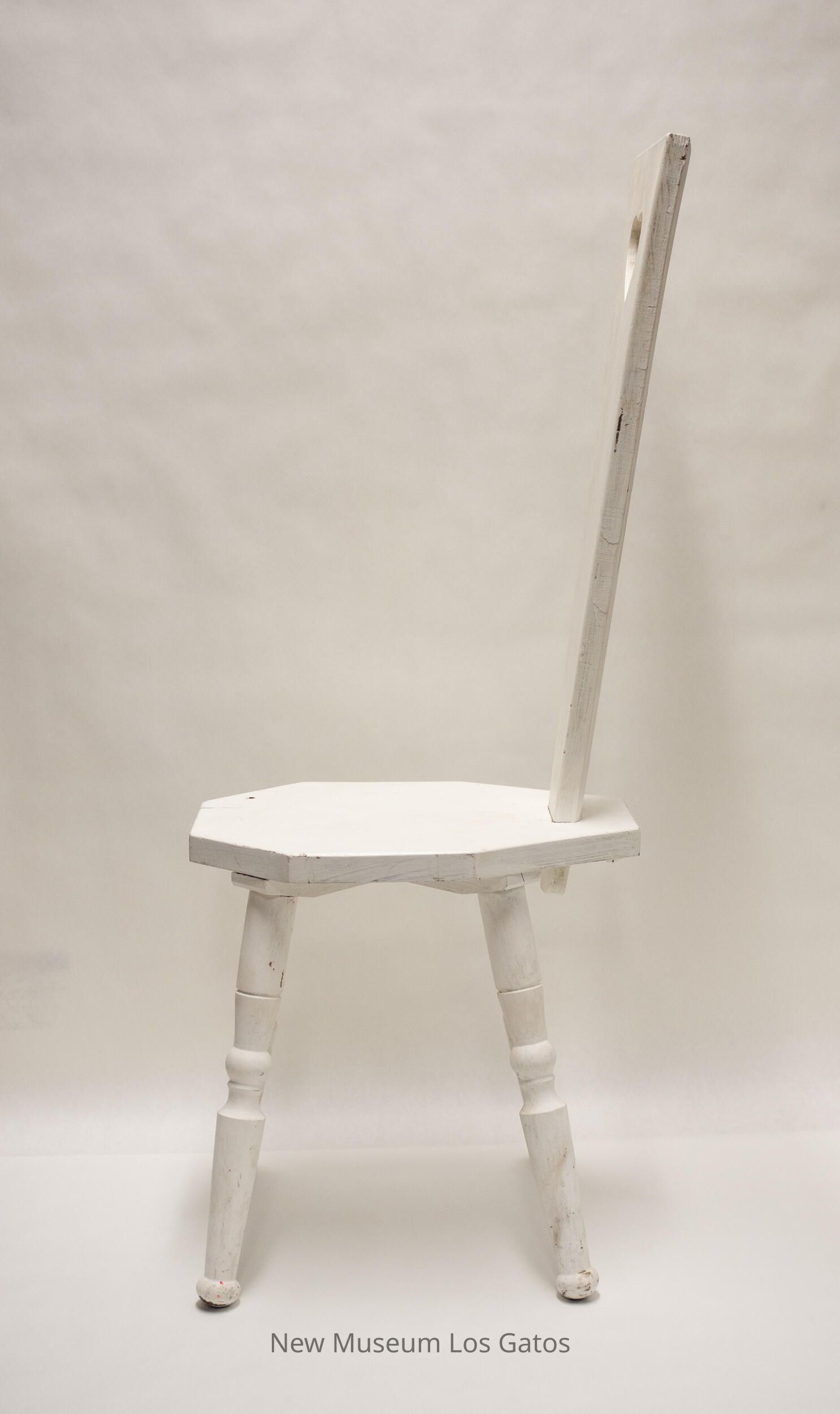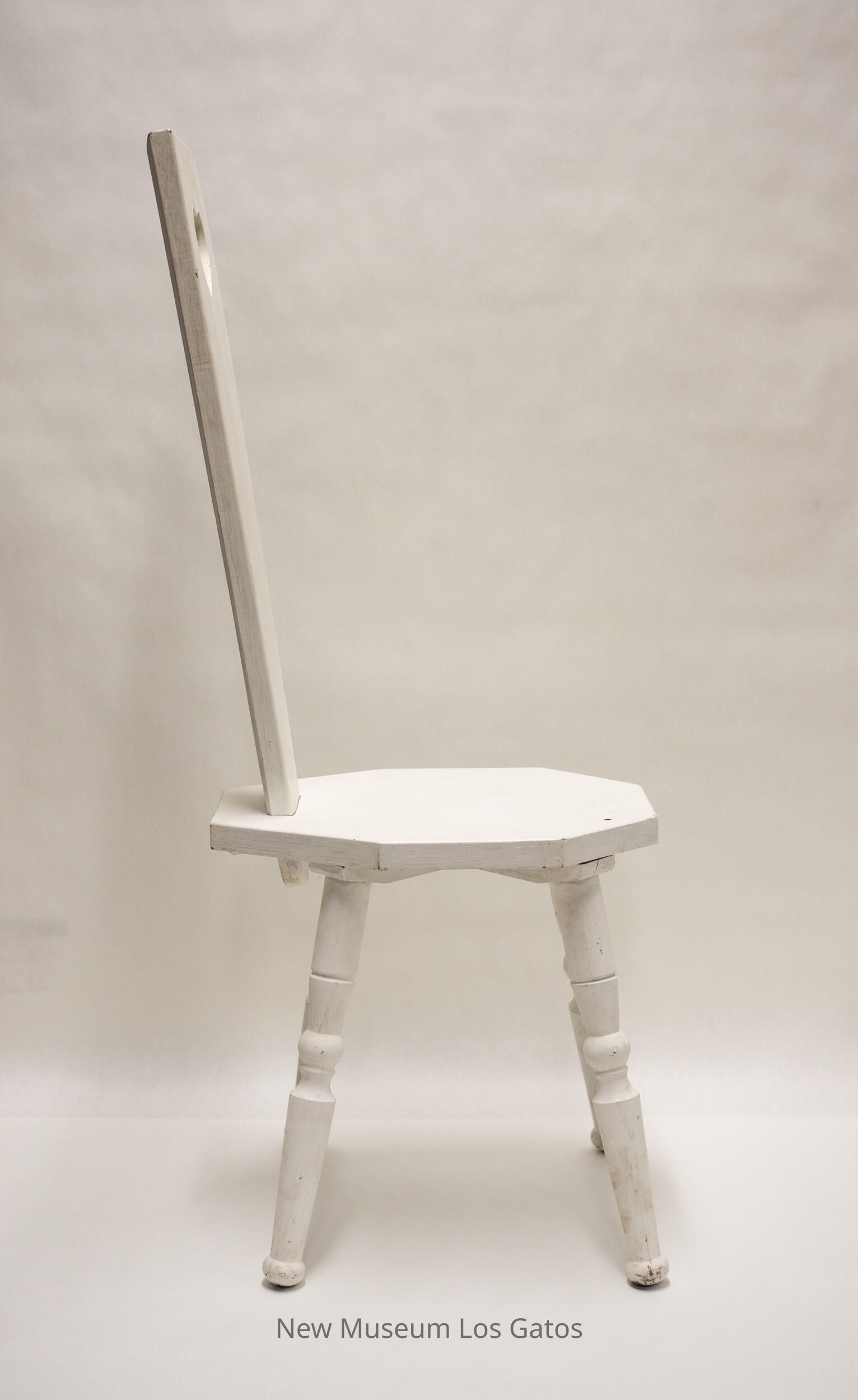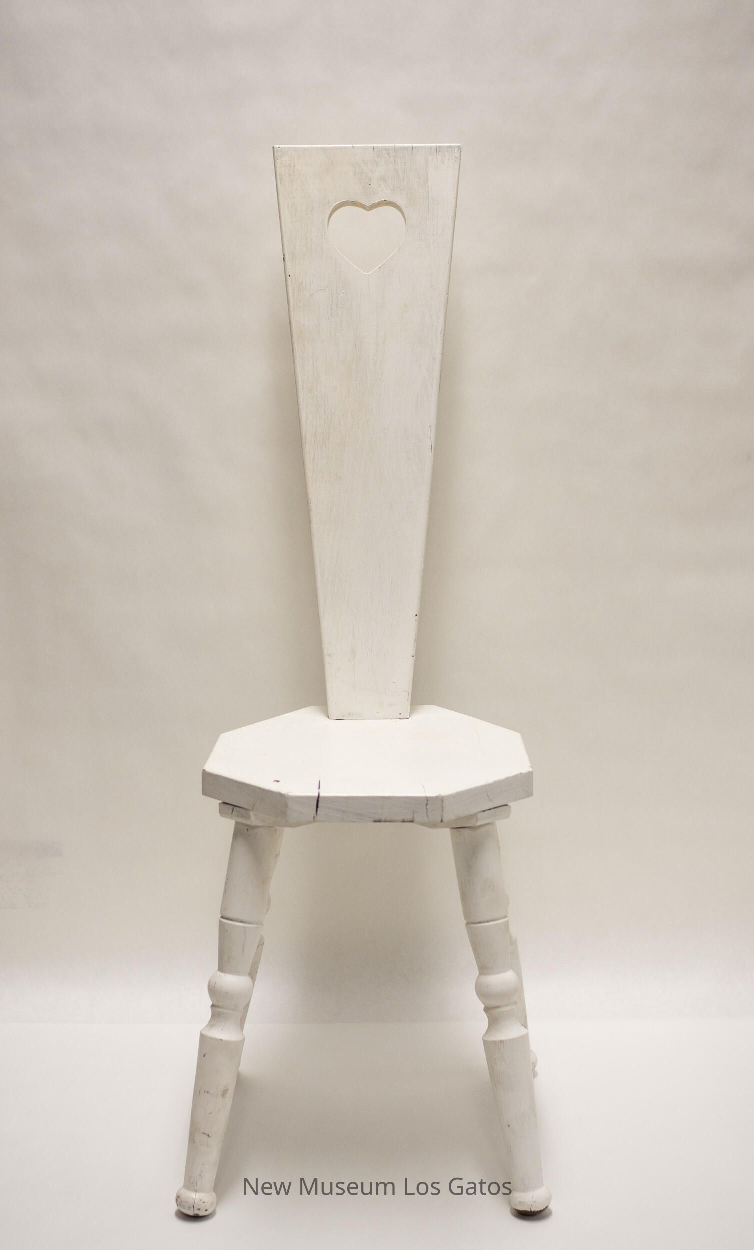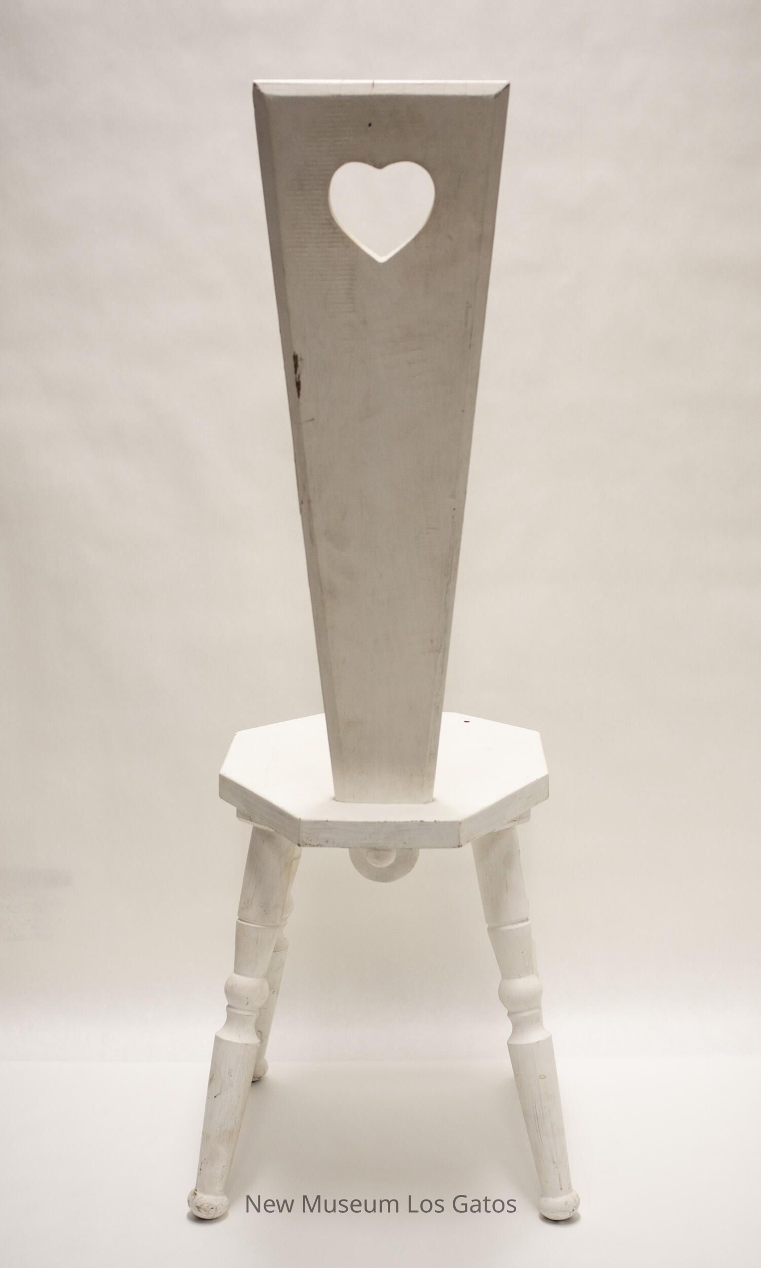 A small, white wooden chair. The seat is octagonal in shape. The four legs angle out slightly, and taper towards the middle, where there is a decorative ball in the center. There are no arms, and the back panel is tall, and tapers in towards the seat from the top. There is a heart cut out in the top of the back panel.Collection