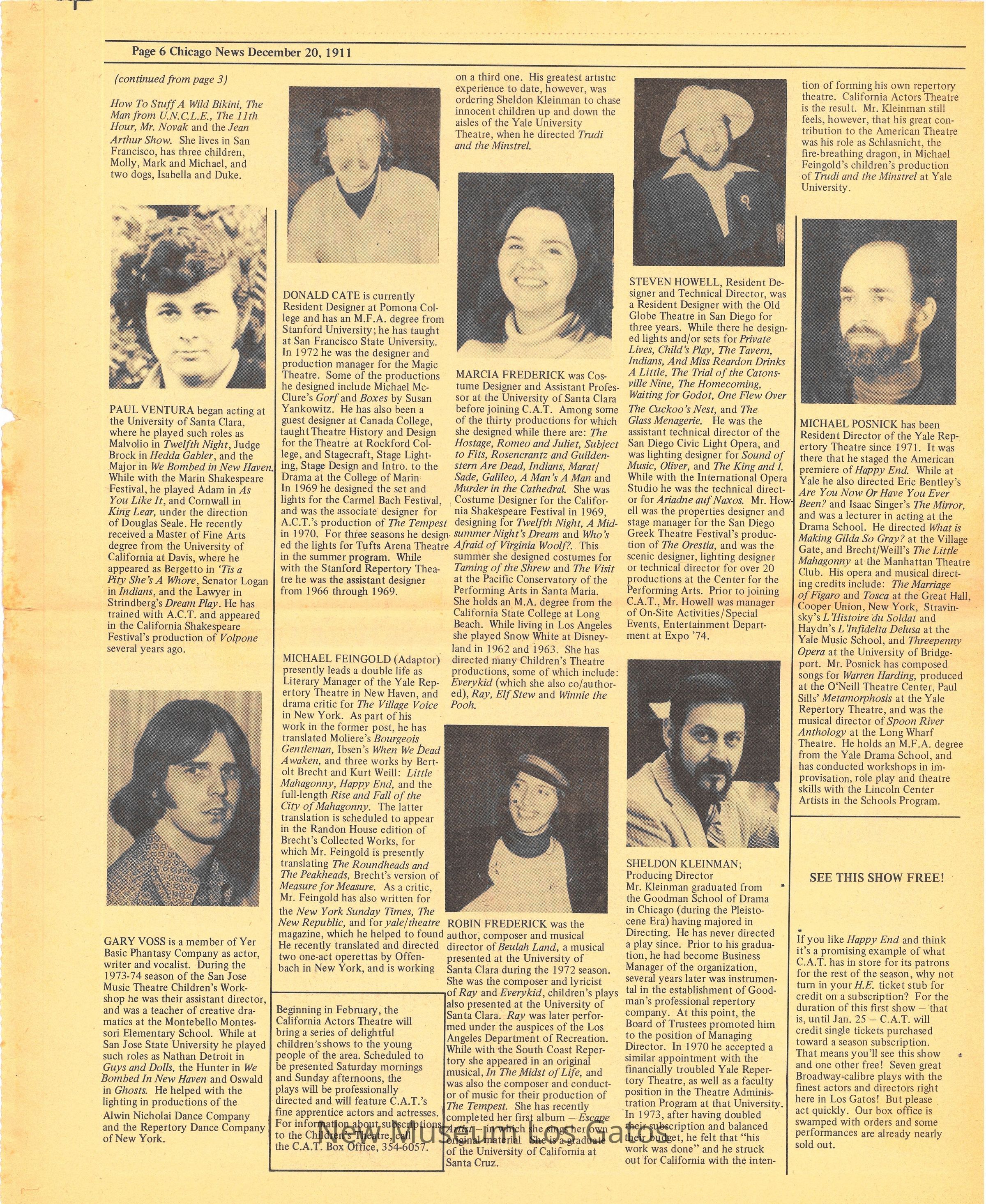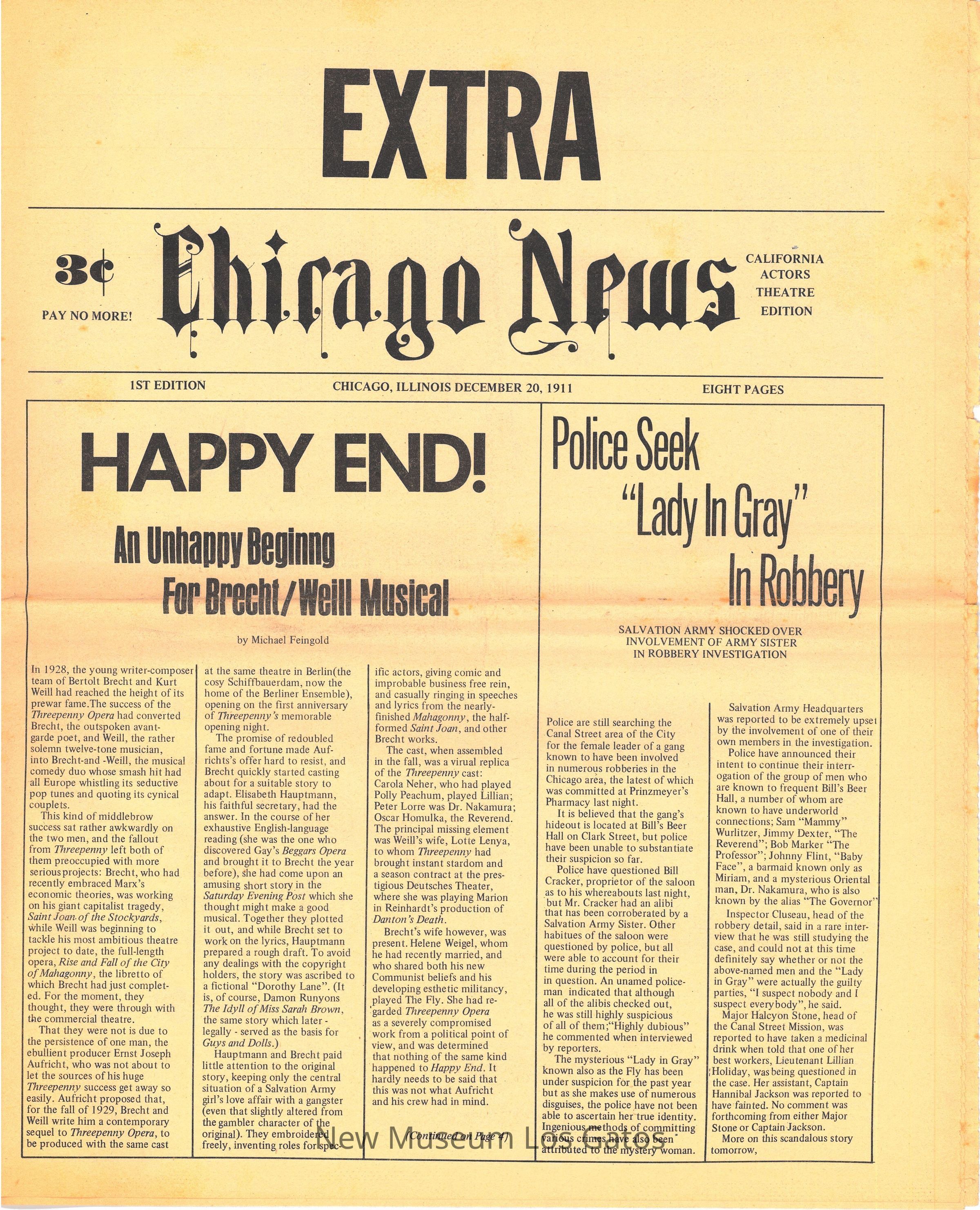 An eight page copy of the Chicago News, California Actors Theatre Edition, which includes information and backstory for the production of "Happy End," as well as cast photos and bios.Collection
