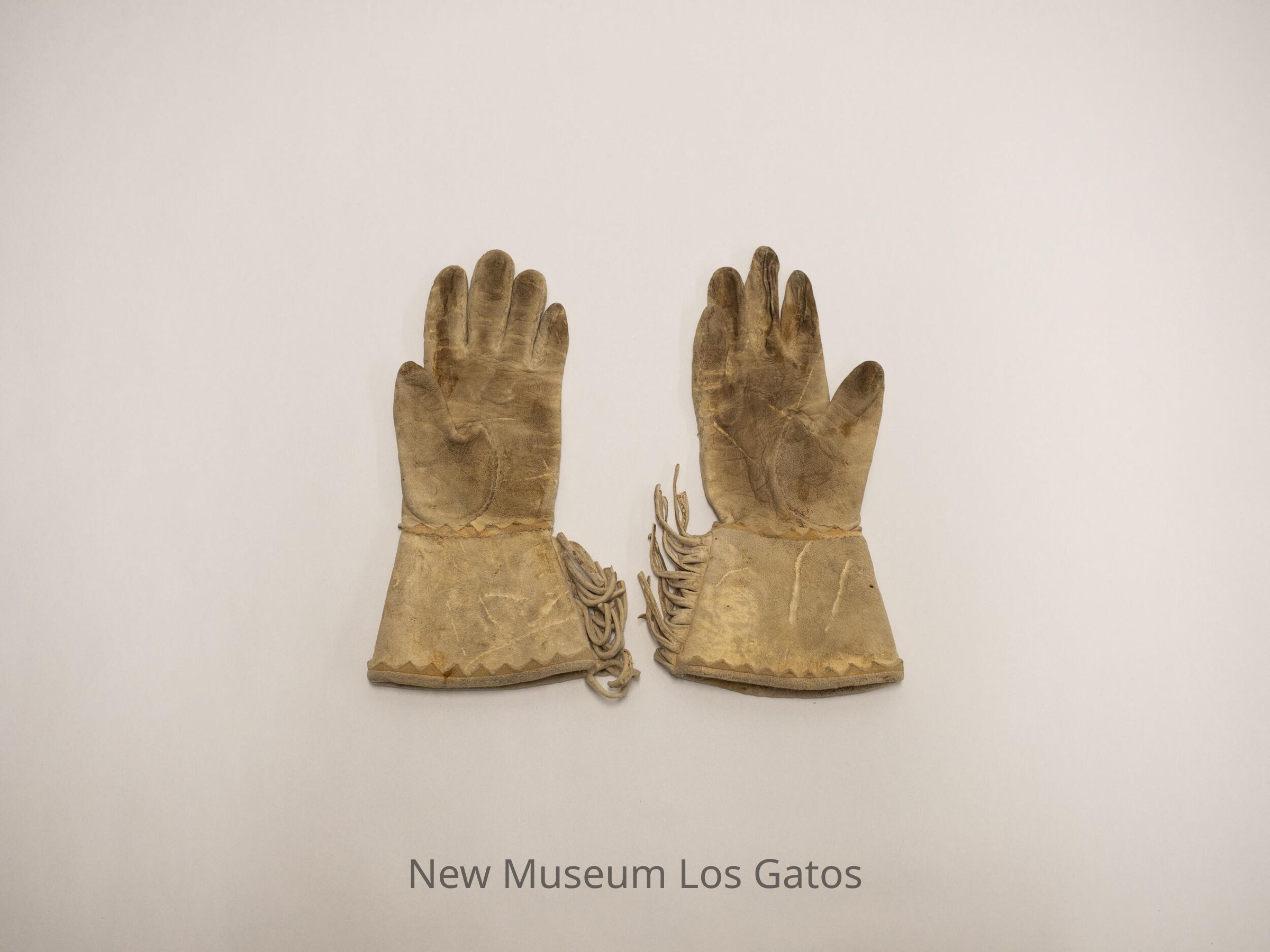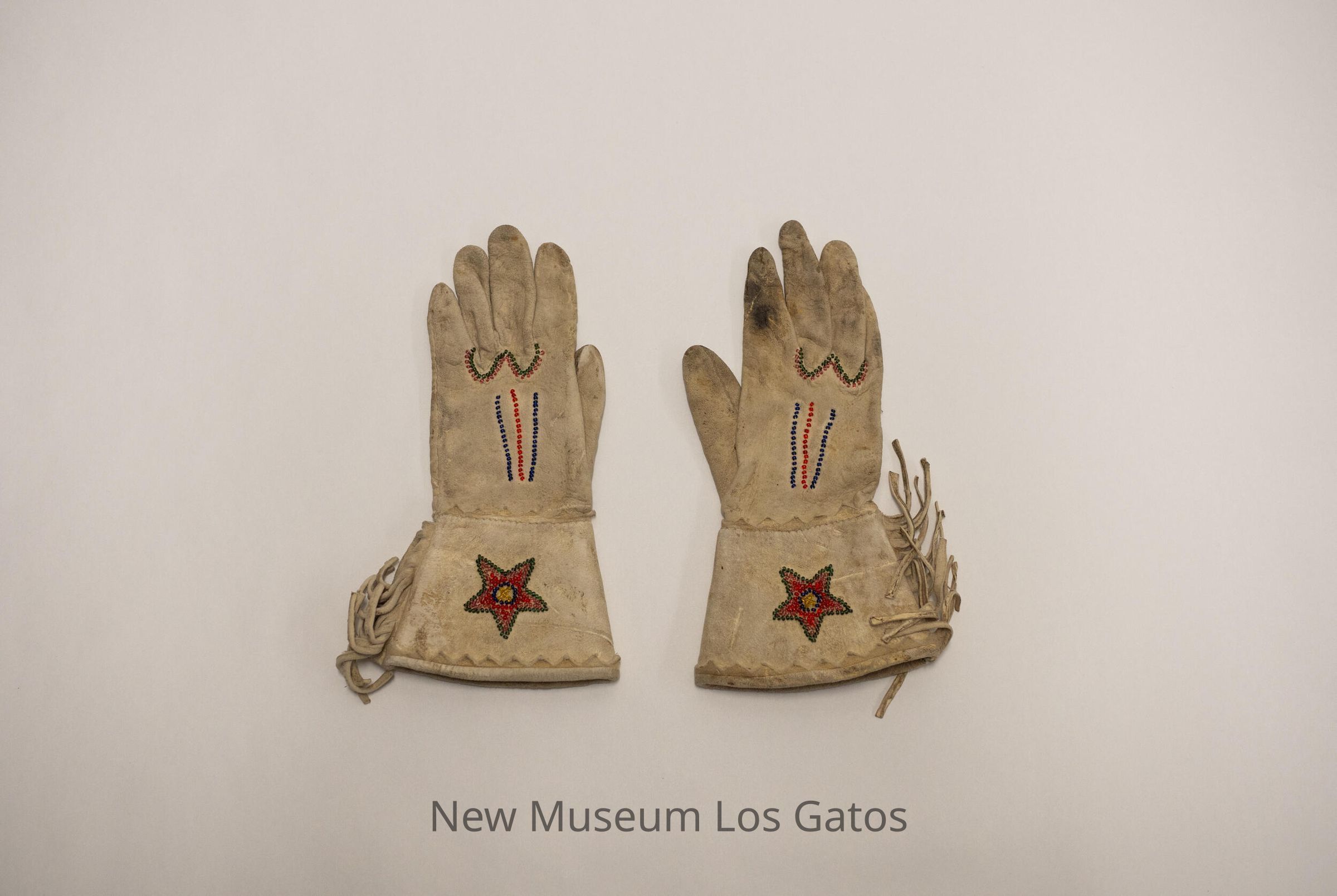 Pair of children's leather gloves. There is fringe on the left side of the left glove, and on the right side of the right glove. There is matching beaded detailing on the cuff and on the top of the hand.Collection