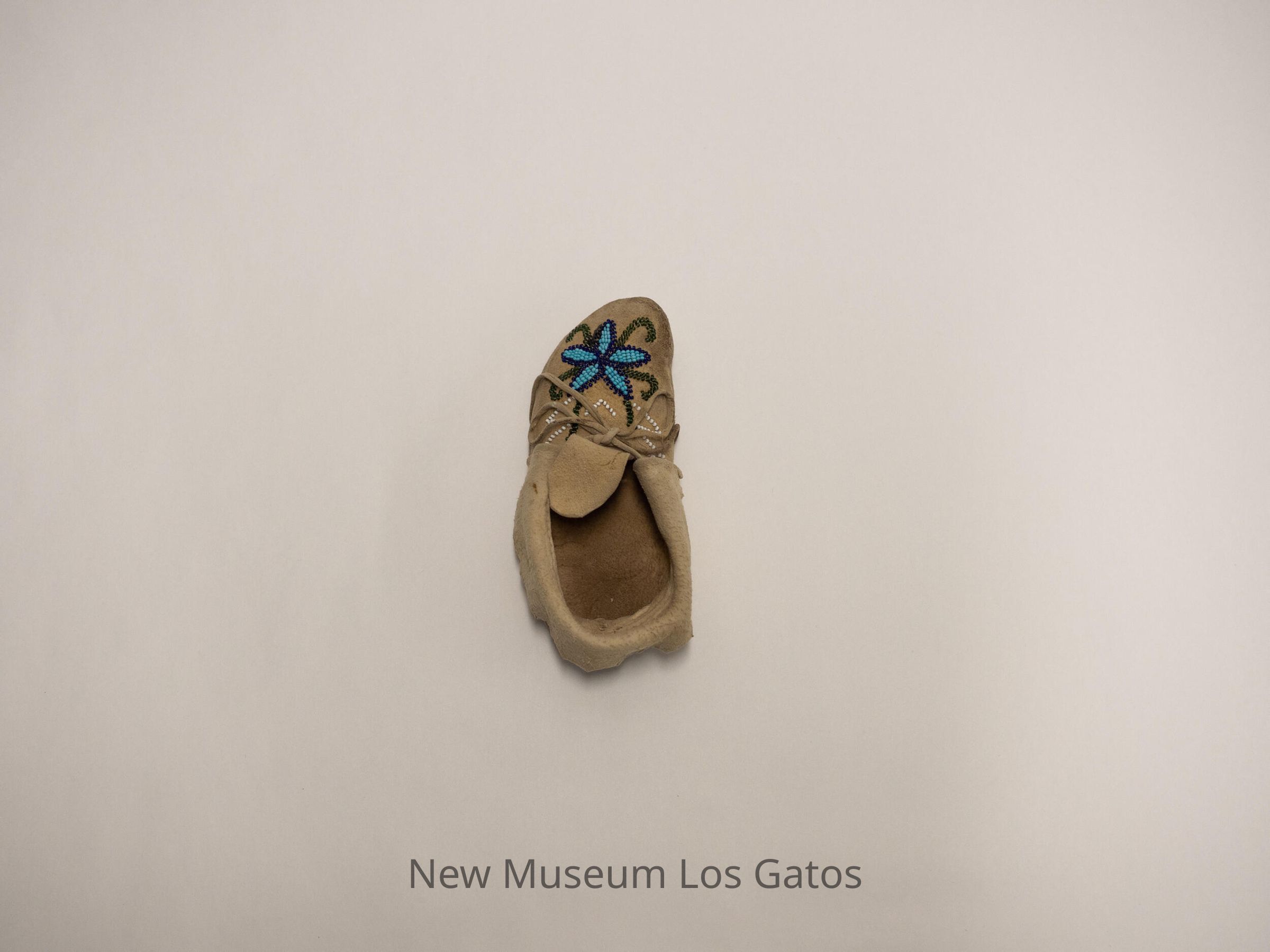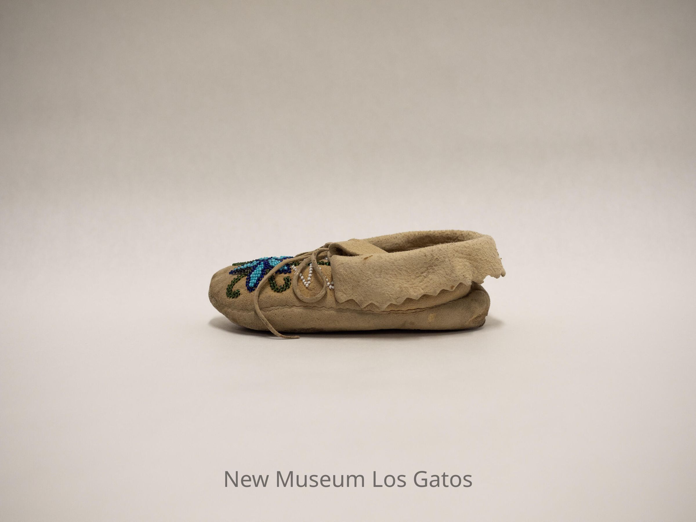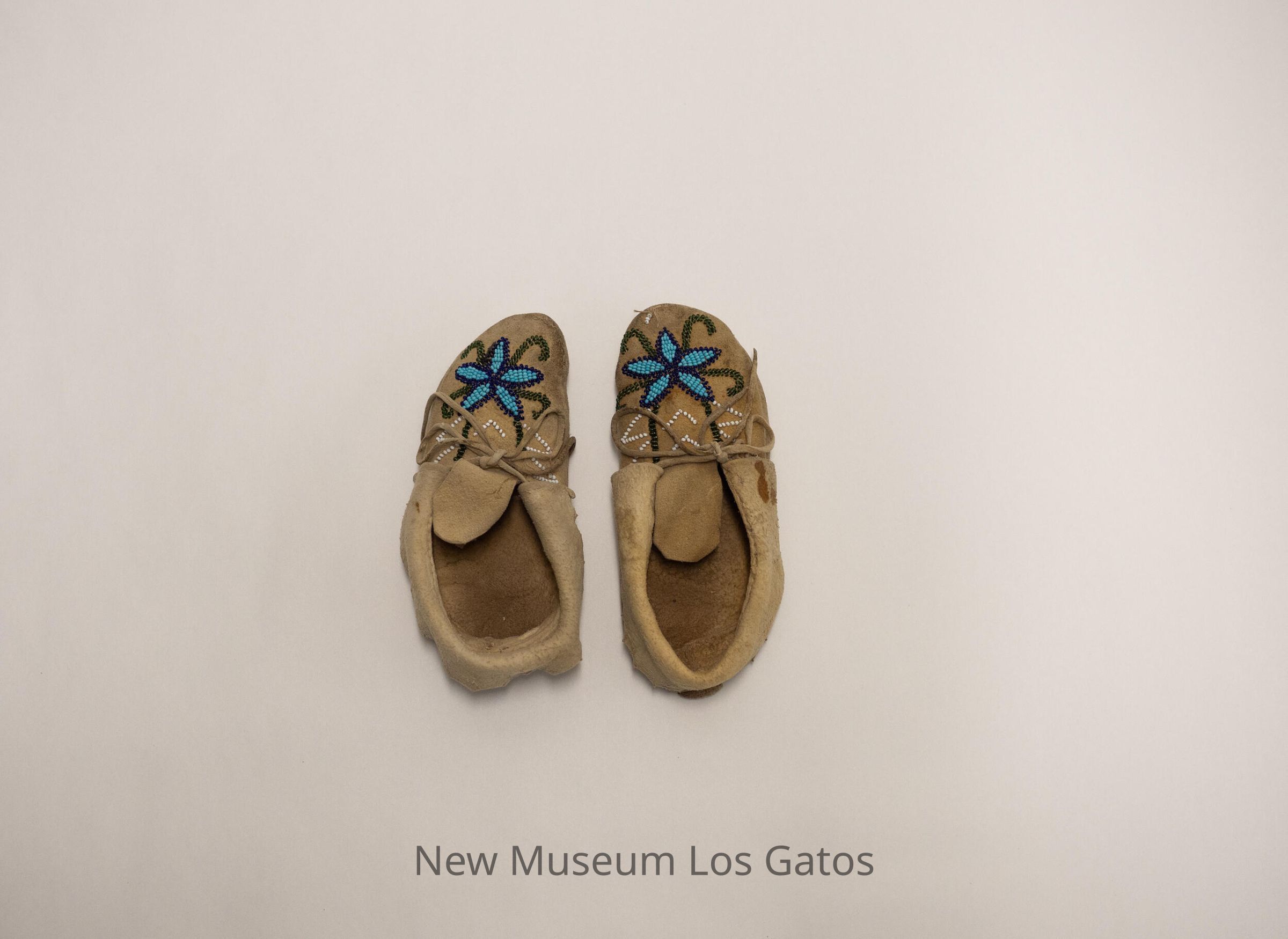 Pair of "boot" style moccasins for children. Intricate beadwork on the toe, and along the base of the cuff. Both moccasins have laces.Collection
