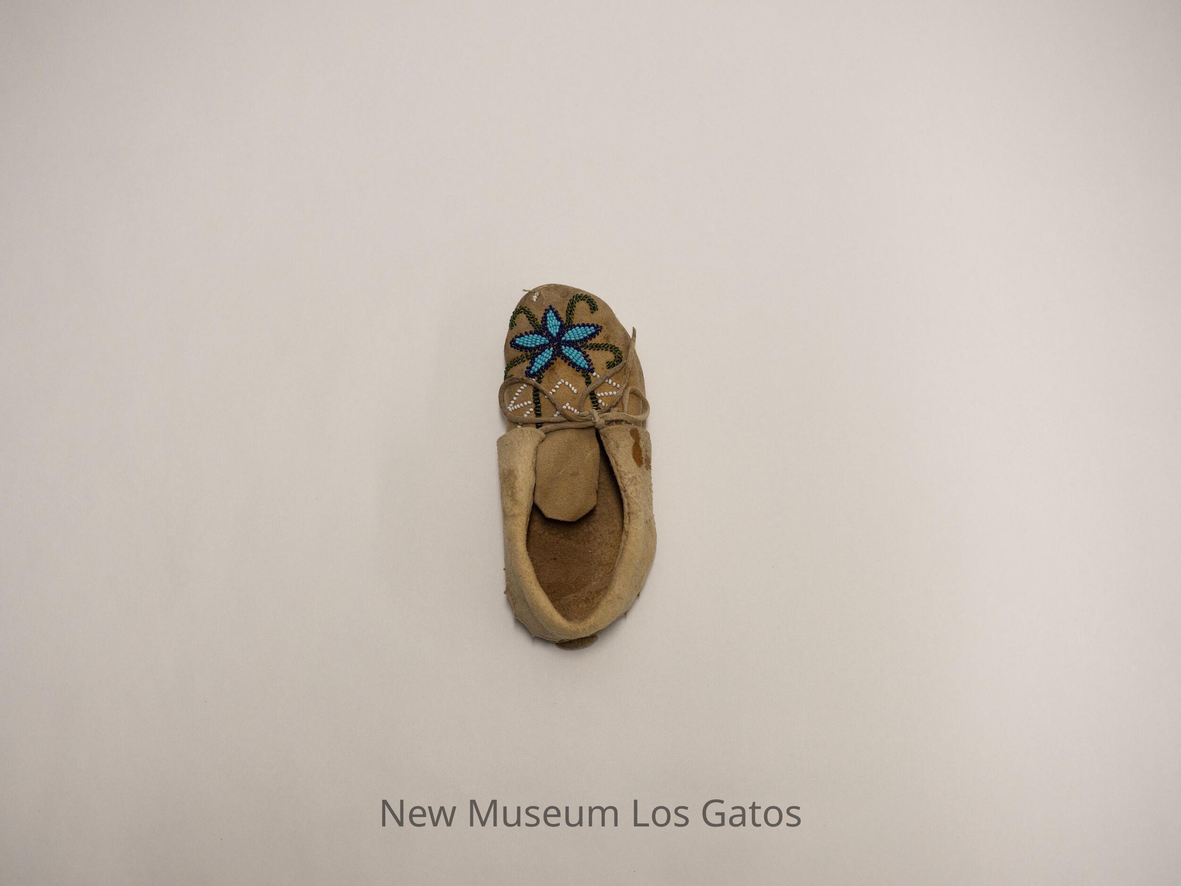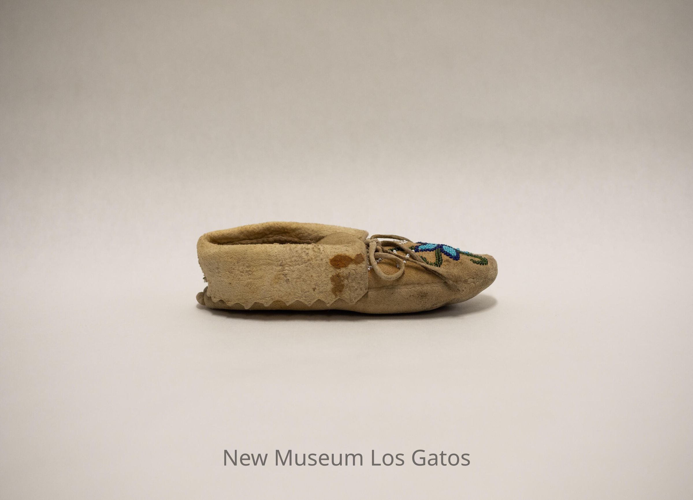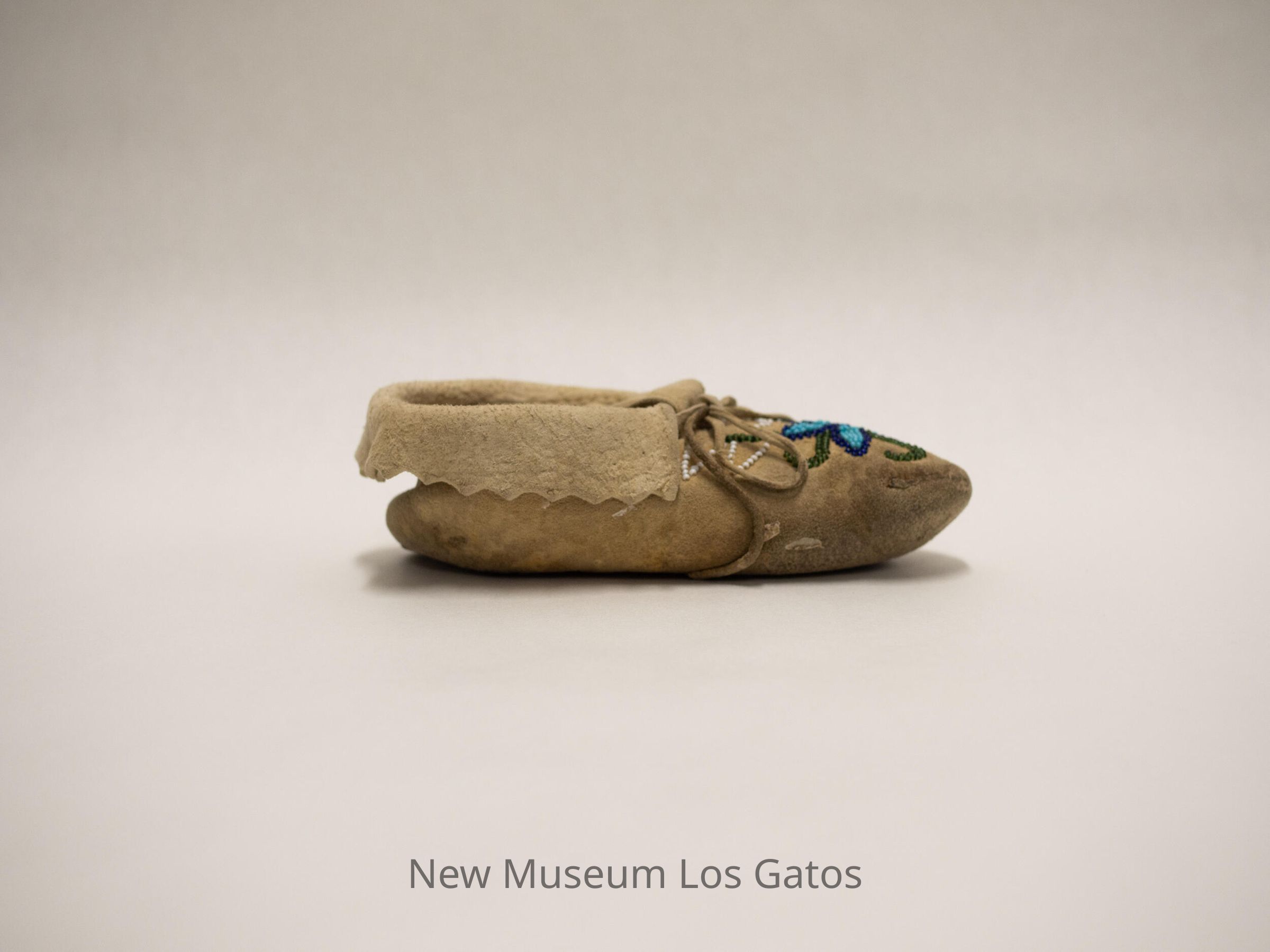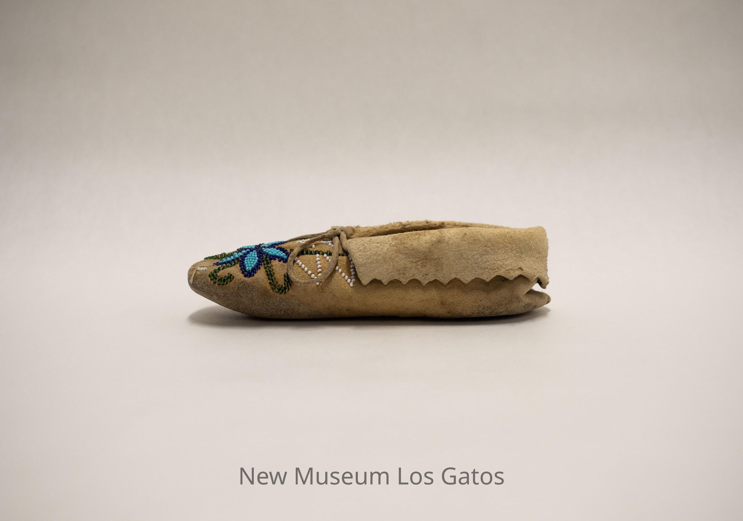 Pair of "boot" style moccasins for children. Intricate beadwork on the toe, and along the base of the cuff. Both moccasins have laces.Collection