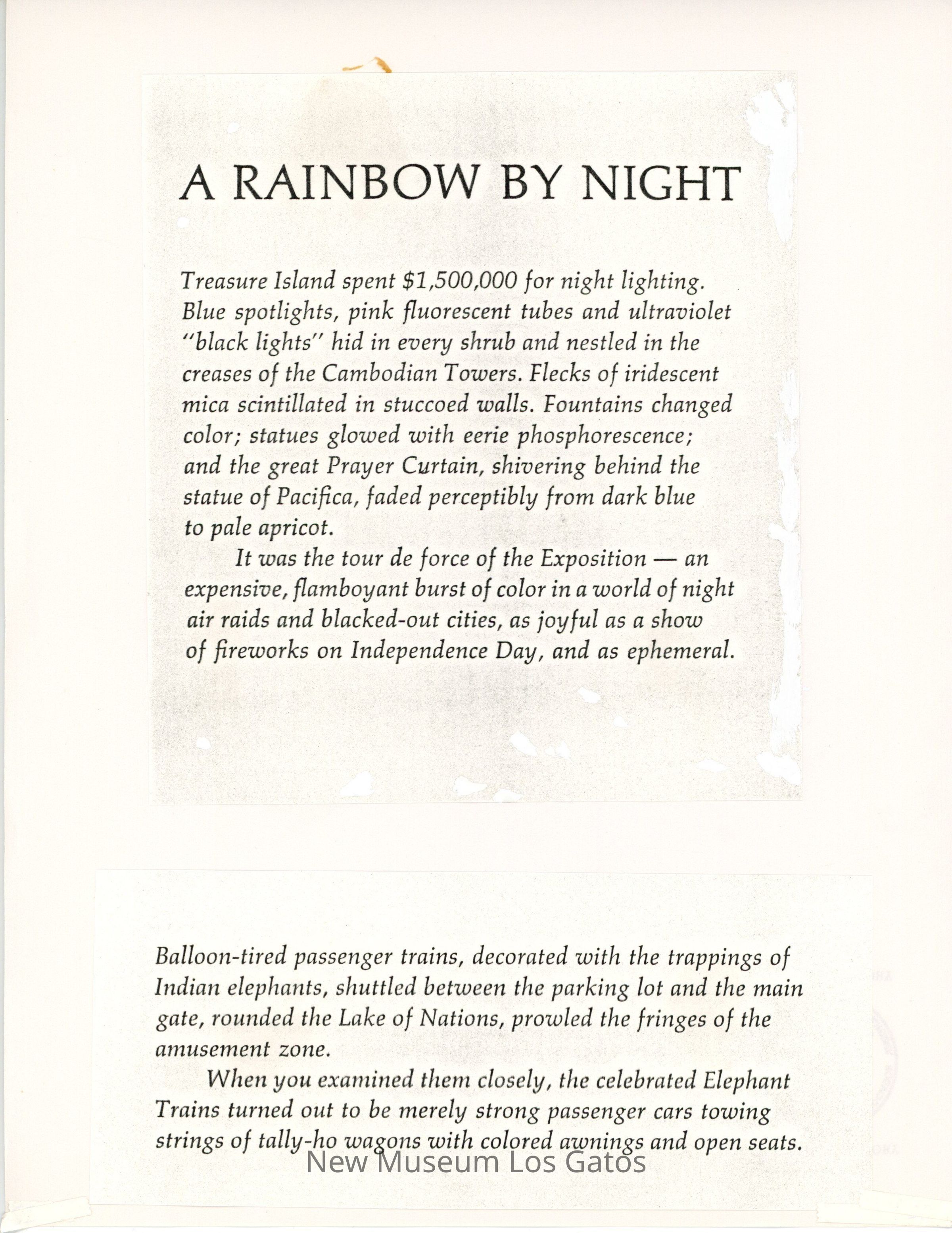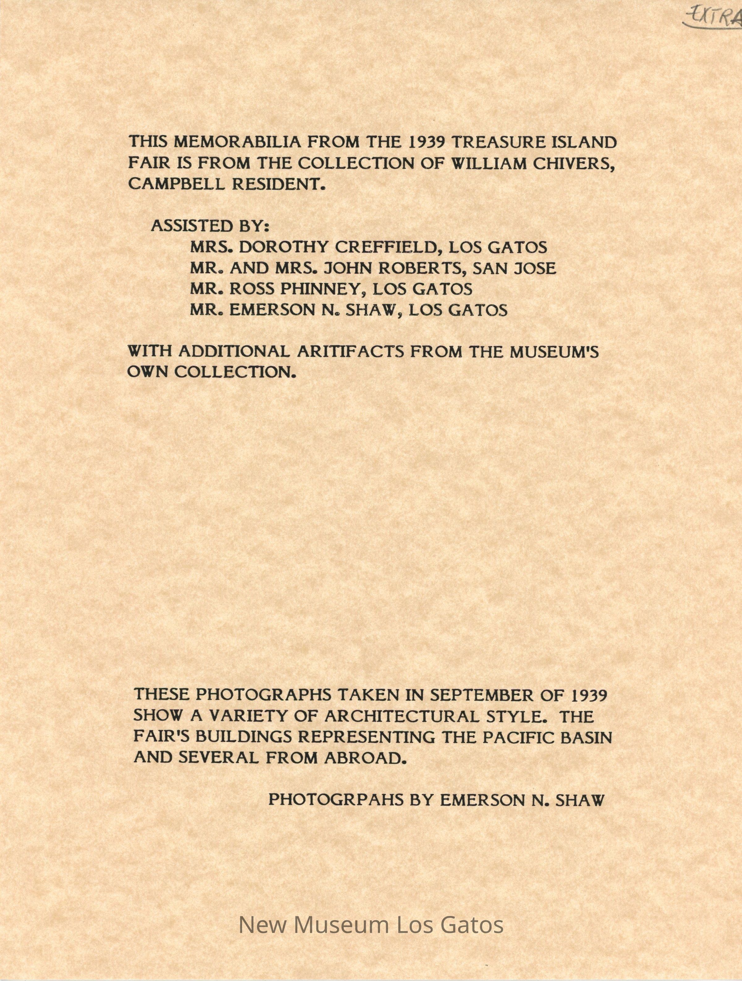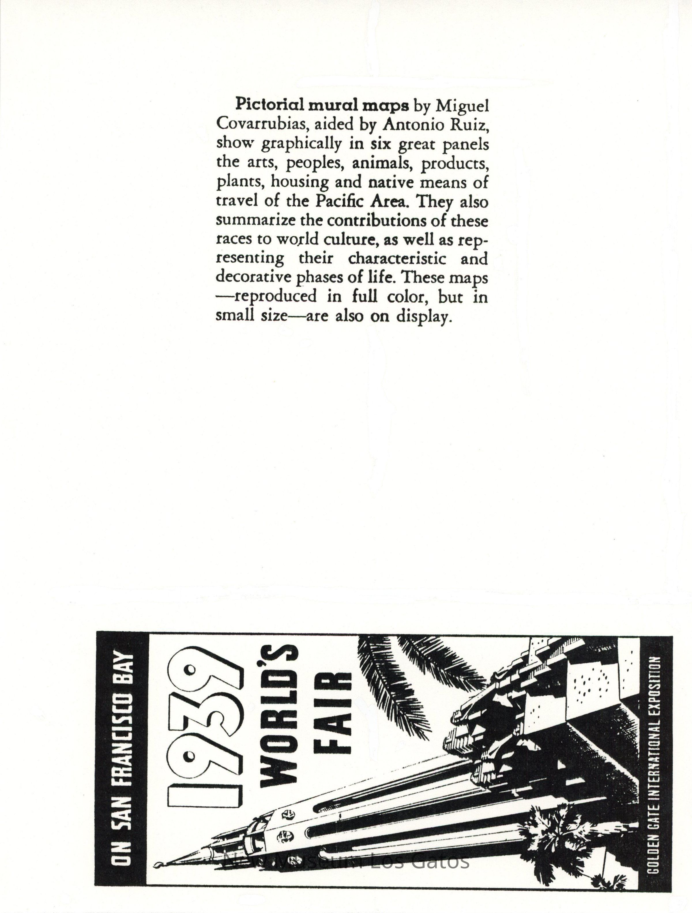 A pamphlet of lesson plans, photographs, and photocopy guides on the 1939 Treasure Island Fair, or Golden Gate International Exhibition. The pages include the master copies, as well as photocopies. Photographs mentioned in the pamphlet are not included.Collection