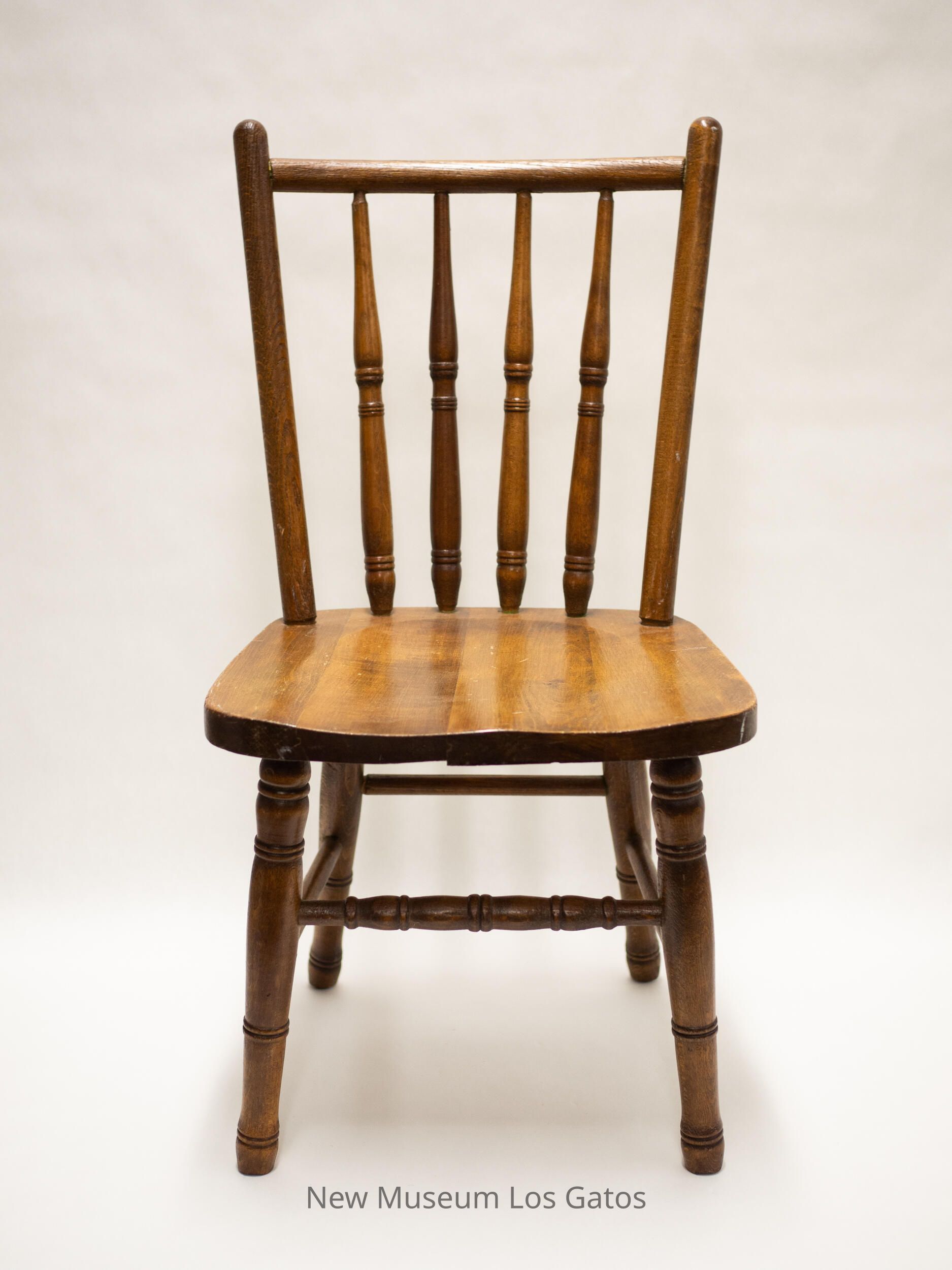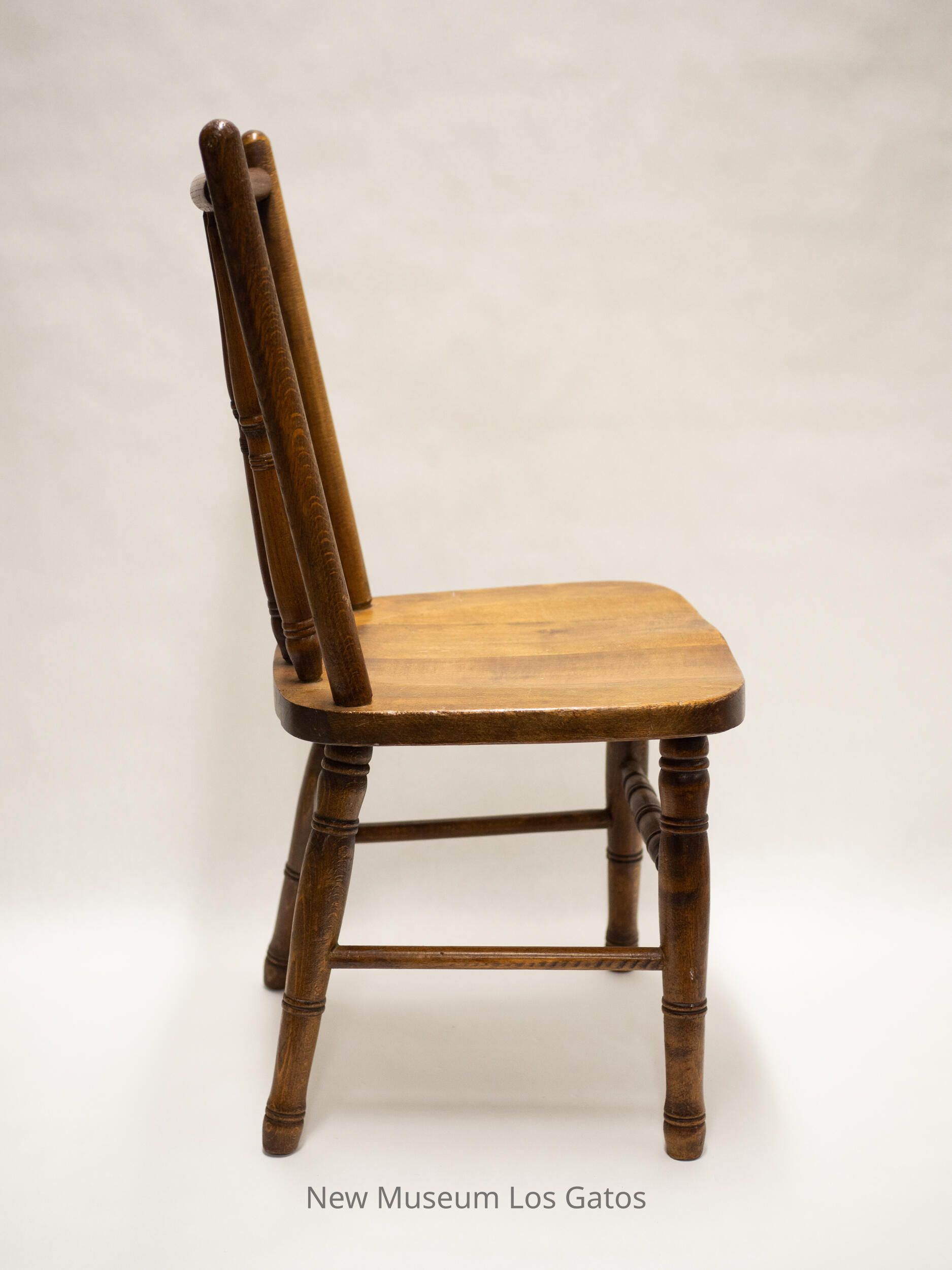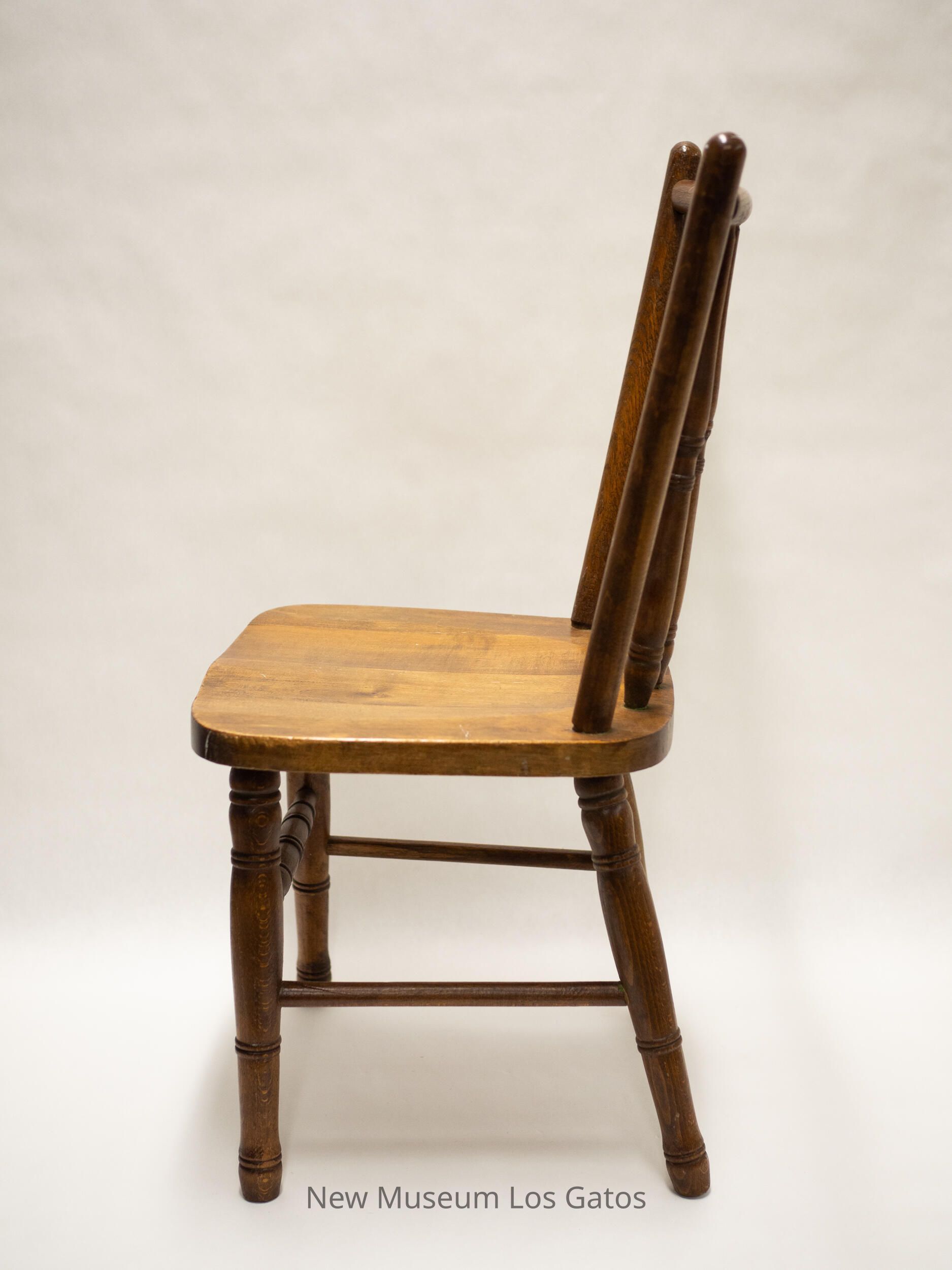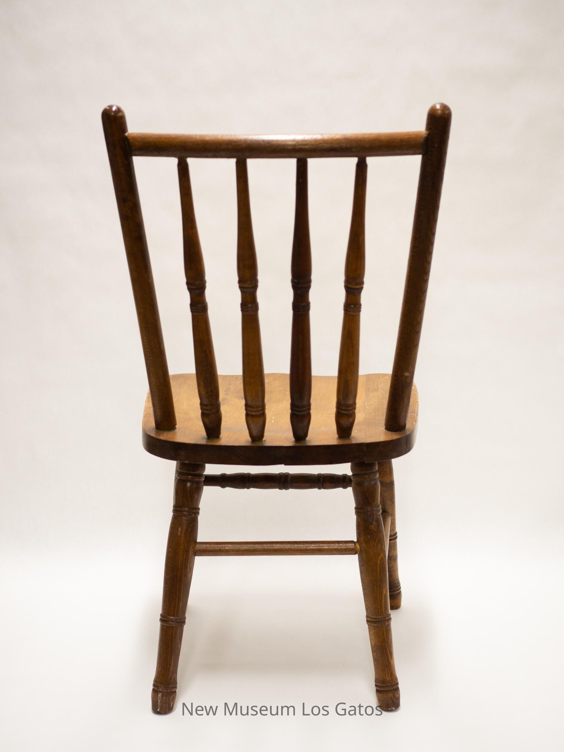 A small, wooden chair. The four legs have four sets of decorative bands throughout the leg. Each leg is connected to its neighbor by a small wooden dowel, except the front two legs, which are connected by a thicker, decorated wooden rod. The two back legs angle out slightly. The seat is relatively square in shape, and has a minor, intentional indentation in the center. The back consists of six vertical pieces of wood connected to a horizontal piece of wood at the top. The two outside pieces are smooth, and taller than the rest, while the four inside pieces are more tapered, and have three sets of decorative bands throughout.Collection