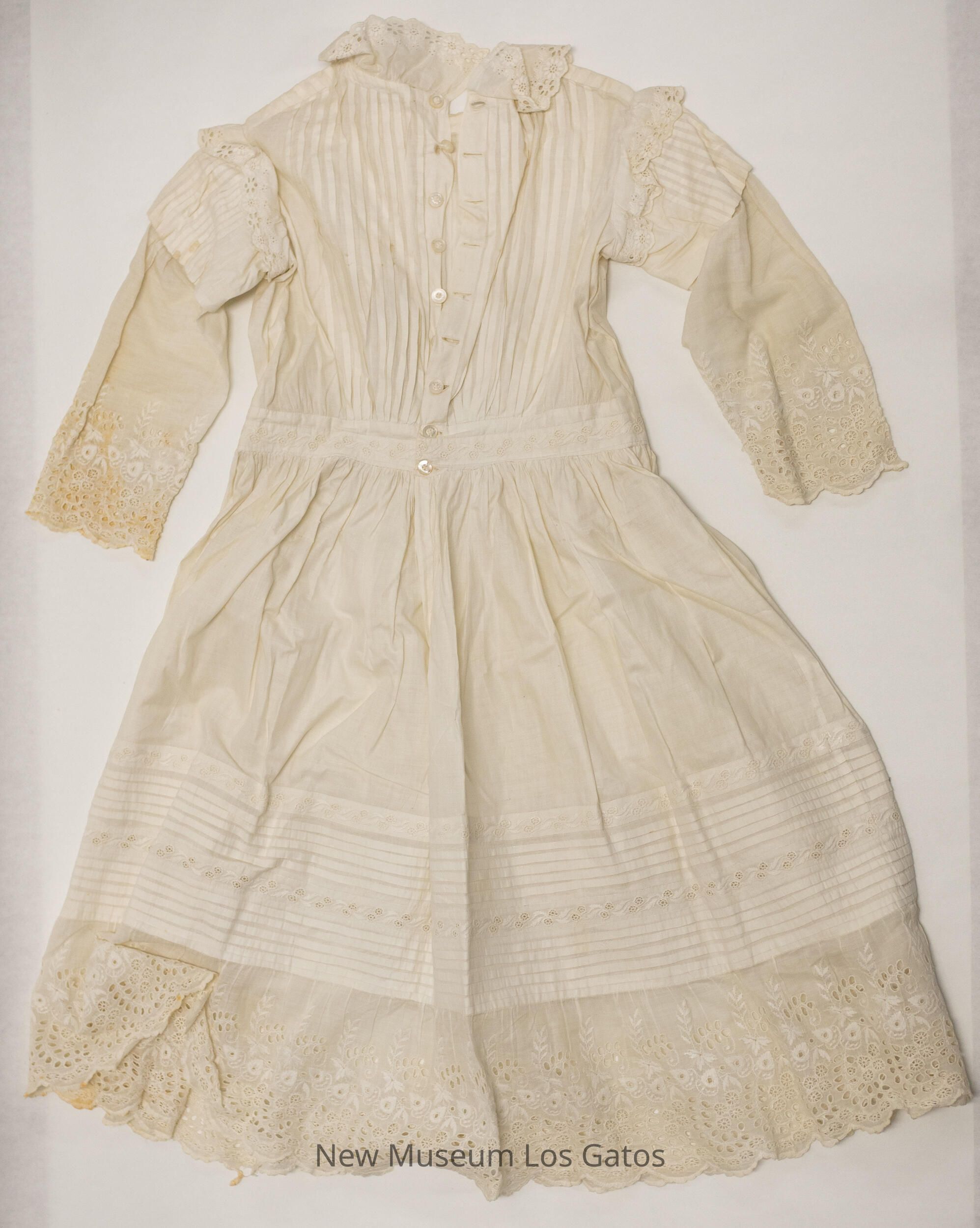 A small, white batiste dress. There is floral embroidery and eyelet detailing along the bottom of the dress, the bottom of the sleeves, the edge of the collar, and vertically along the shoulders. There are vertical, tucked stripe details on the bodice of the dress, and horizontally along the bottom section of the dress. There is also a decorative embroidered pattern of stars inside circles, with feathers that can be found on three horizontal bands: one at the waist, and the other two with the horizontal tucked stripes. The dress opens up at the back, and closes with nine small, white iridescent buttons.Collection