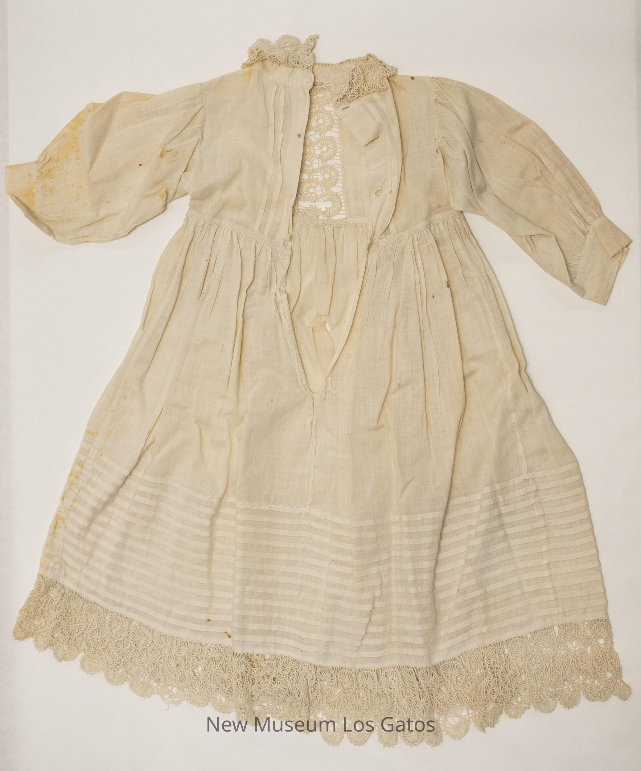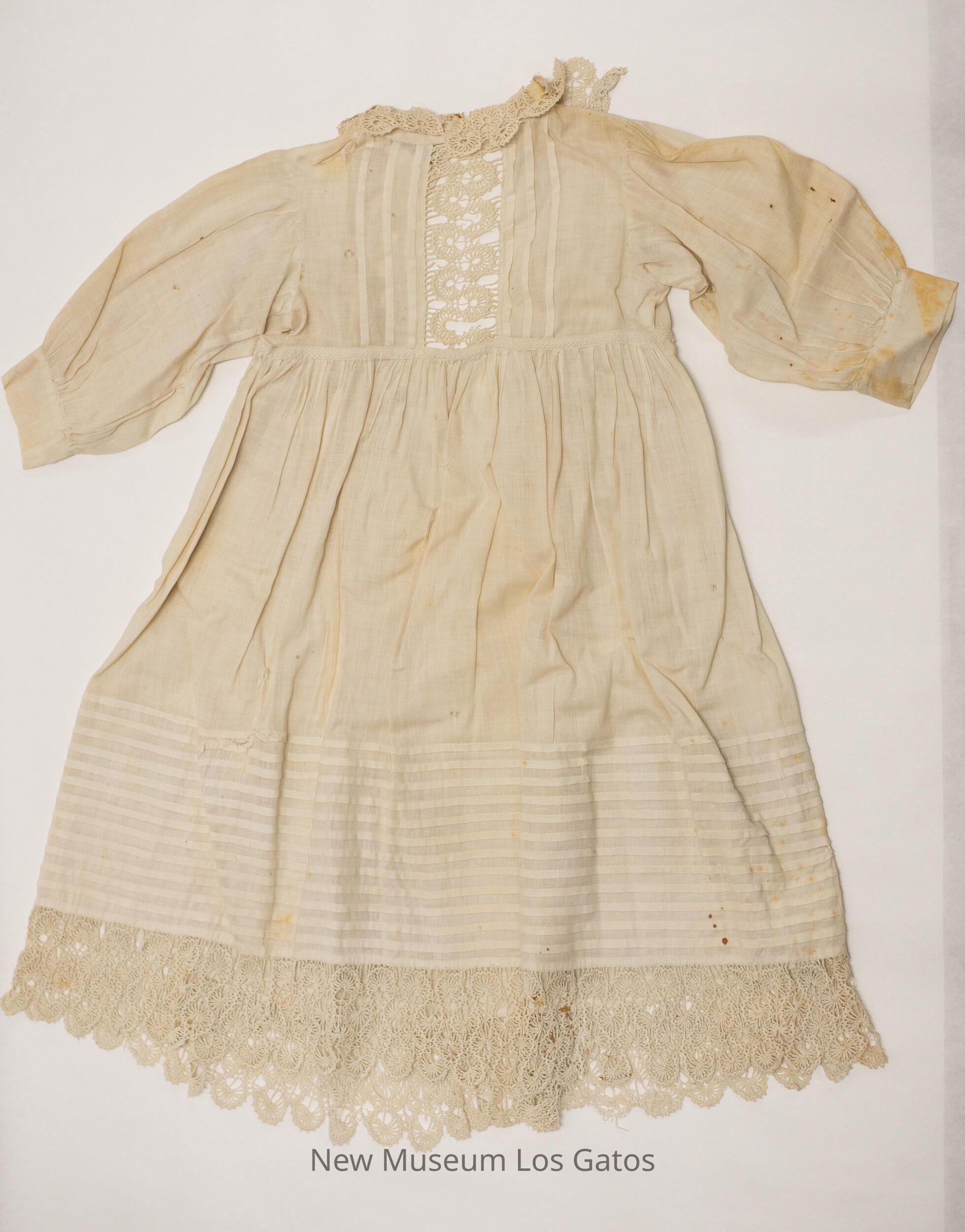A small, white, long-sleeve linen dress. There is decorative lace along the hem, in the center of the chest, and as a collar along the neckline. There is a large band of horizontal stripes towards the bottom of the skirt, and a decorative embroidered stripe along the waist. The dress opens in the back, and would close with three buttons, all of which are missing.Collection