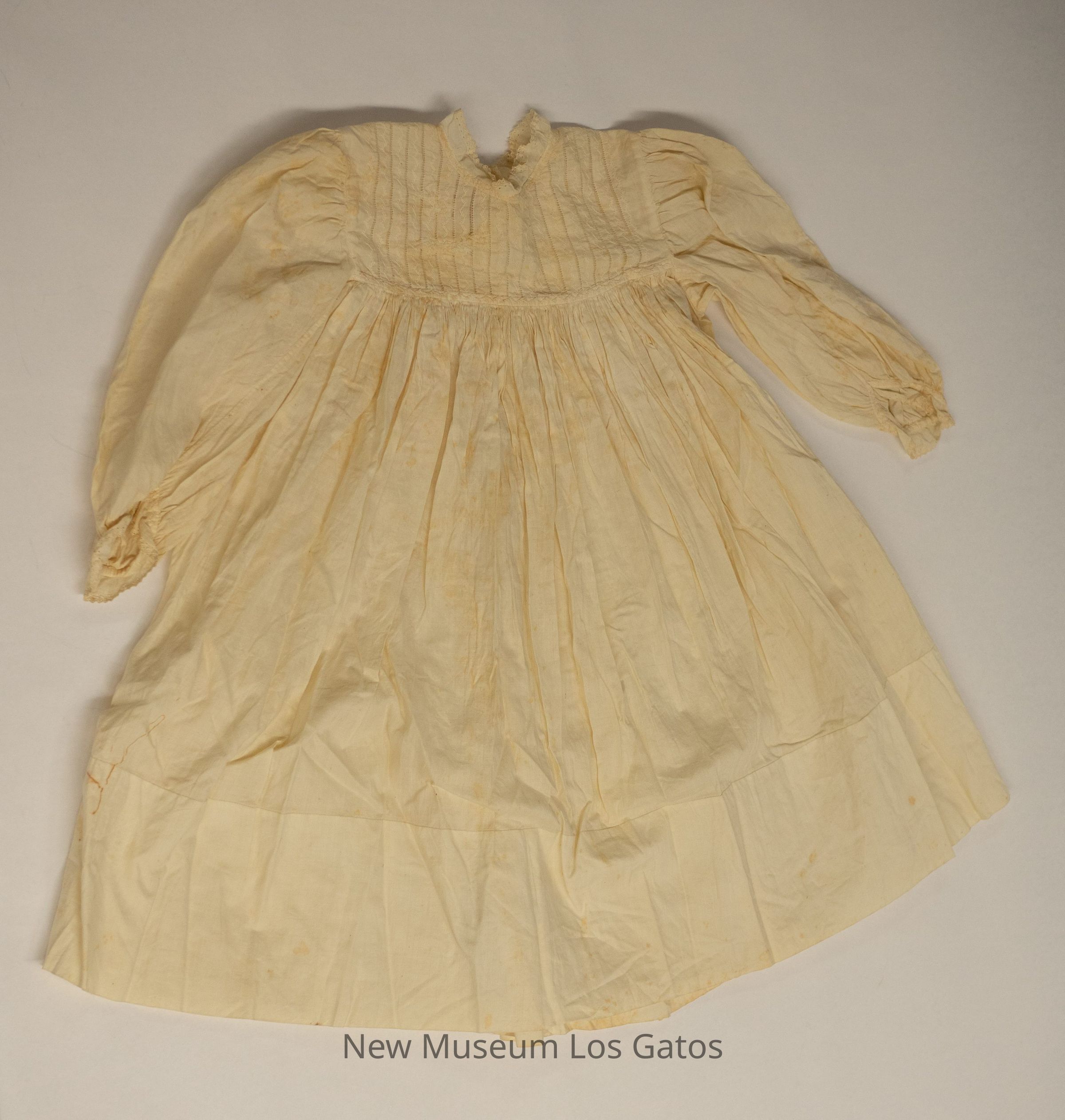 A small, long-sleeved, cream-colored dress. The majority of the dress is plain, with decorative vertical hem stitched embroidered fabric on the yoke and upper back of the dress. There is decorative eyelet detailing along the sleeve cuffs, as well as the neckline. The sleeves and waistline are gathered. The dress opens in the upper back, and closes with three small white buttons.Collection