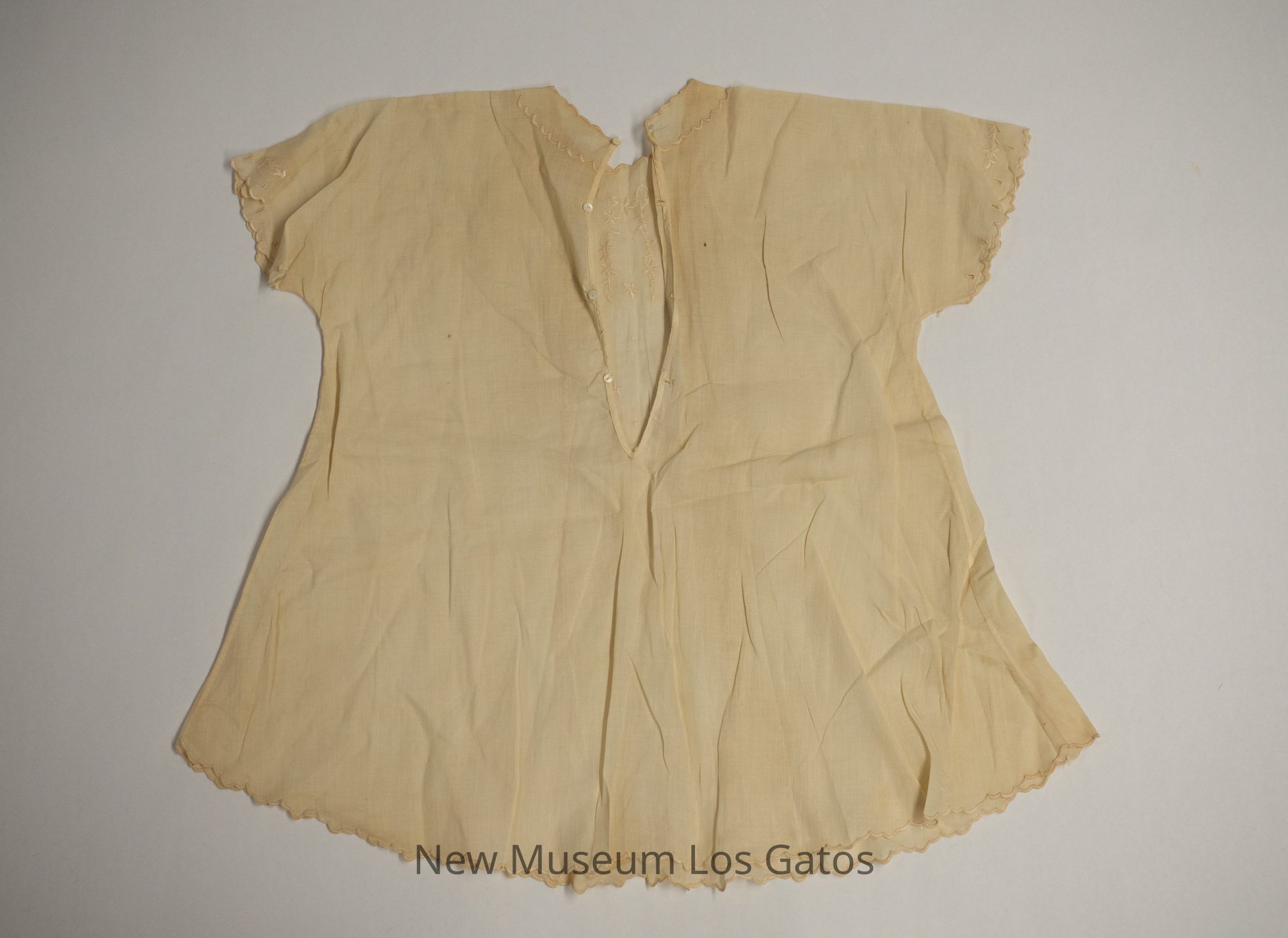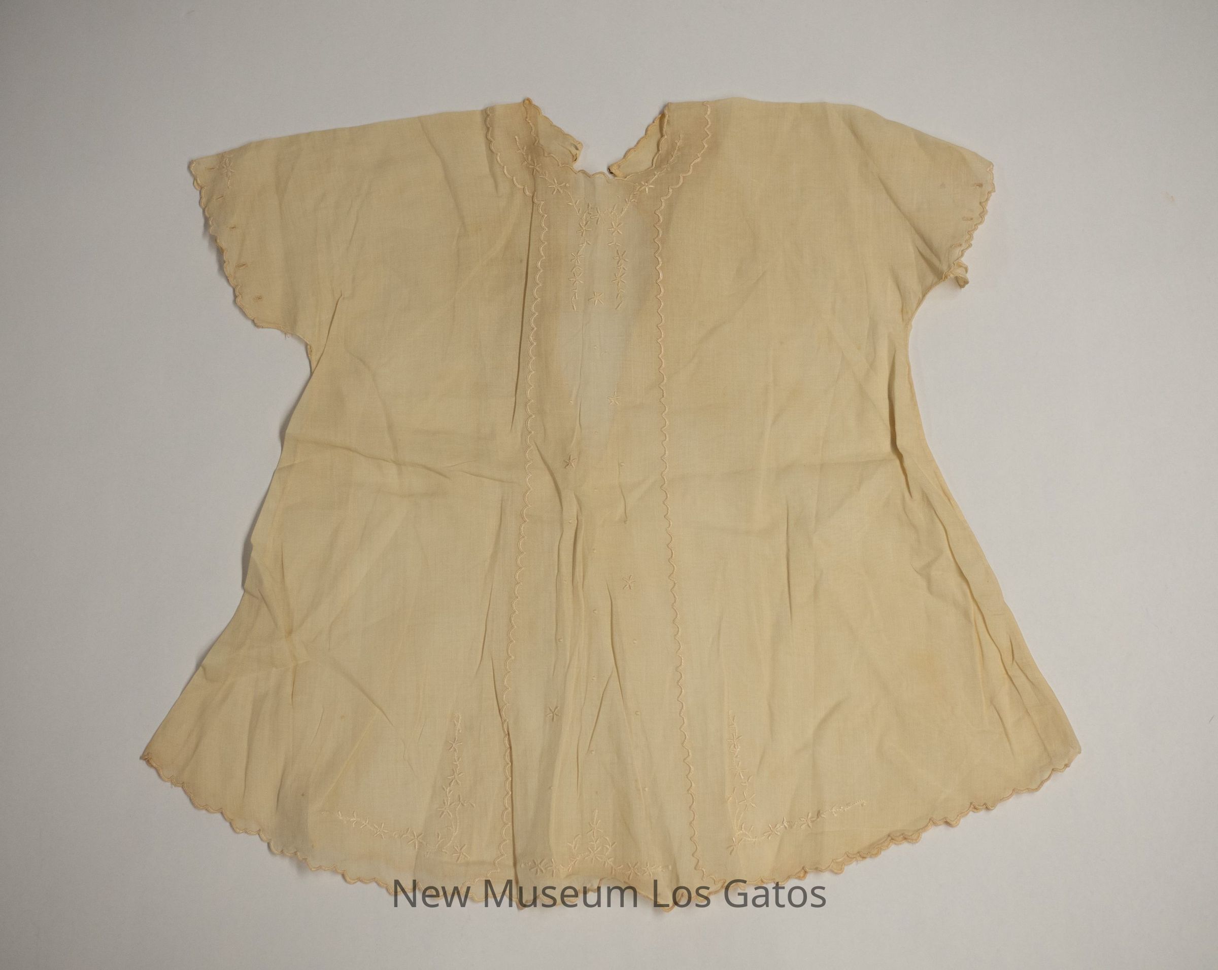 A small, white, short-sleeved linen dress. The neckline, sleeve edges, and hem have embroidered scalloped detailing, with additional embroidered scalloped detailing down the front of the dress. There is decorative floral embroidery along the neckline, at the chest, along the hem, and on the sleeves. The dress opens at the back, and closes with four small, white iridescent buttons.Collection
