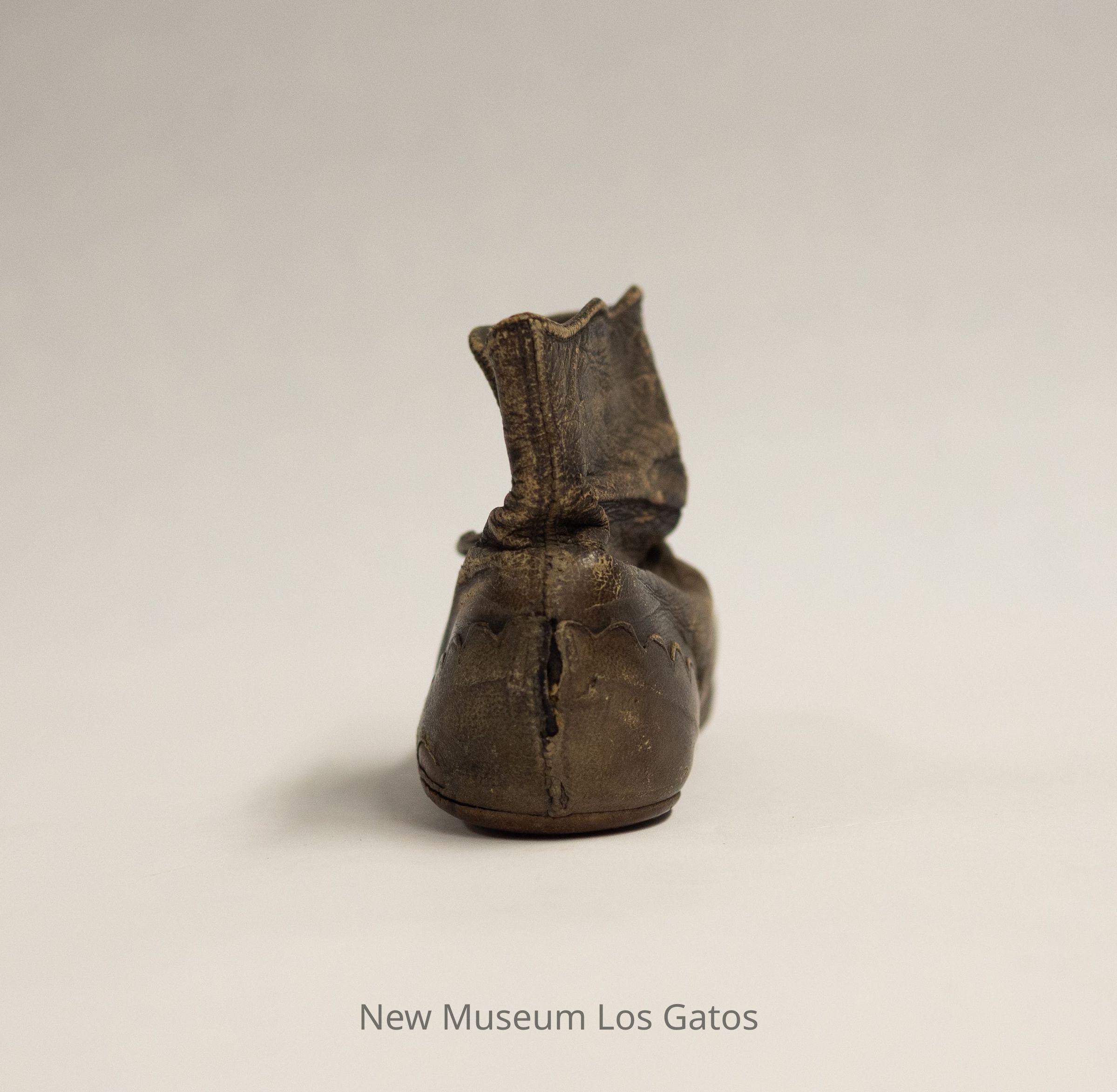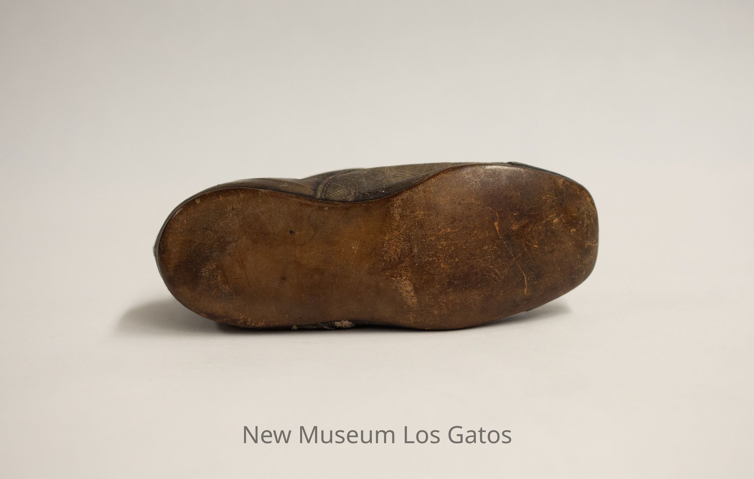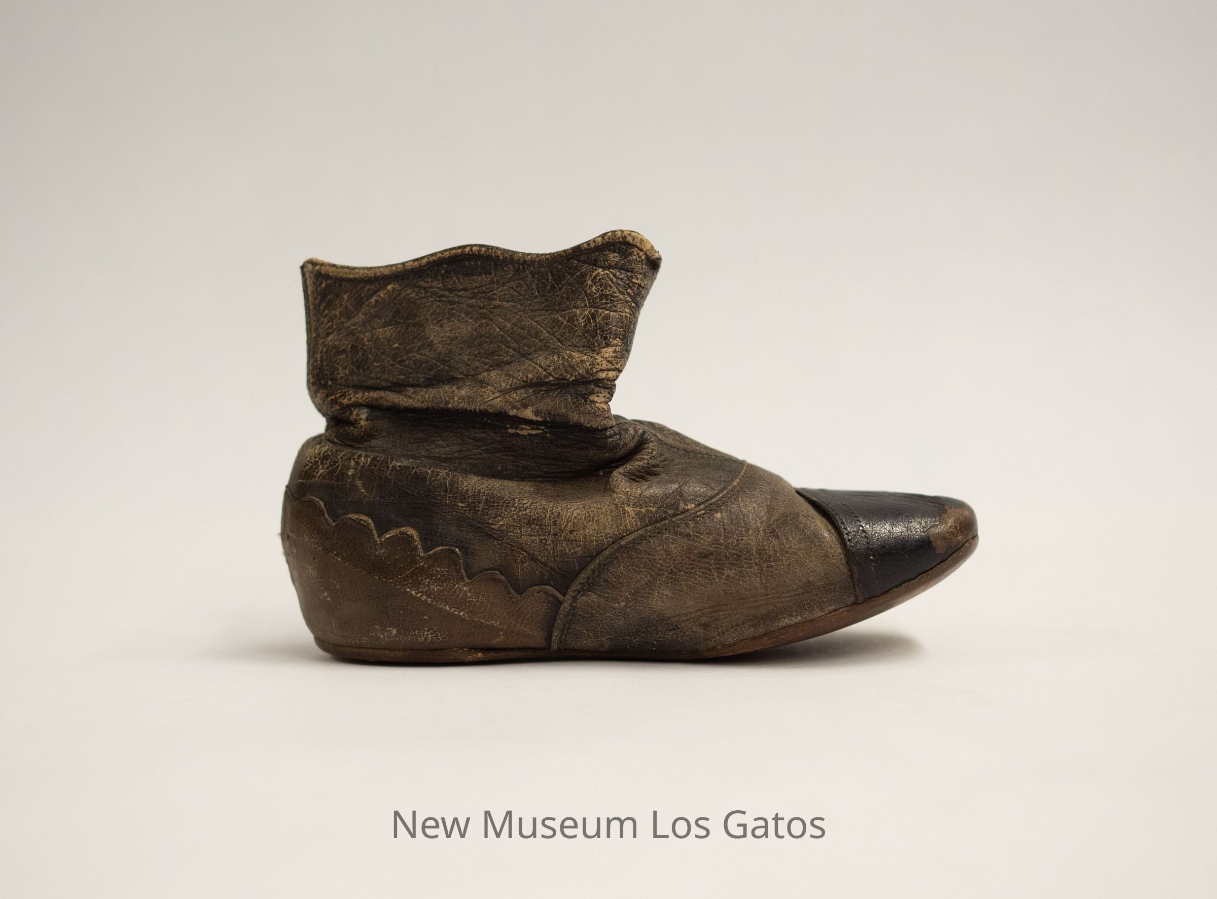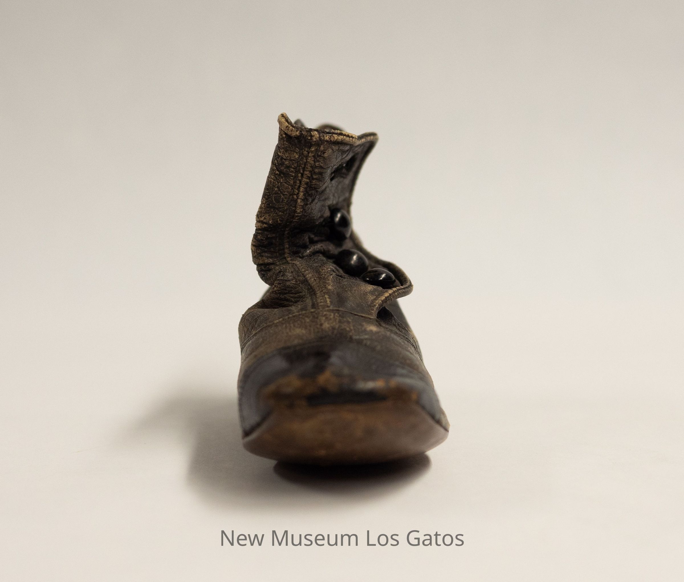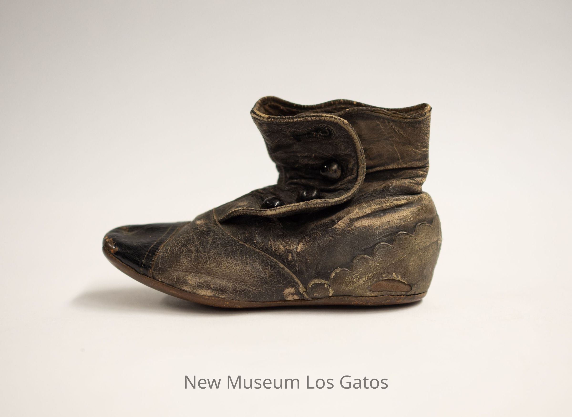 A single small, black leather children's boot, for the left foot. The boot has three black buttons running up the outer side, for opening and closing the boot.Collection