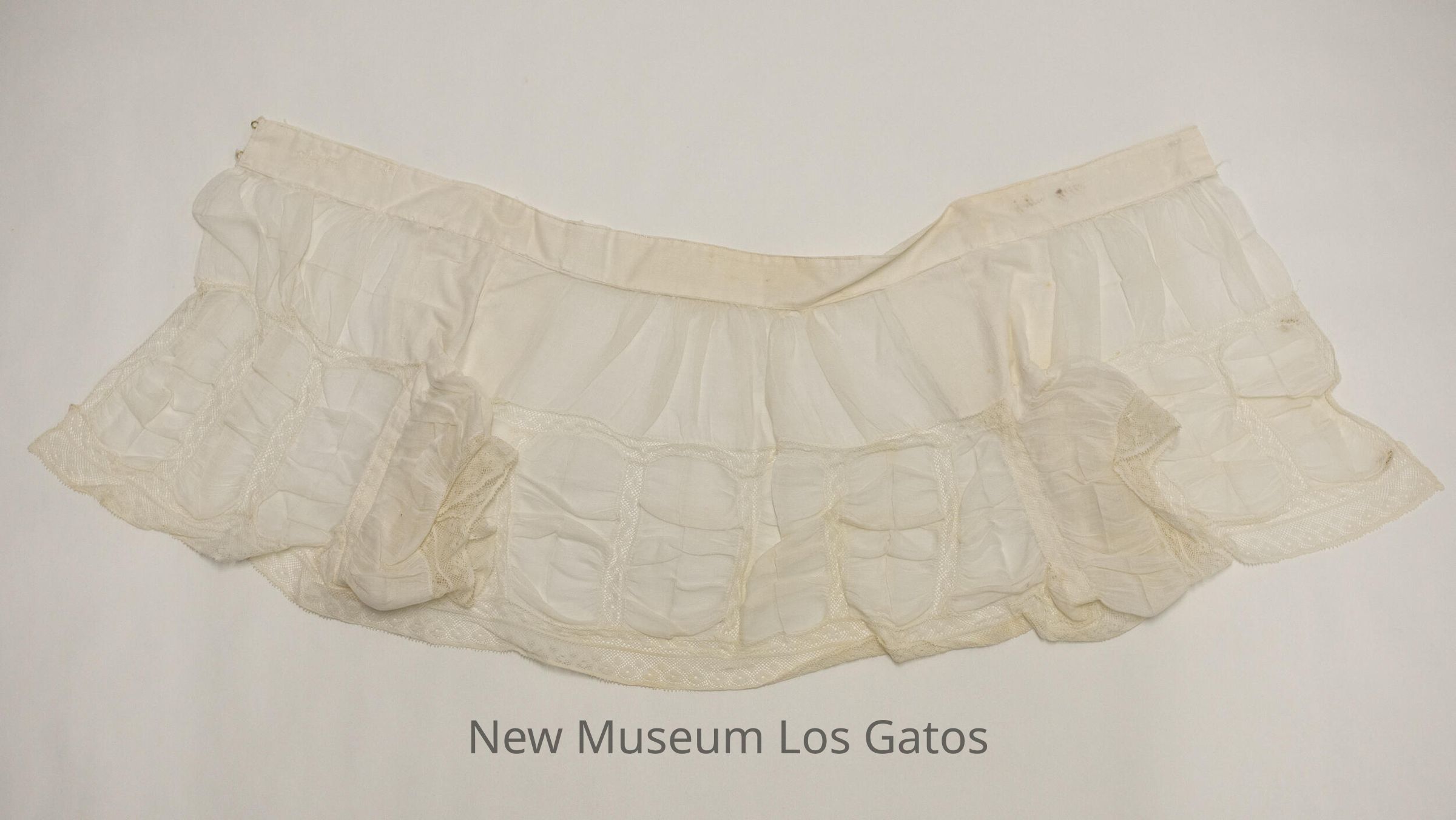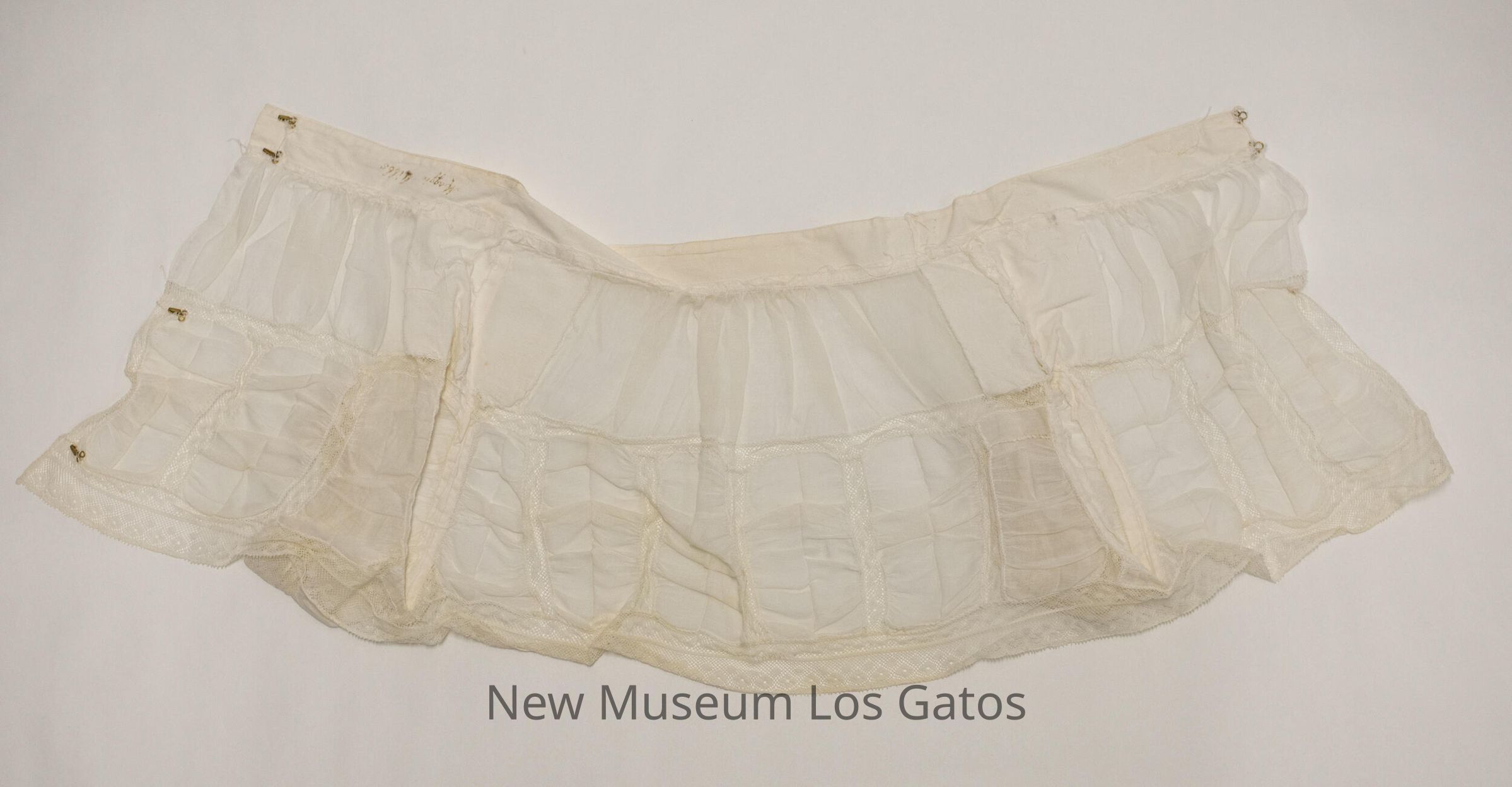 A small, white batiste "sun top." There is lace along the bottom edge of the shirt and the sleeves, and vertical lace stripes throughout the bottom portion of the top, with ruching in between the lace. The top opens completely at the back, and closes with two golden hook and eye clasps at the top, and two golden hook and fabric eye clasps farther down.Collection
