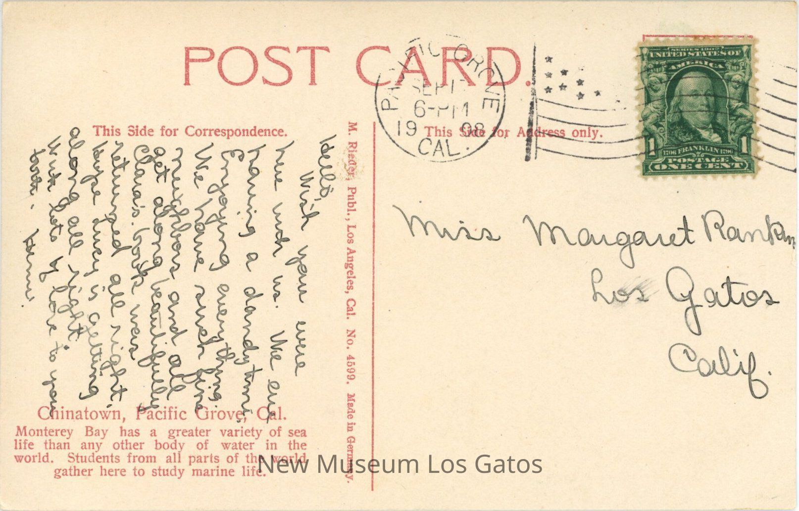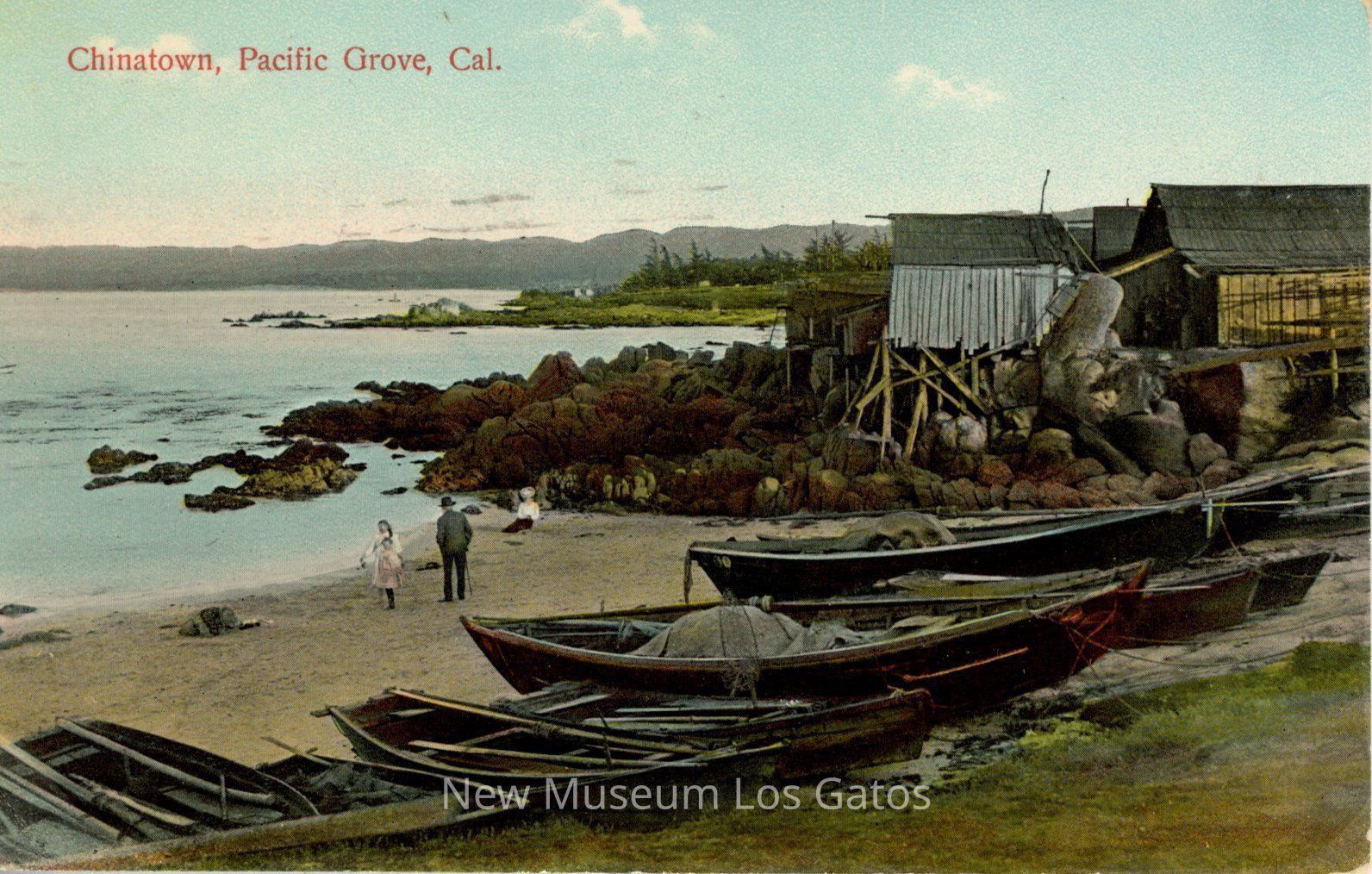 A postcard with a colorized illustration of the Chinatown in Pacific Grove, featuring boats lined up along the beach, with structures in the background and four people standing on the beach. The postcard has been mailed, and includes an addressee, a stamp, and a message written in pen.Subject Place
