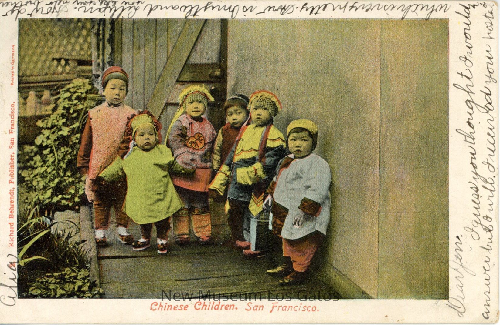 A postcard featuring a colorized photograph of young Chinese children, who are dressed in traditional clothing.Subject Place