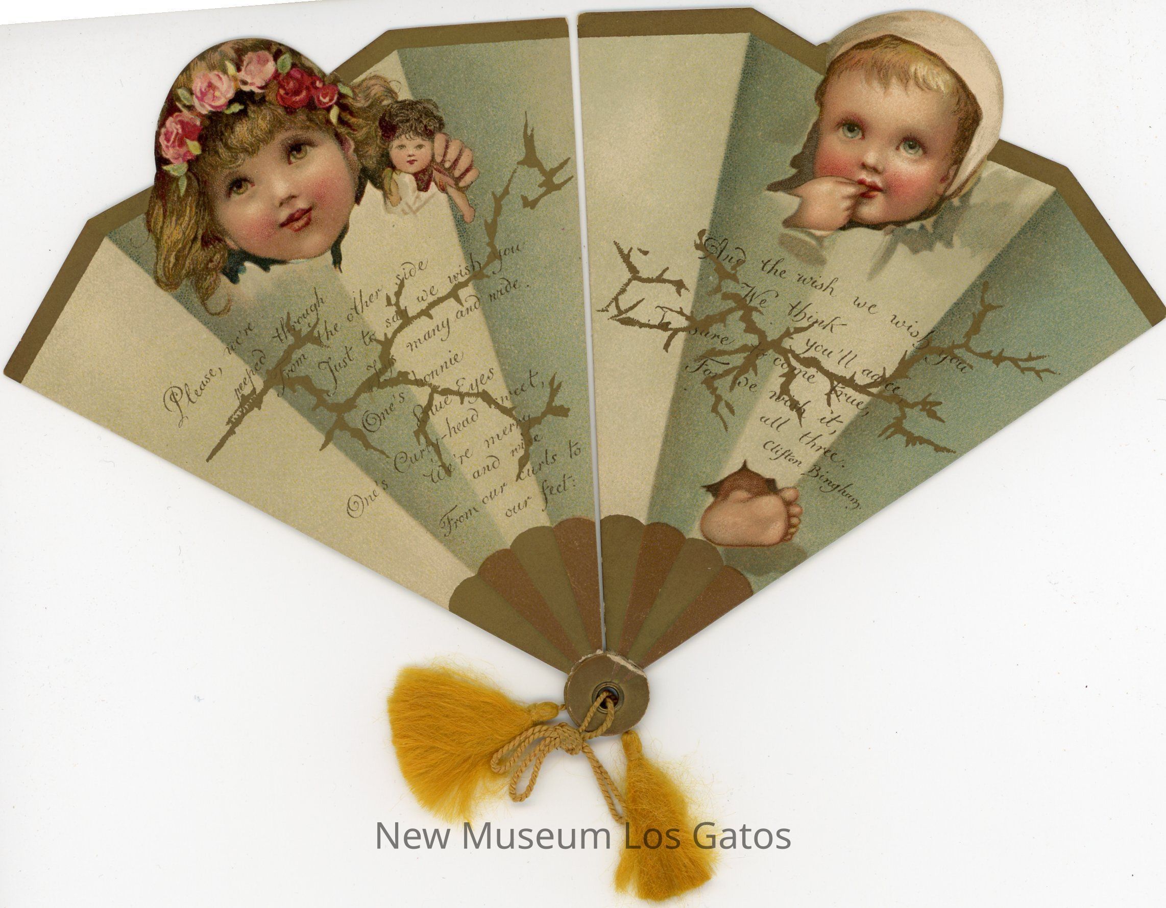 A Christmas card, consisting of two triangular pieces that are held together by a gold string through gold metal grommets at the point of the triangles. The front of the card feature striped sections alternating in color, with a sentiment by Clifton Bingham printed across both pieces. At the top of one piece is a color illustration of a girl with a flower crown, holding a doll, while the other piece has a color illustration of a baby.Collection