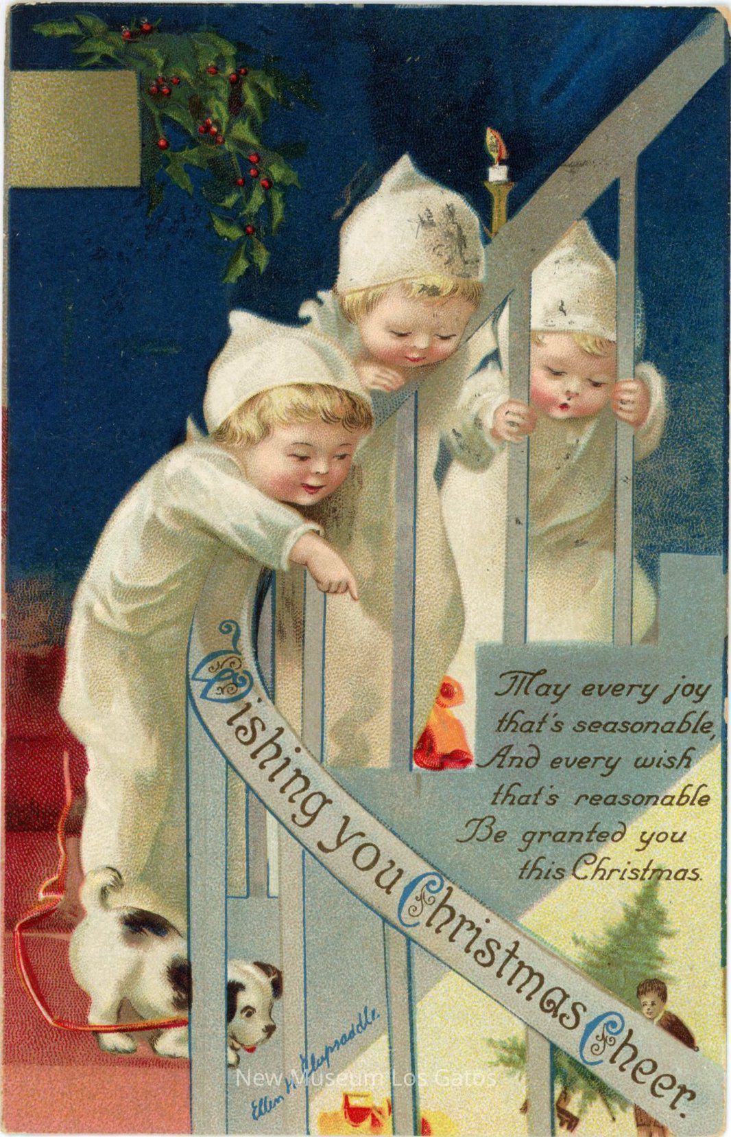 A postcard featuring a color illustration of three children in white pajamas and small black and white dog looking over the railing of a staircase. The postcard has been mailed, and includes an addressee, a stamp, and a message written in pen.Collection