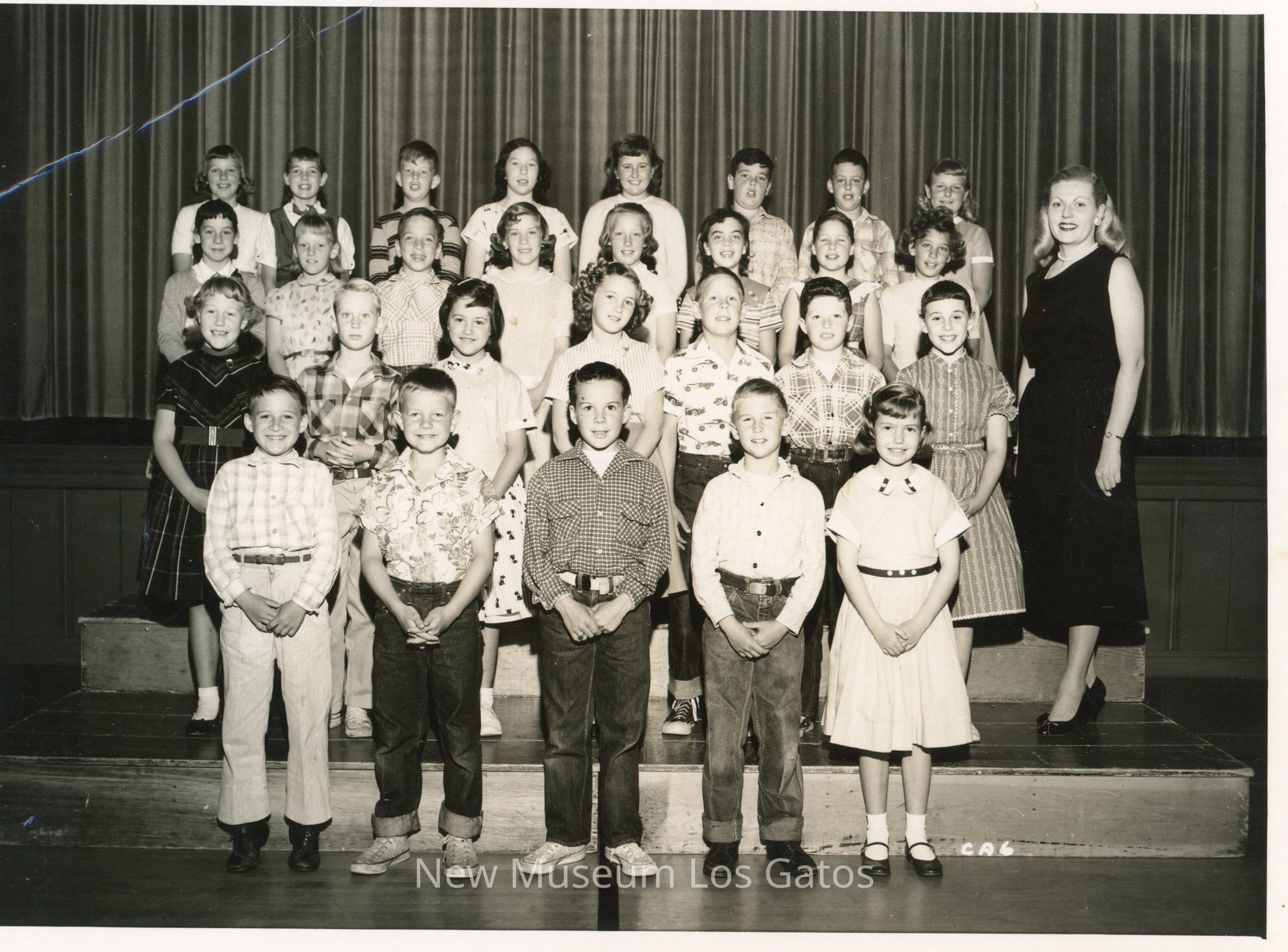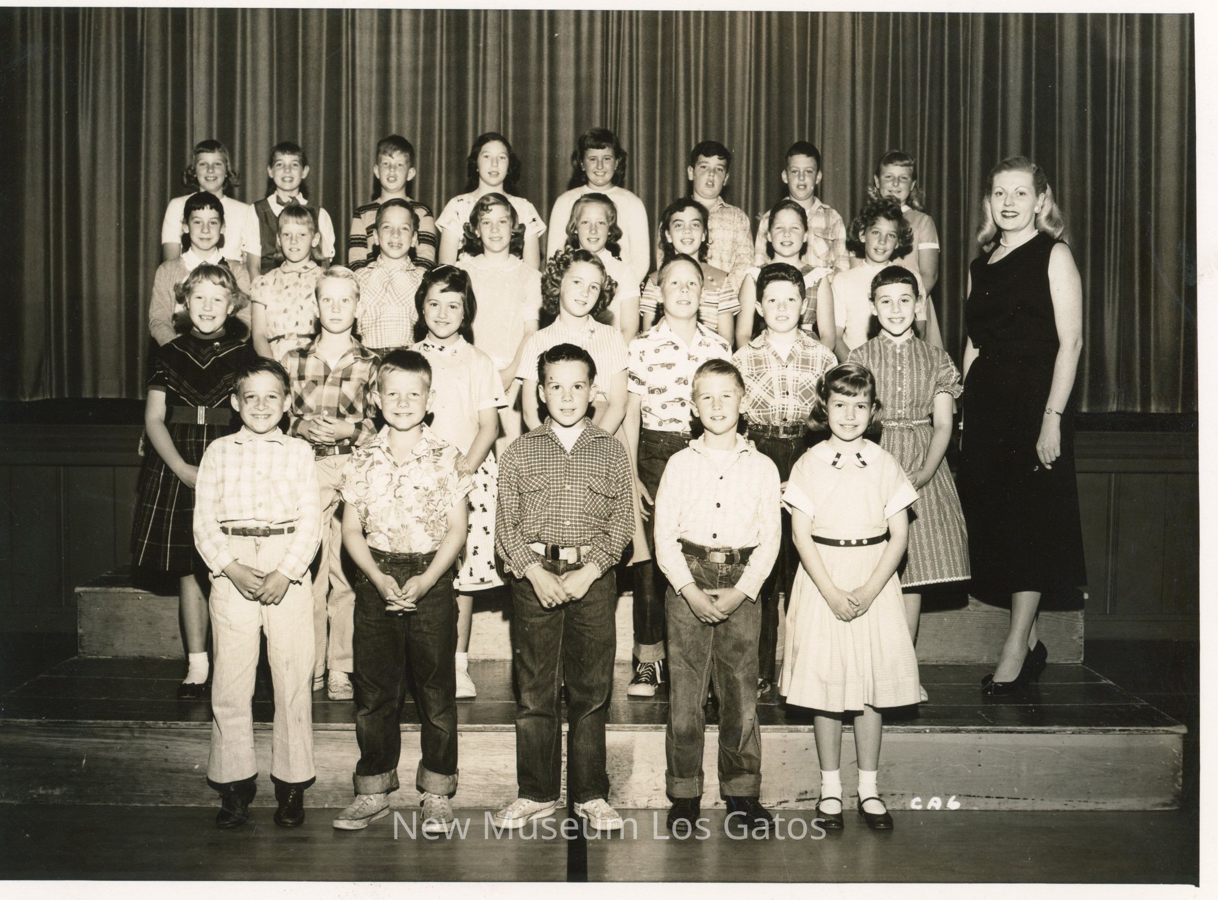Two photographs of a class of elementary students and their teacher. The photo is black and white, and glossy. The students are standing on a steps, in front of a curtain.Photograph Details