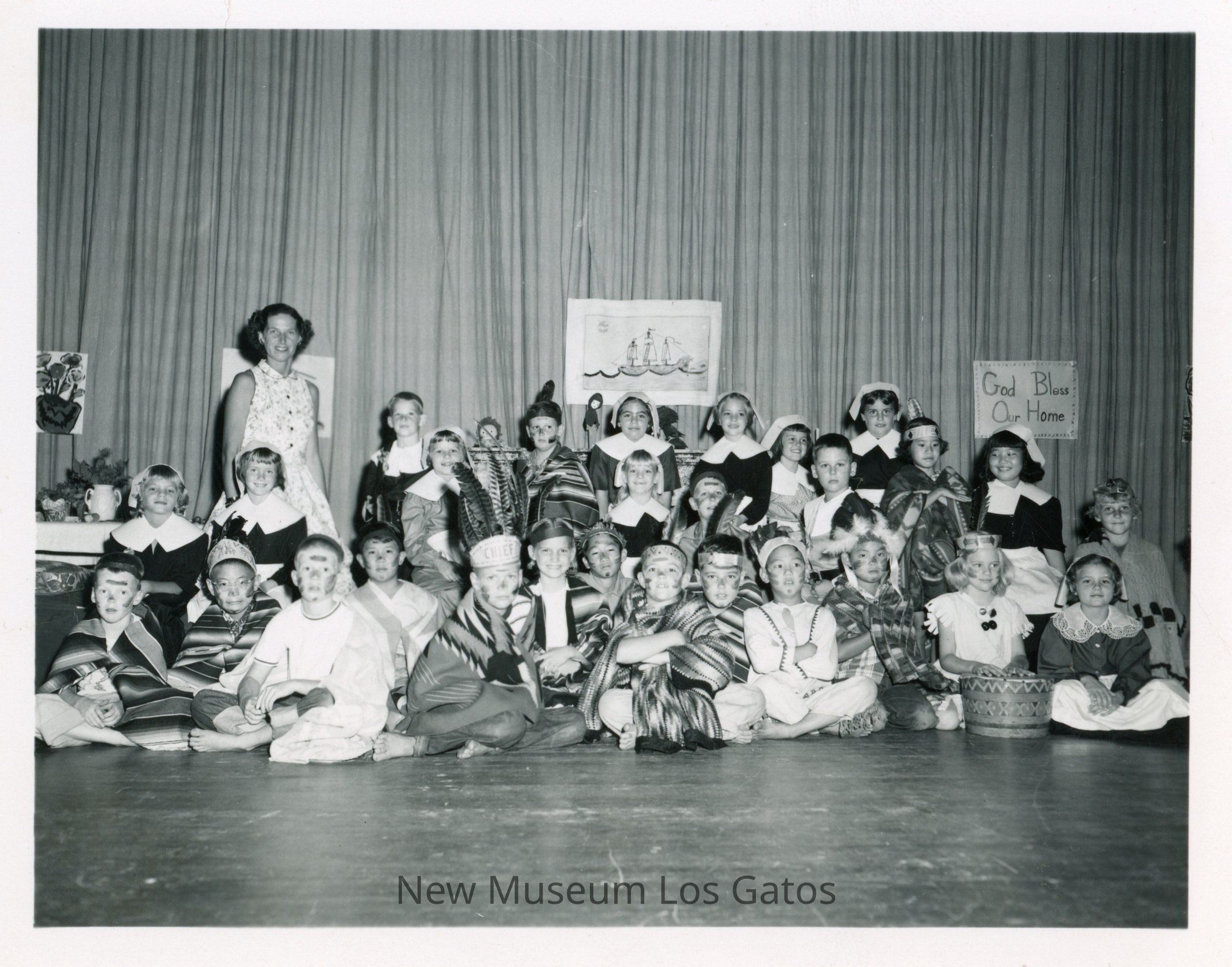Small black and white photograph of a third-grade class in their costumes for a Thanksgiving play. The students are on a stage, in front of a curtain, in costume.